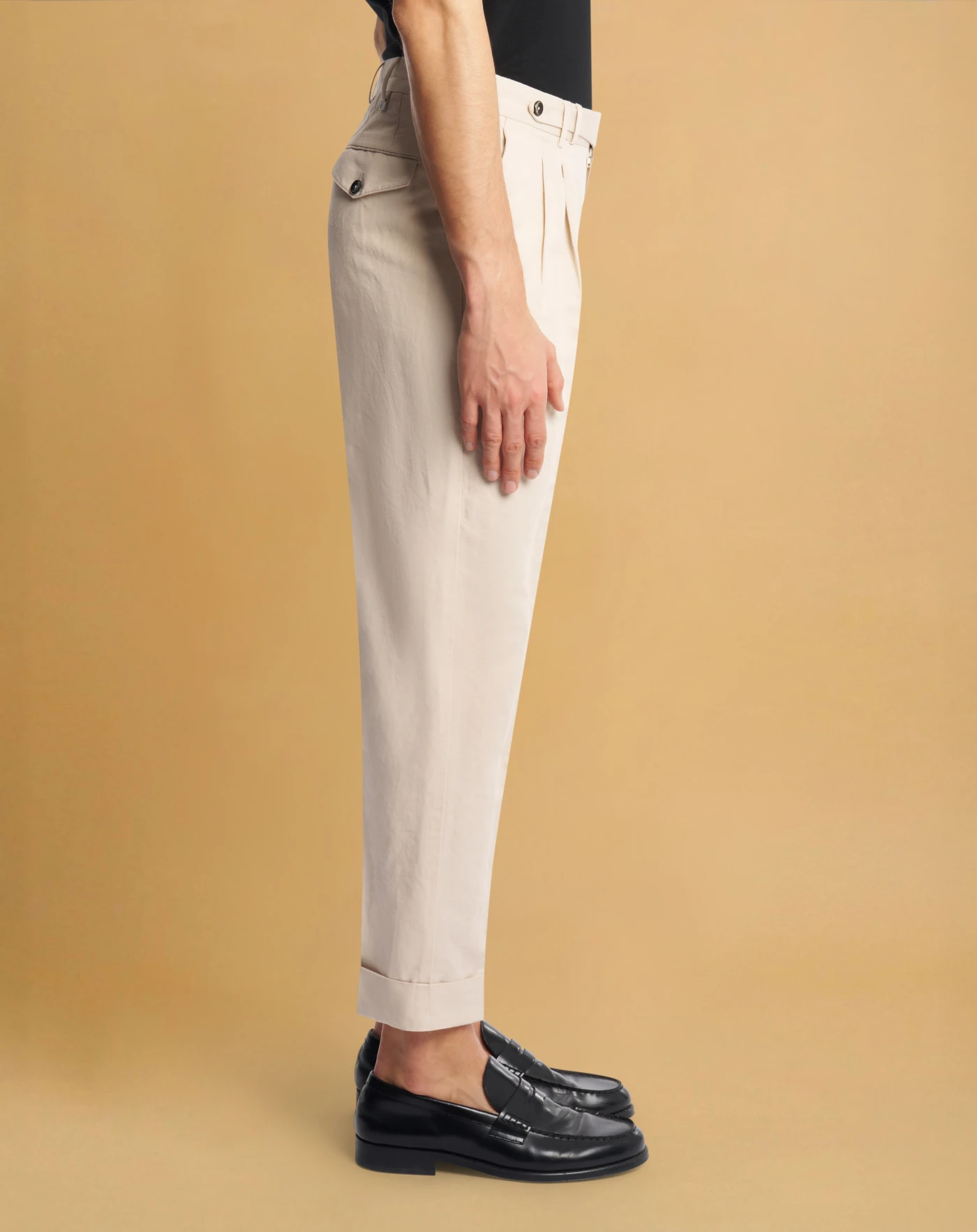 Trousers in washedcotton and linen twill, a lightweight fabric featuring a fine diagonal weave that adds structure while maintaining a fresh, natural finish.With two front pleats and turn-ups, in cream white, they are perfect for elegant and relaxed seasonal looks.