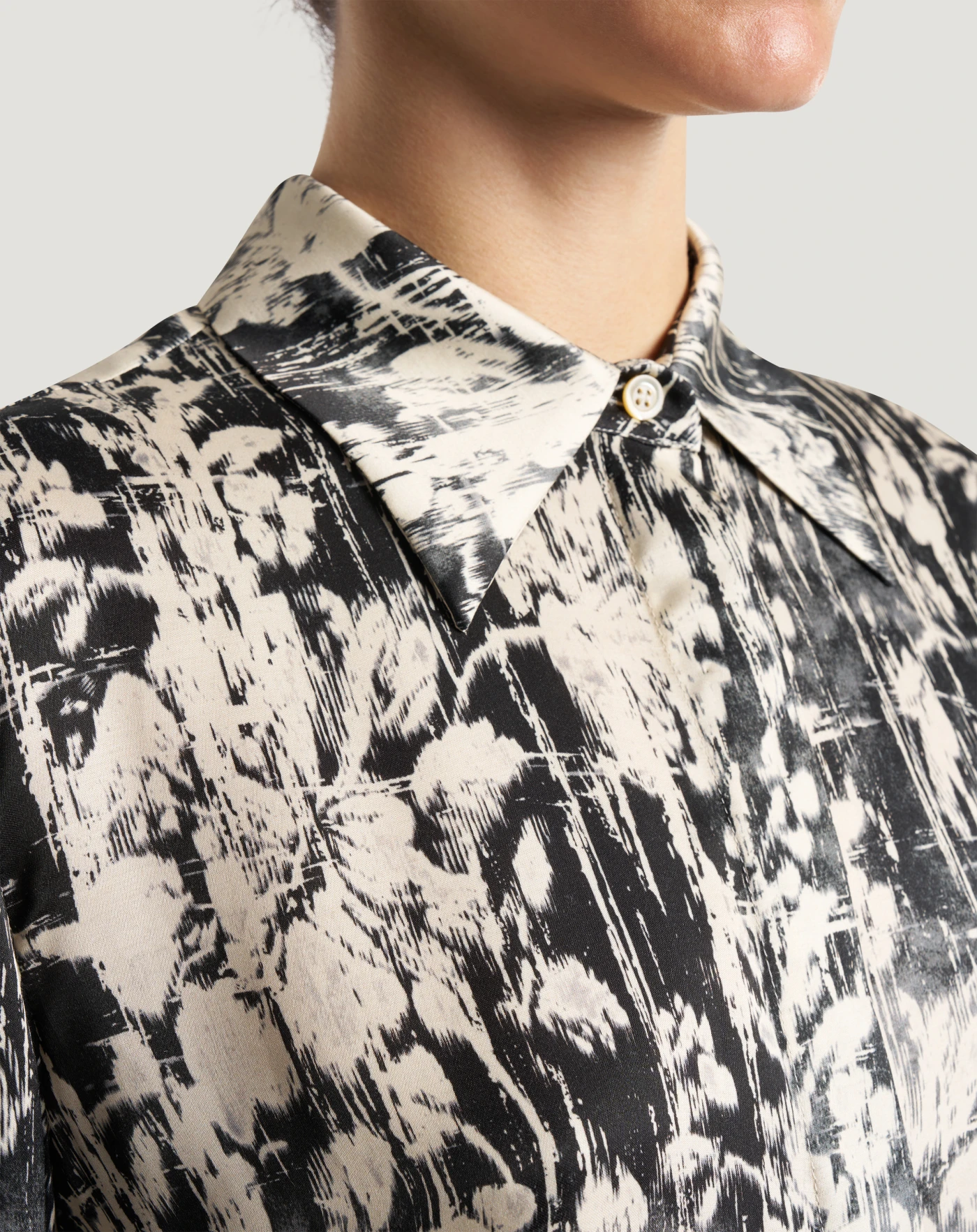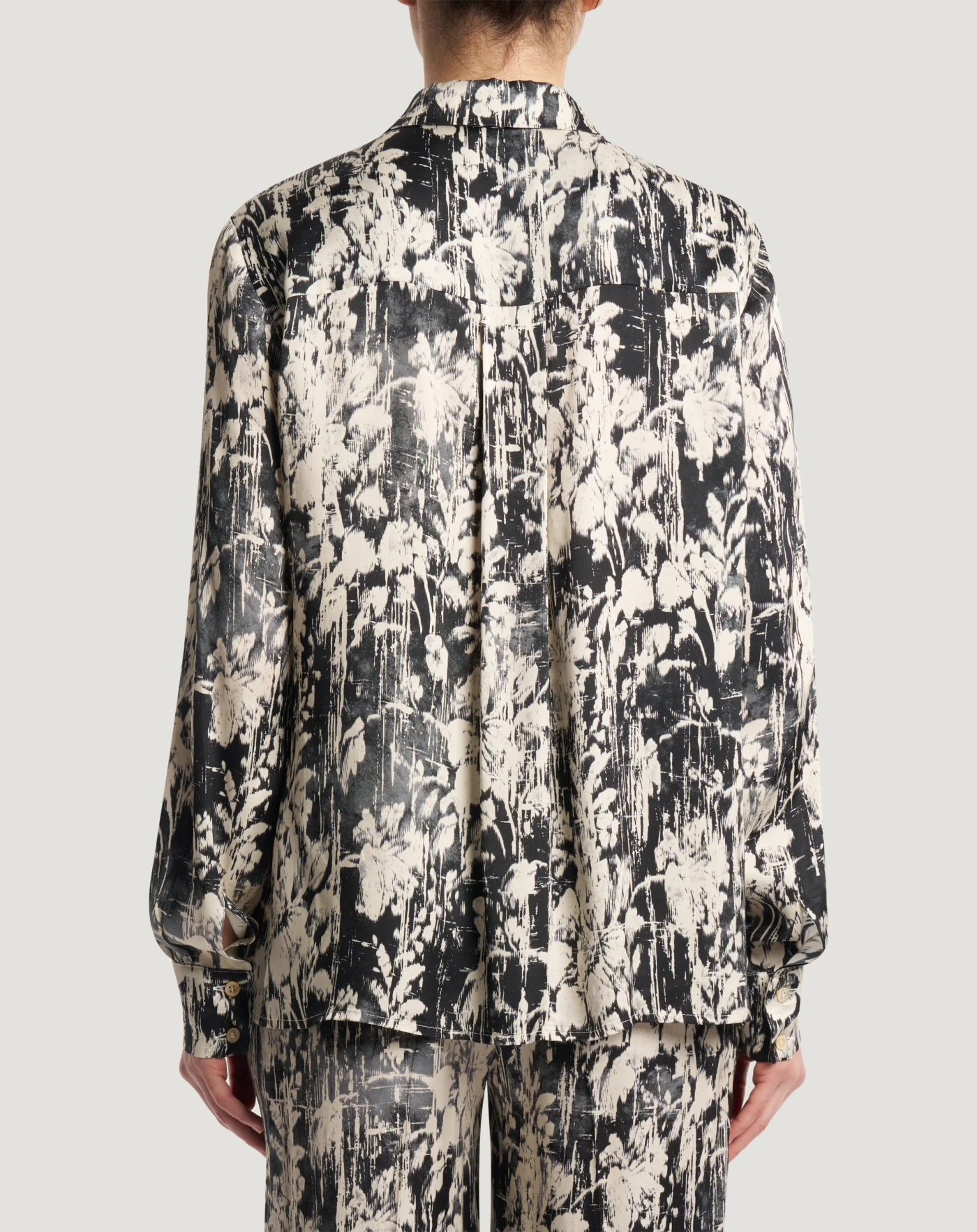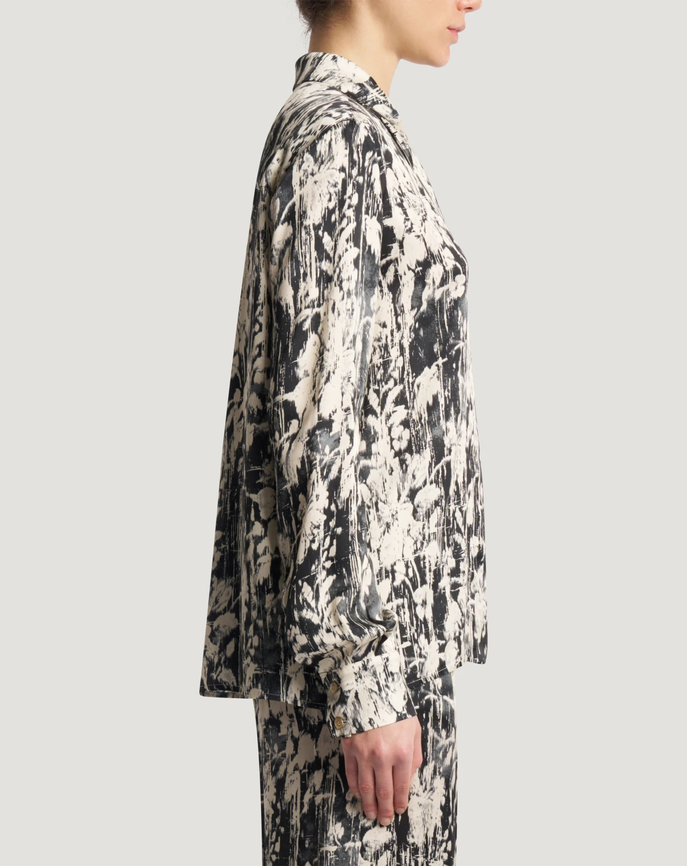 Camicia in satin stretch, un tessuto in raso morbido e scorrevole, dalla superficie liscia e leggermente lucida, con stampa esclusiva. Crea un total look grafico abbinandola ai pantaloni in coordinato.