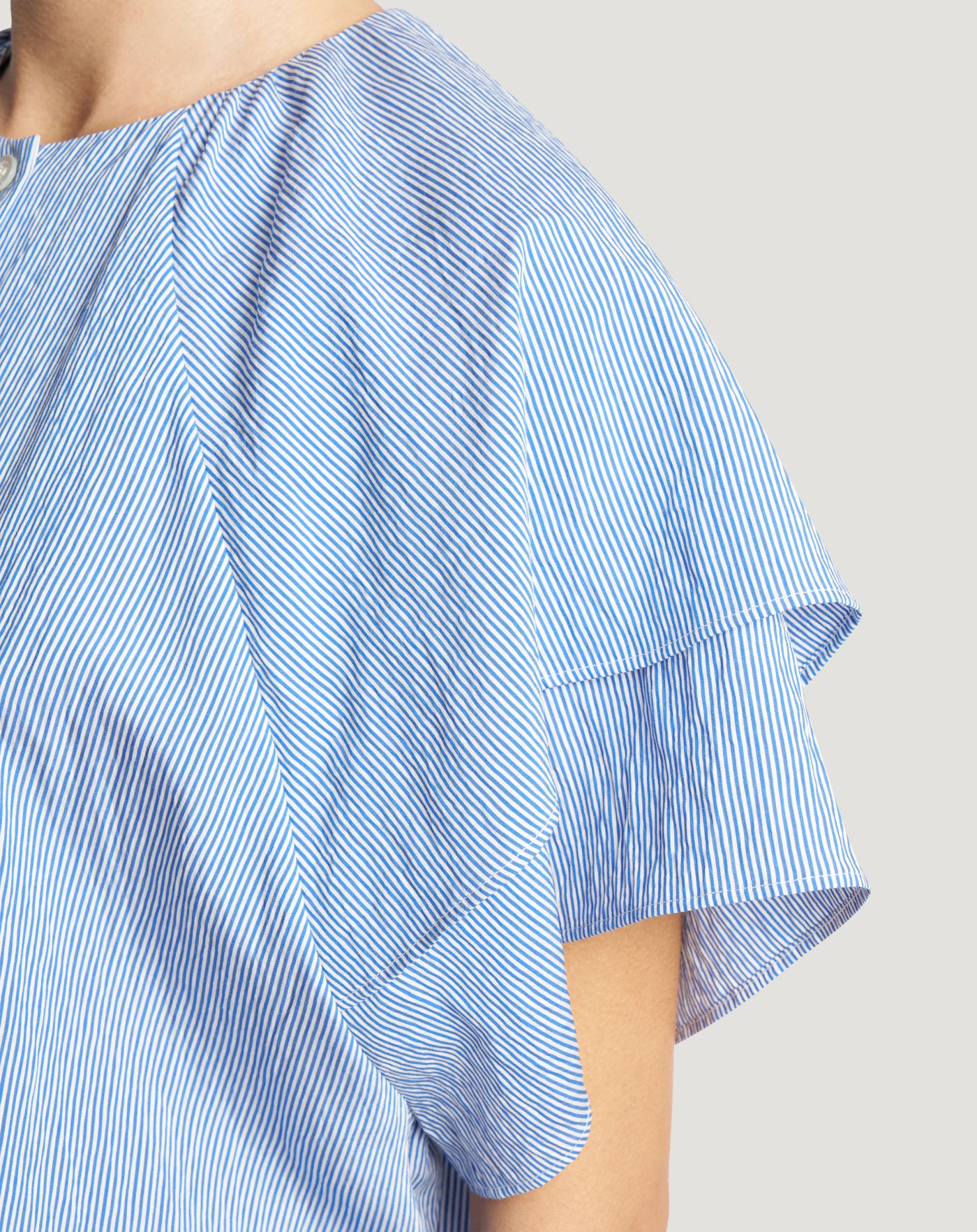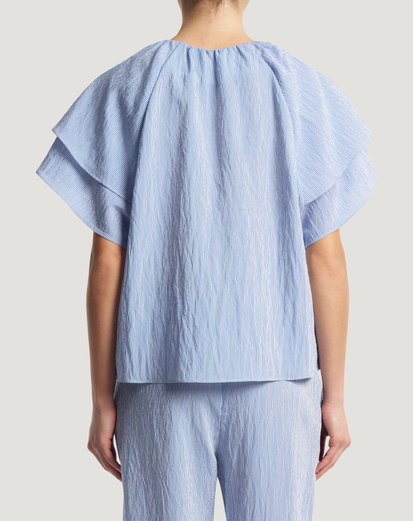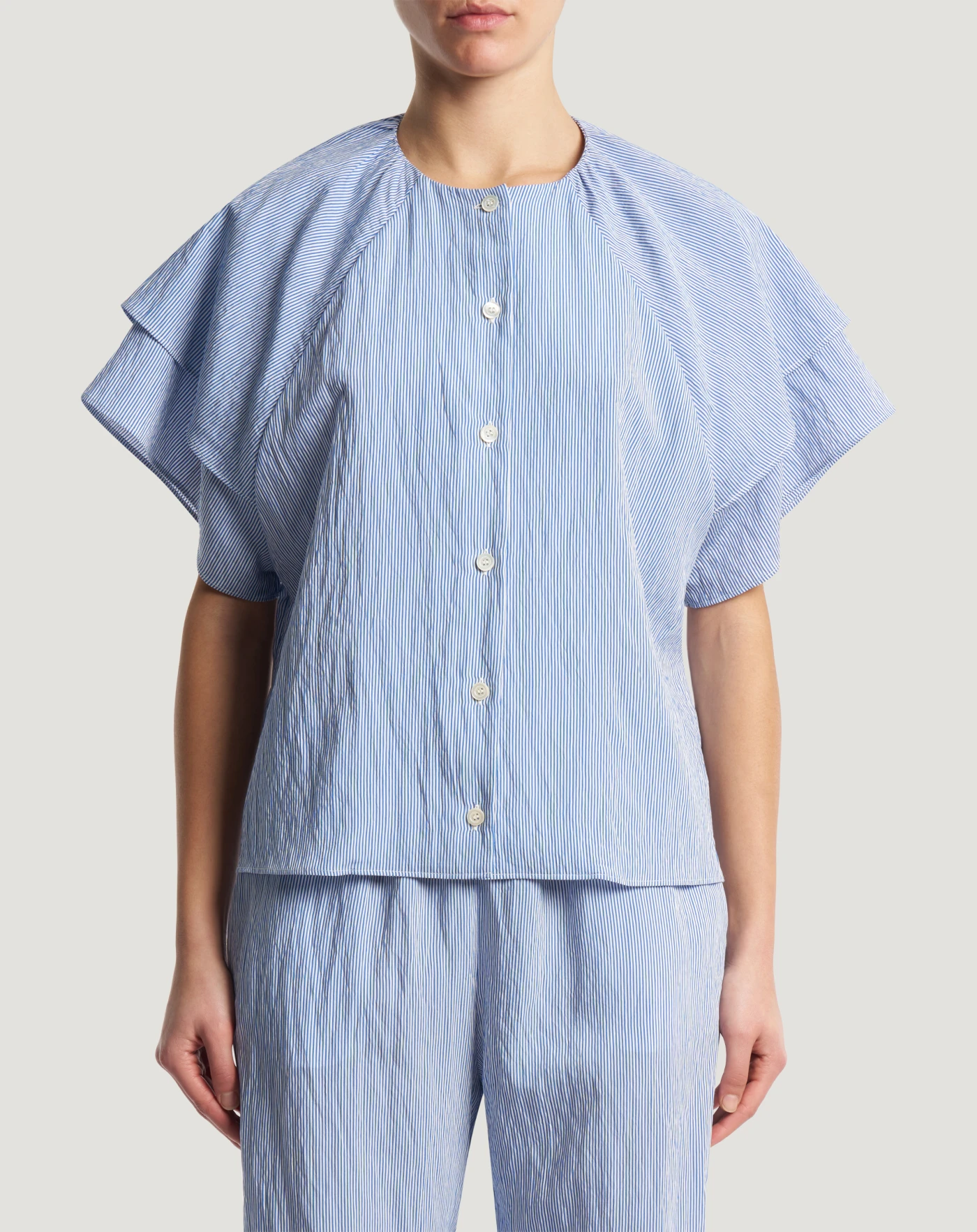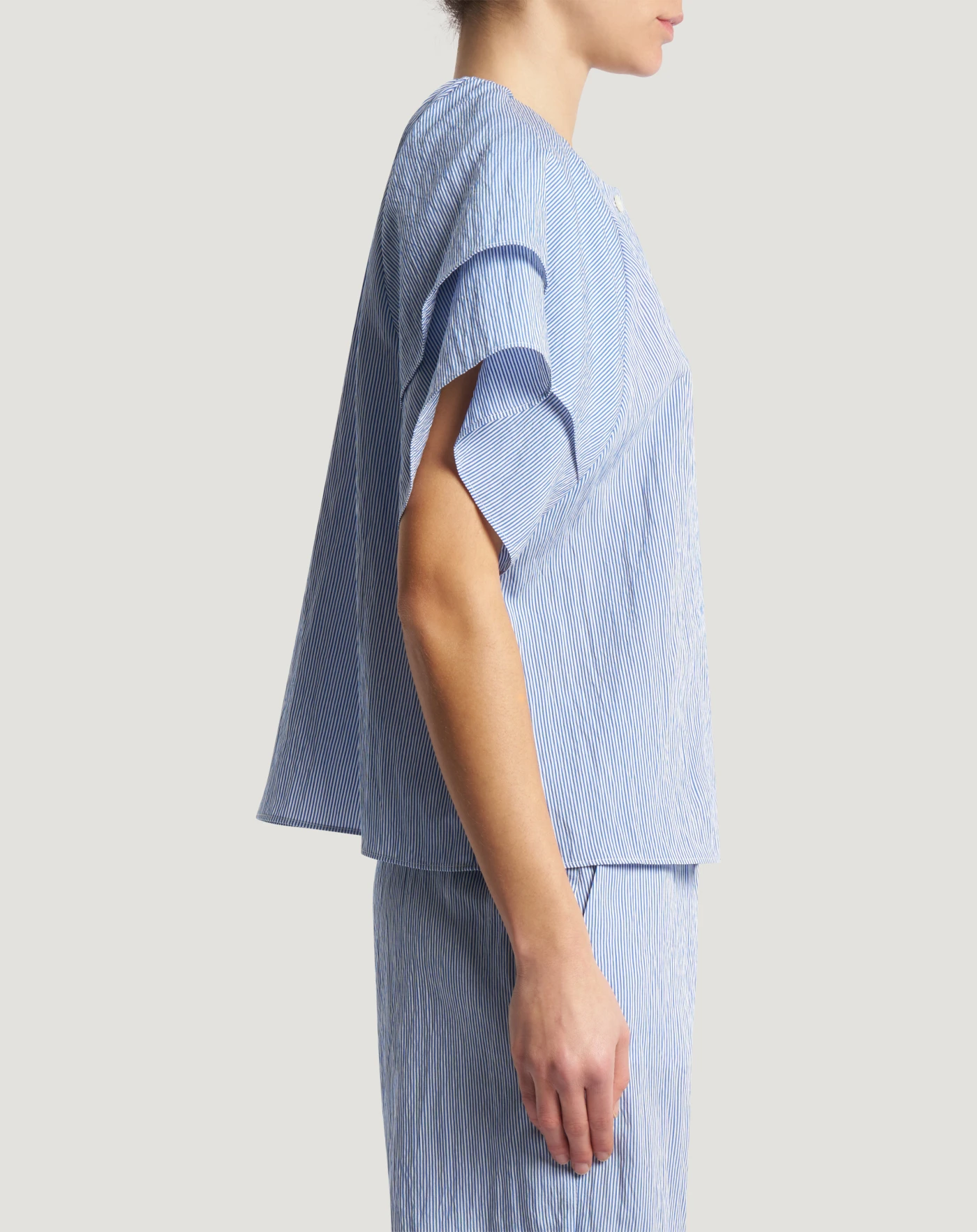 Camicia in tessuto leggero e traspirante di viscosa, lavorato con la tipica costruzione fil-à-fil che crea un effetto ottico delicato e raffinato. La costruzione femminile delle maniche rende il modello perfetto per le occasioni speciali, anche in abbinamento ai pantaloni in coordinato.