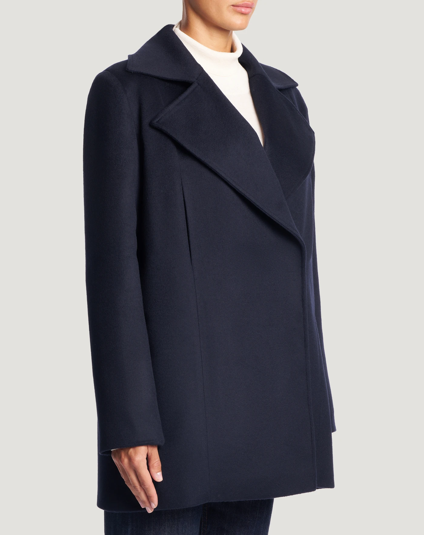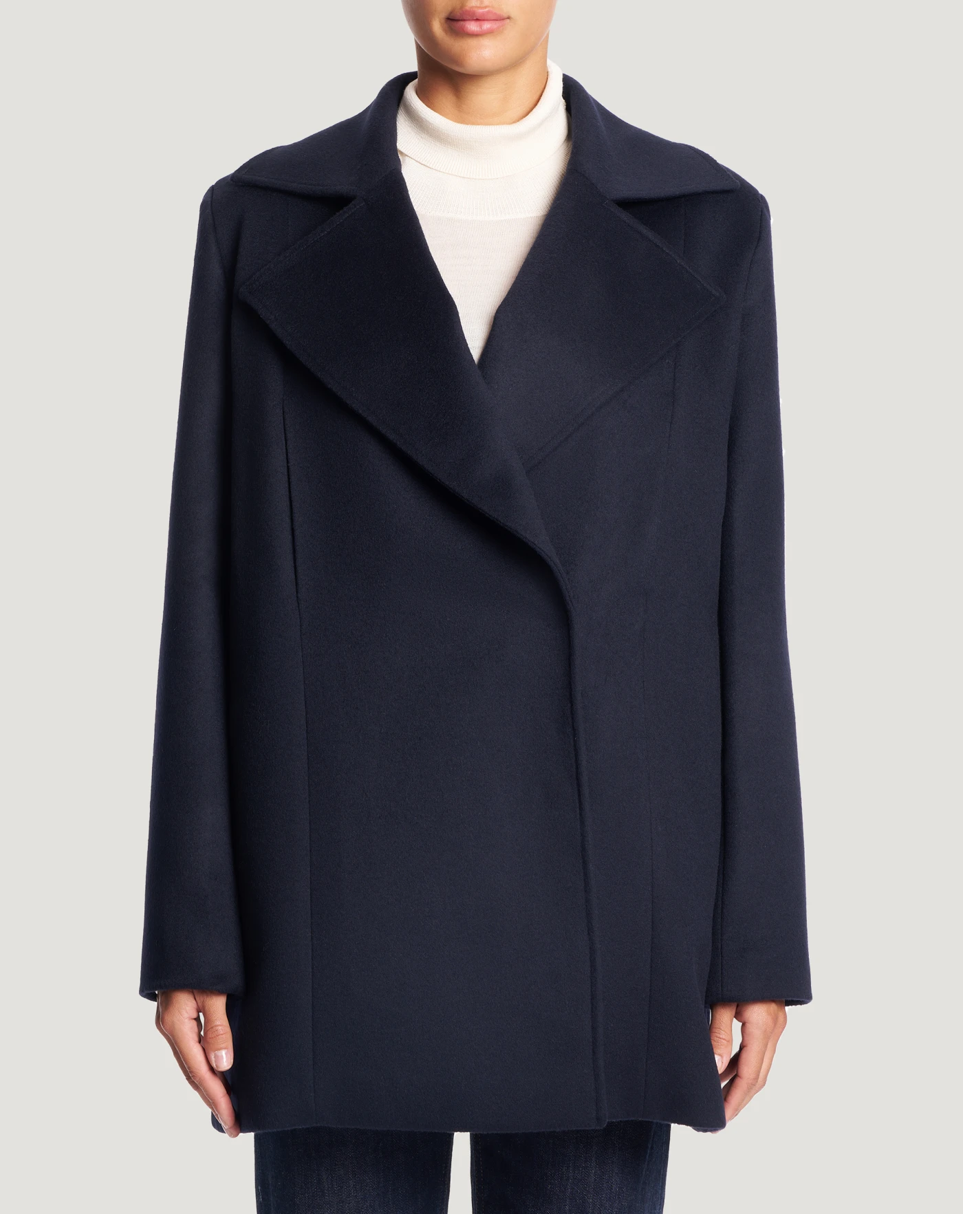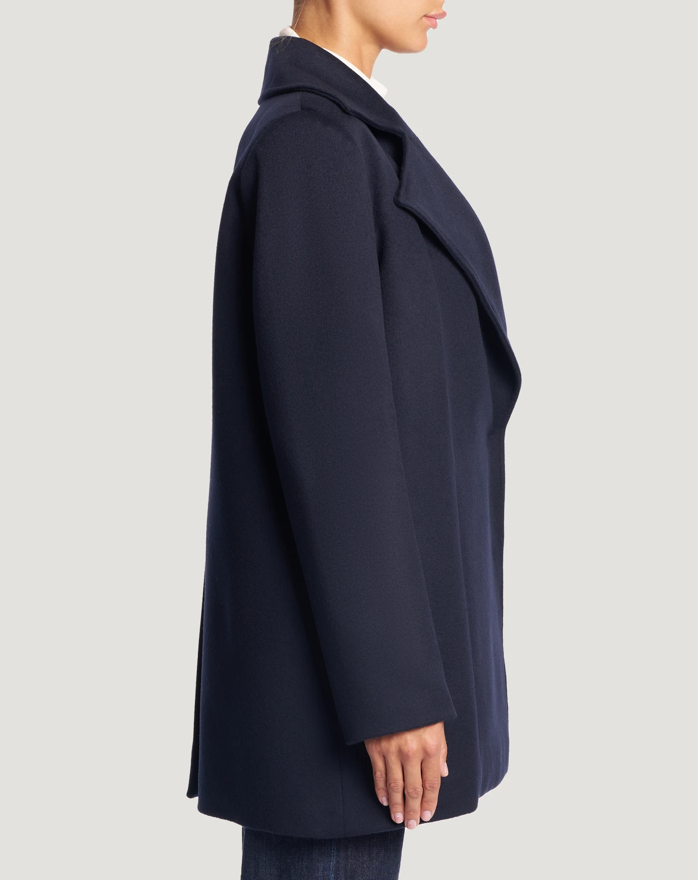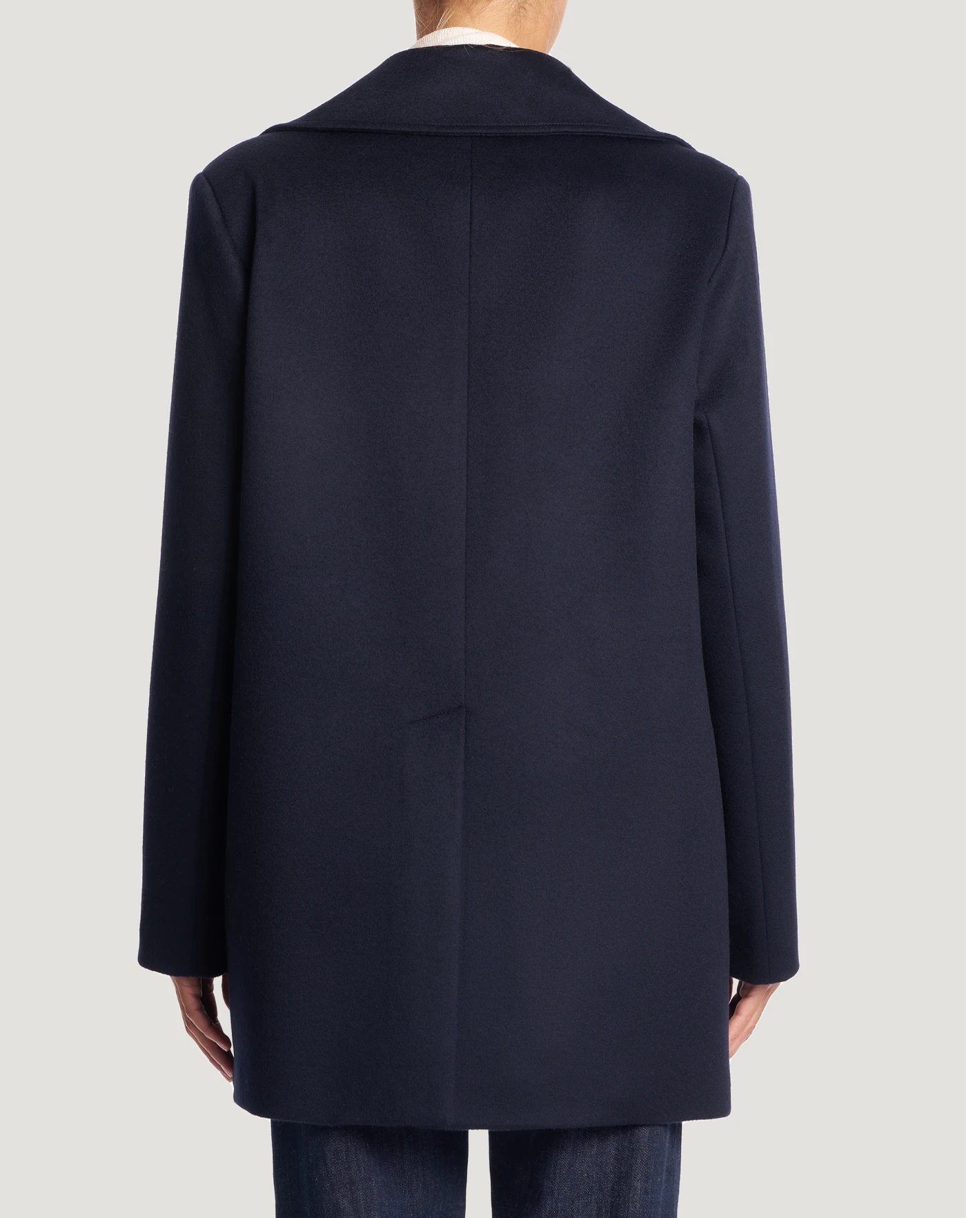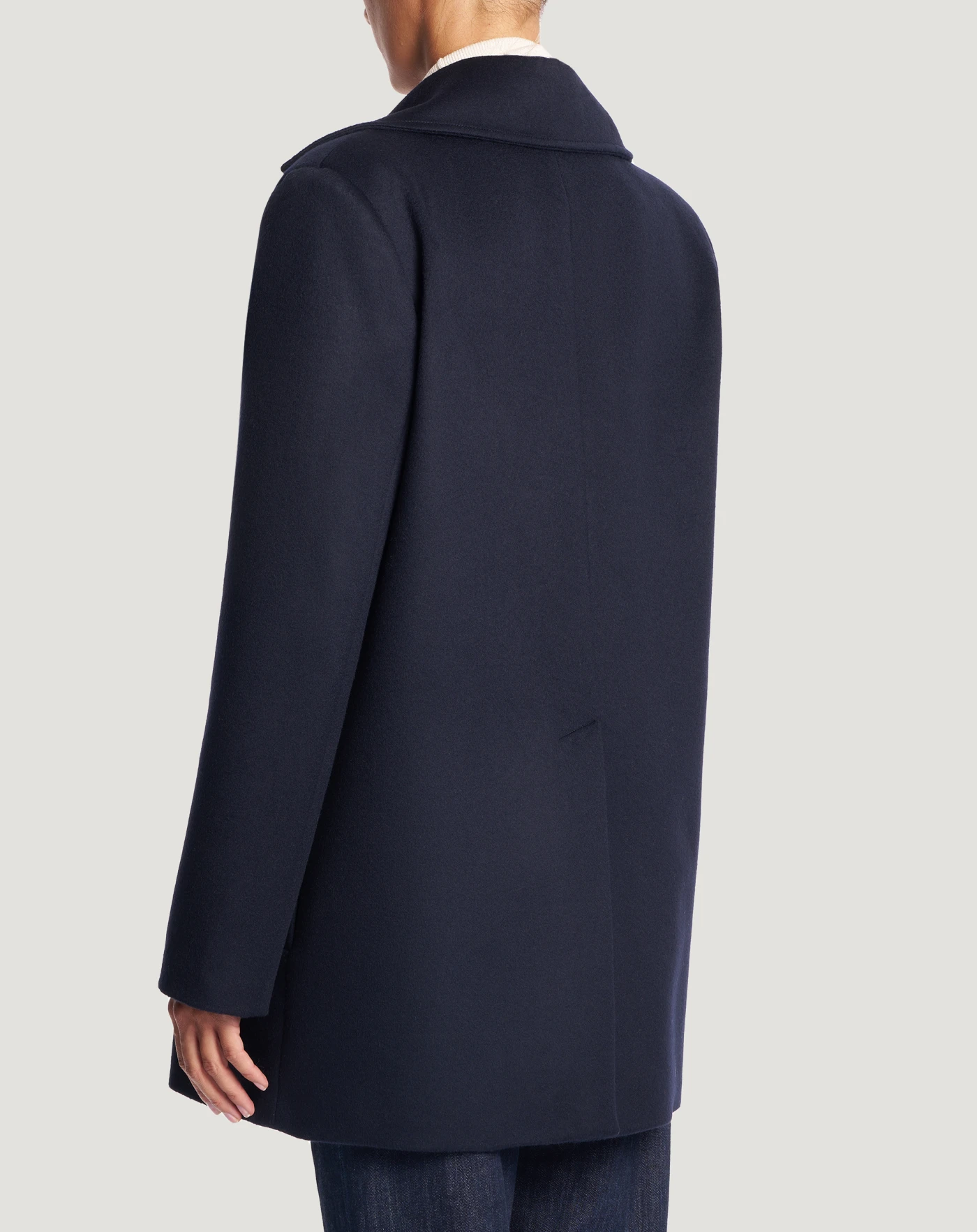 Cappotto in drap di lana e cachemire, un tessuto pregiato, caldo e confortevole. Con chiusura doppiopetto e bottoni automatici nascosti, in variante navy per aggiungere eleganza in ogni outfit.