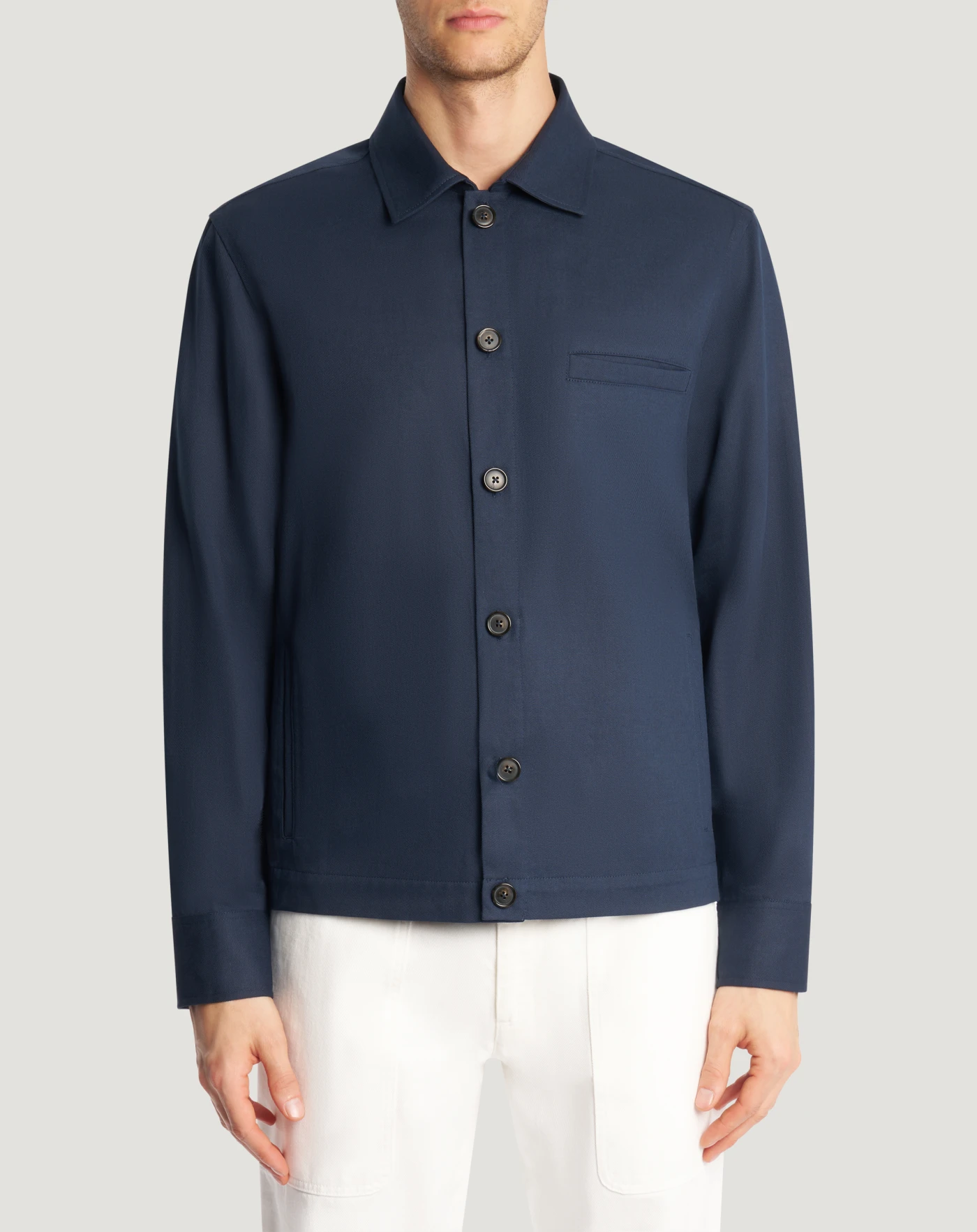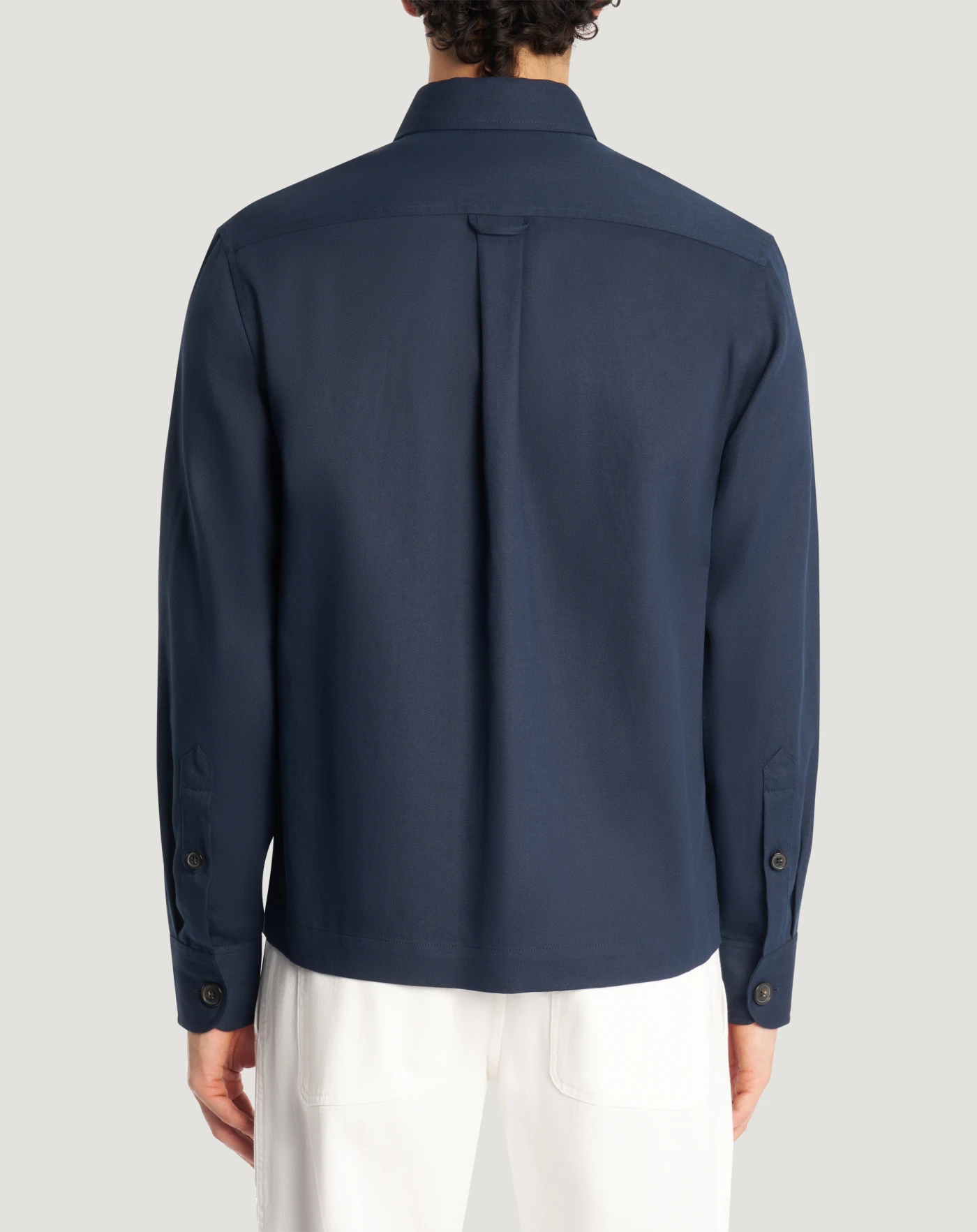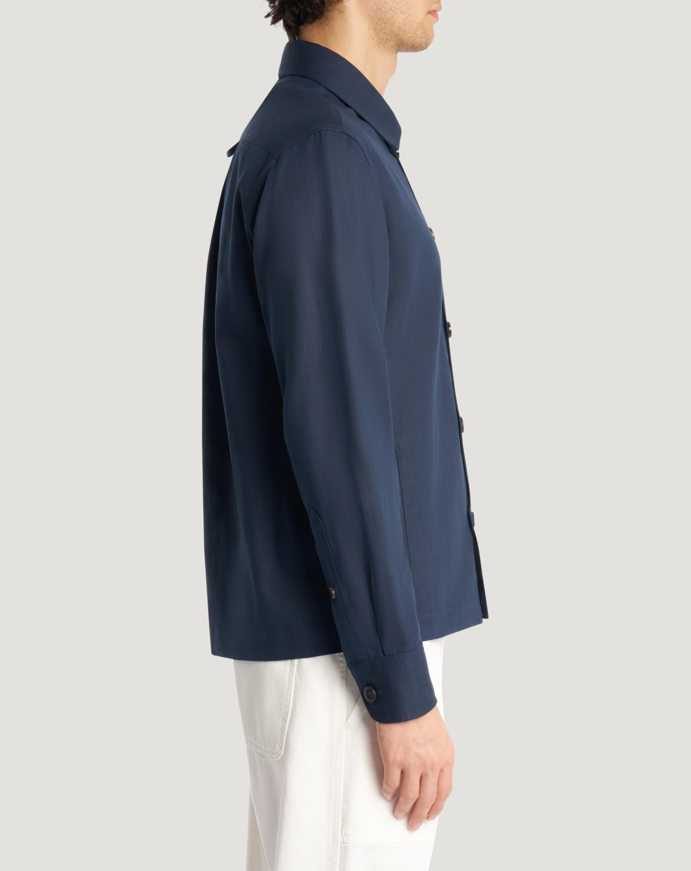 Giacca in bull ultraleggero realizzato in misto cotone e lino, che unisce la struttura compatta tipica del bull alla freschezza e leggerezza delle fibre naturali. Linea regular destrutturata che donerà un tocco sartoriale inedito allo stile. In blu navy per look di stagione ricercati.