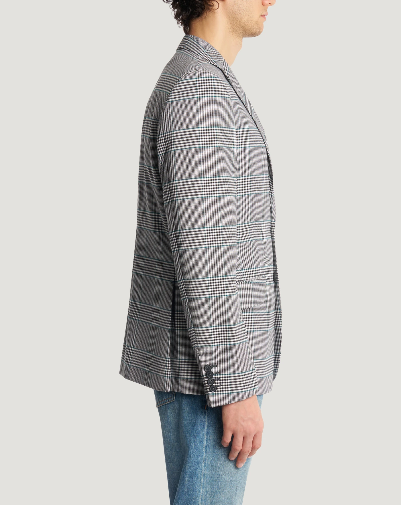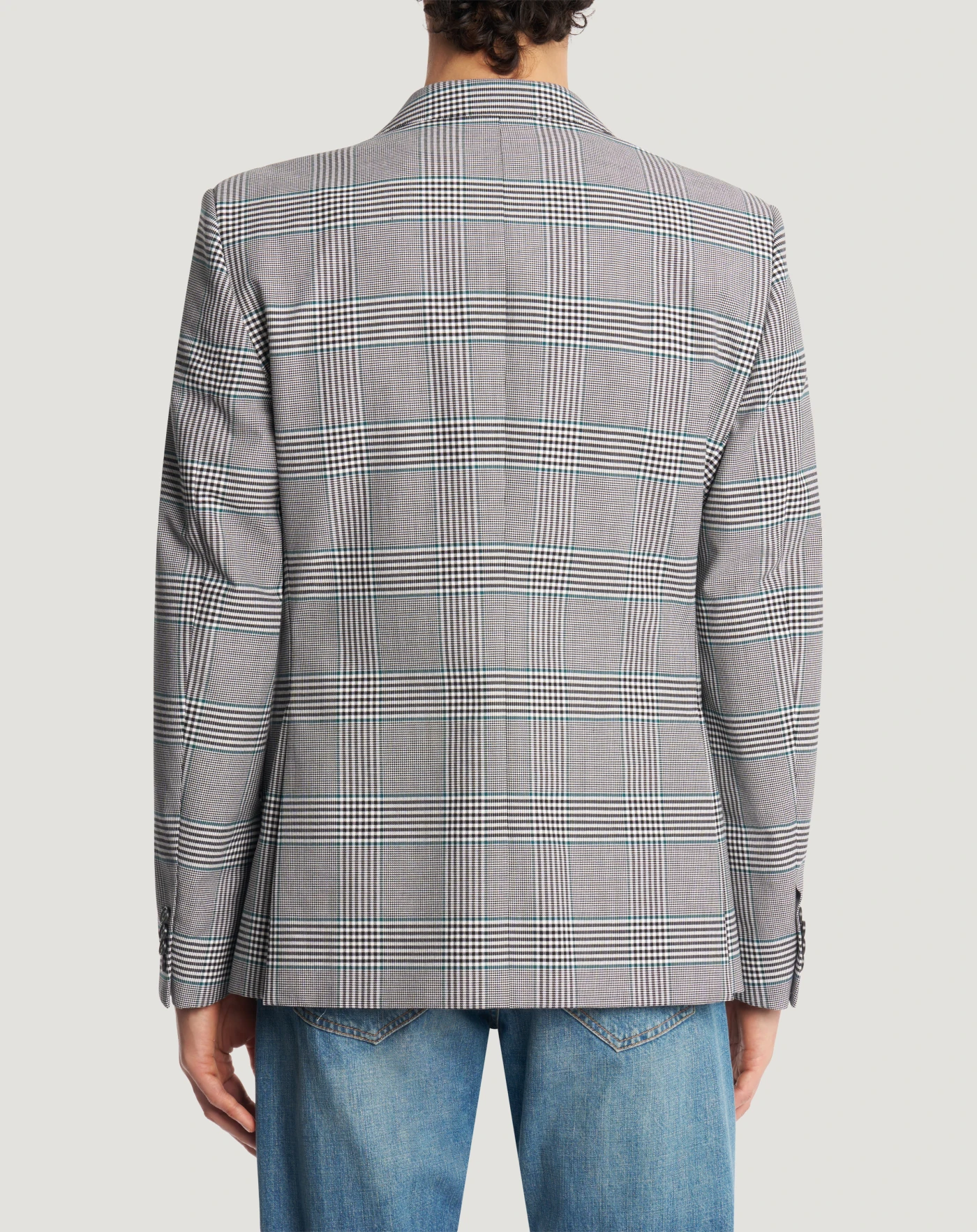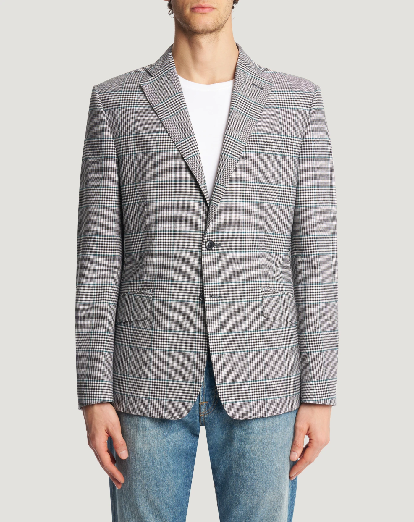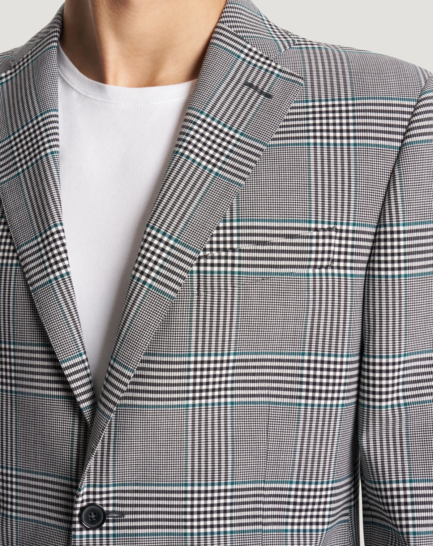Giacca in lana e cotone a fantasia check un tessuto ricercato, per dare una nota grafica allo stile. Chiusura monopetto e linea regular da abbinare come vuoi.