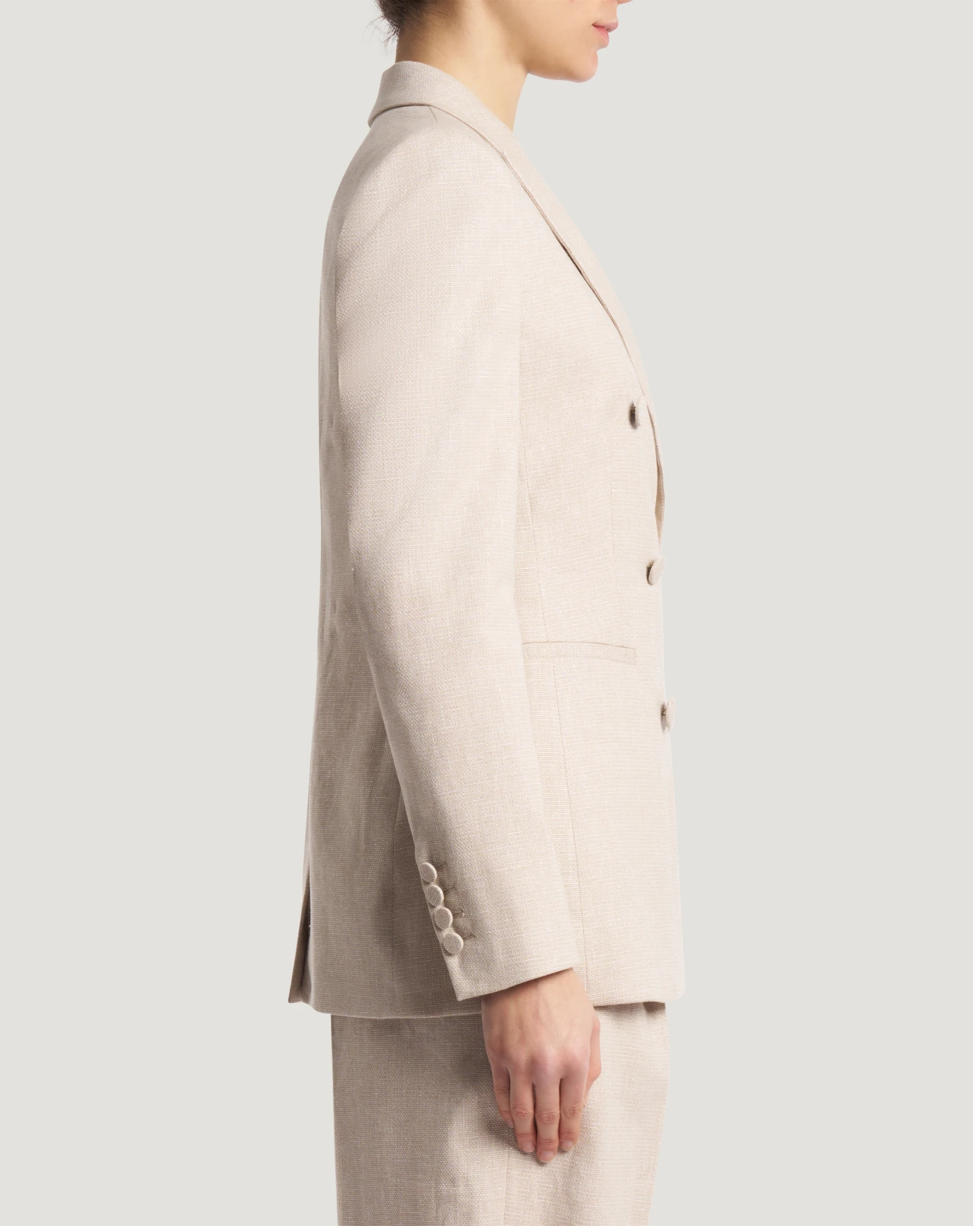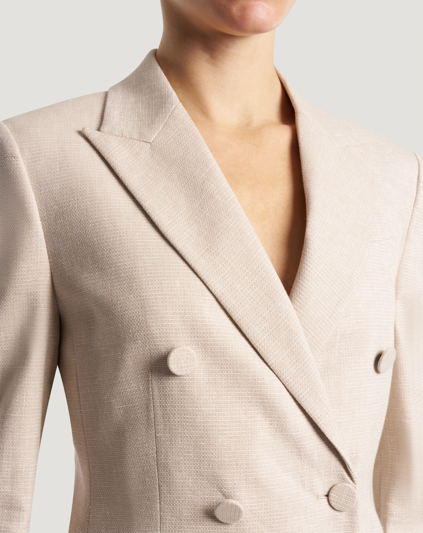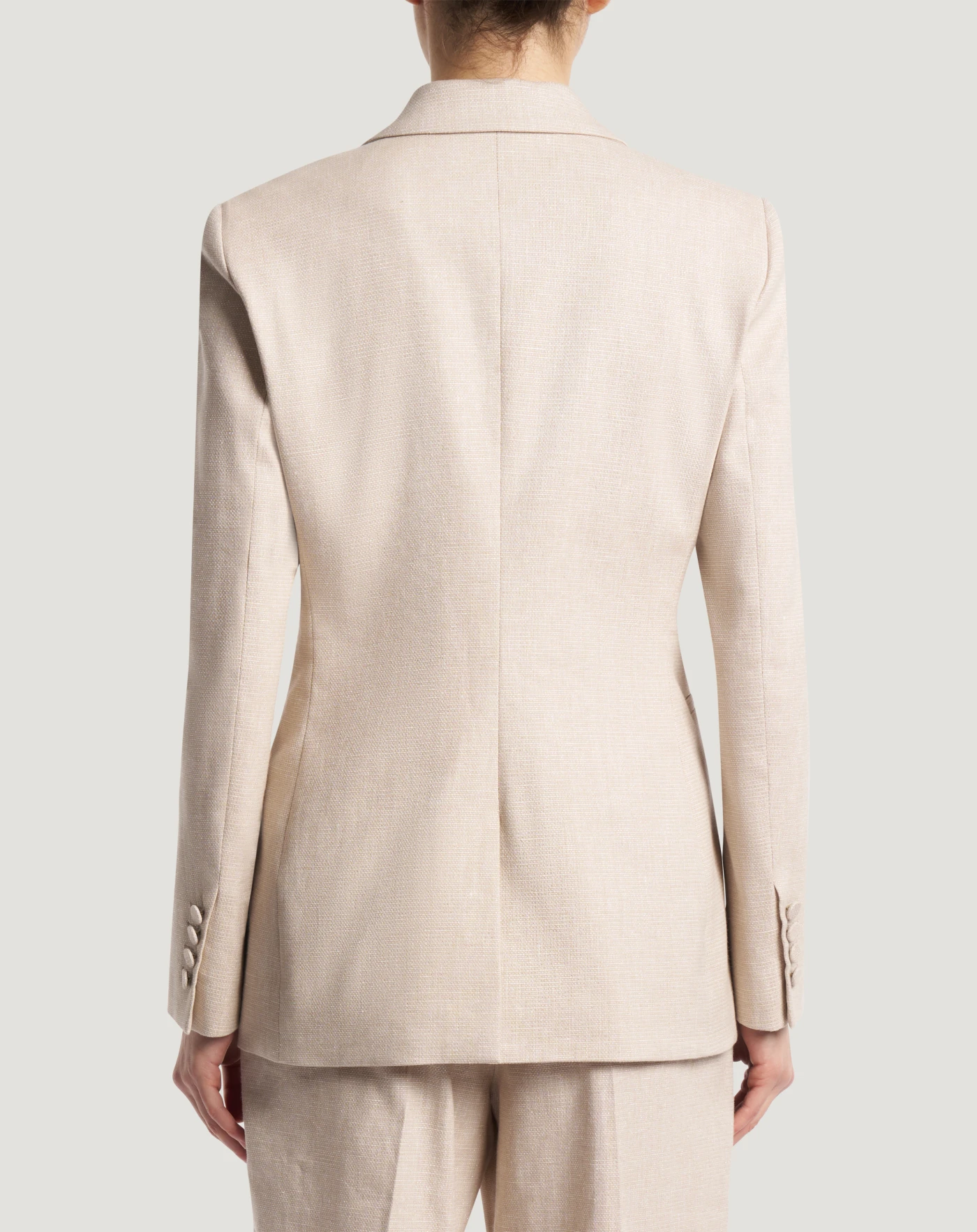Giacca doppiopetto dalla linea asciutta e rever a lancia in misto cotone e lino, un tessuto arricchito da una componente stretch e caratterizzato da una micro-struttura fancy che dona un effetto raffinato e leggermente materico.