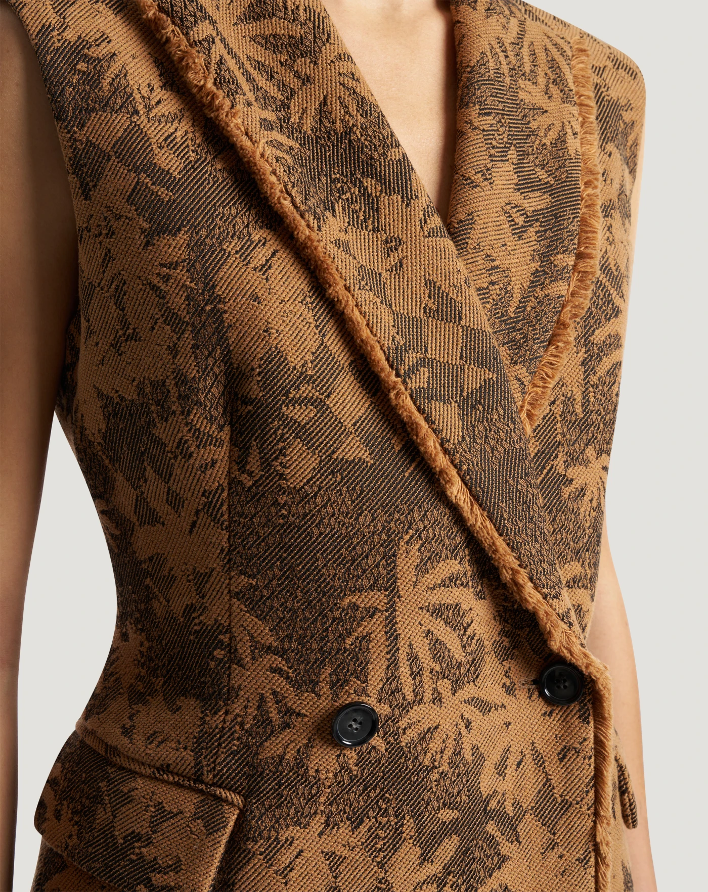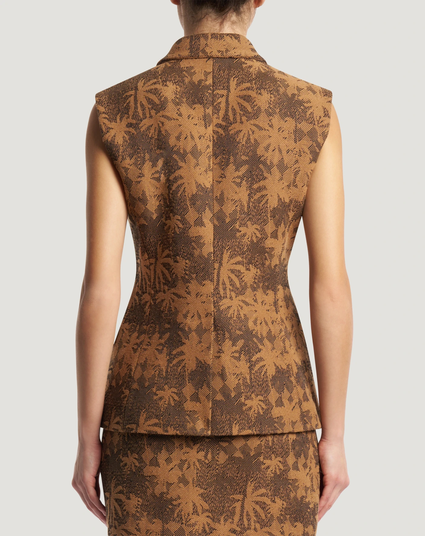 Gilet in tessuto di cotone jacquard con fantasia palme e rombi. Scegli questo modello di carattere per dare una nota grafica allo stile, anche in abbinamento alla gonna in coordinato.