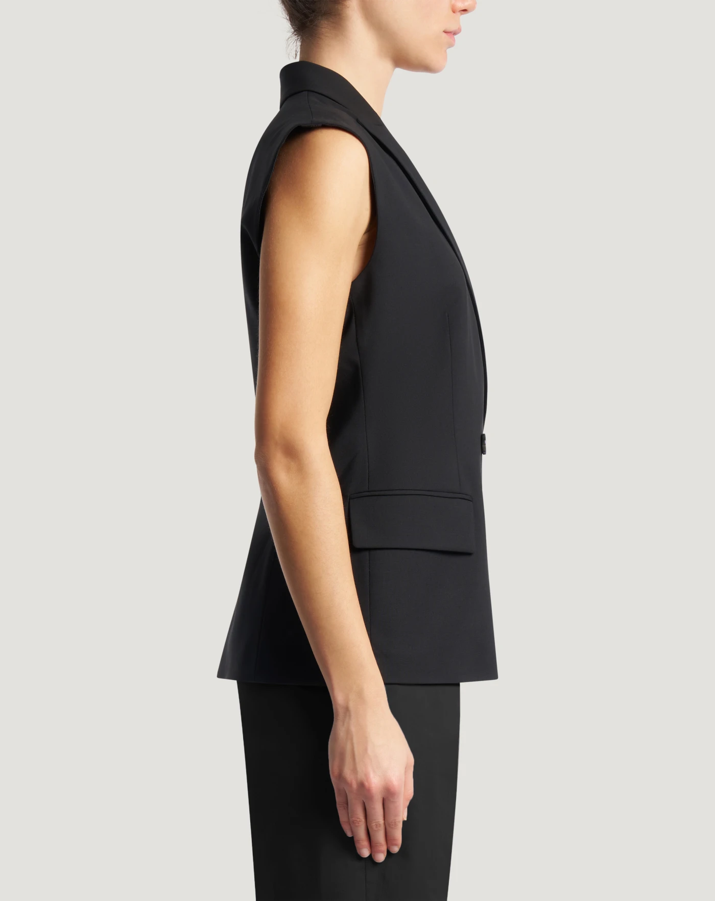 Gilet in lana vergine b-stretch tropical, un tessuto in armatura tela fresco e adatto alla stagione. Linea doppiopetto sartoriale per completare lo stile, anche in abbinamento ai pantaloni in coordinato.