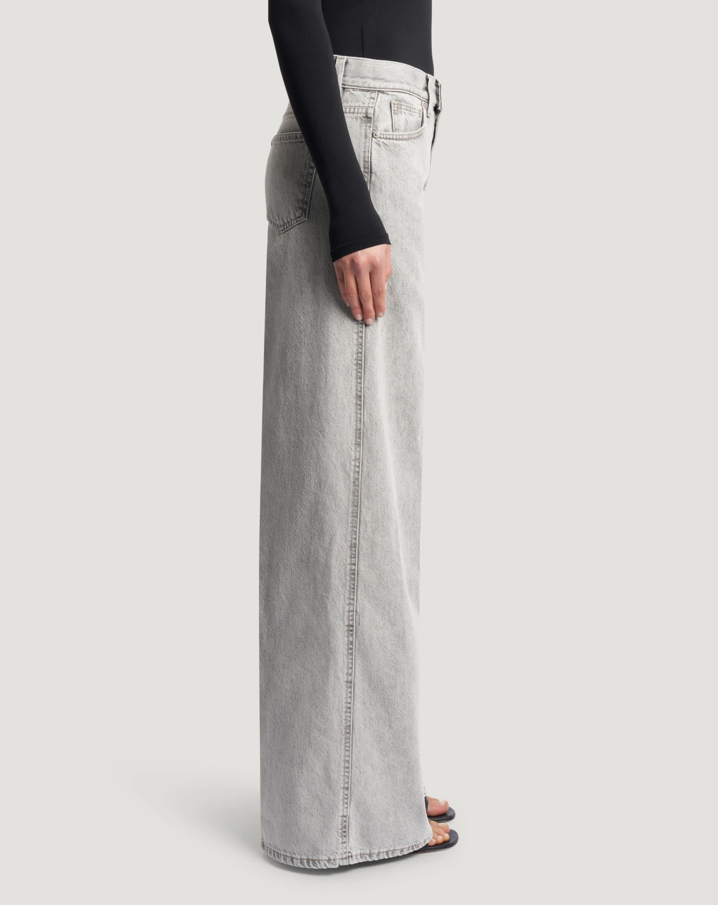 Jeans in black denim una tela ferma morbida, confortevole e resistente (12 once), con lavaggio grigio caratterizzato da dettagli in rilievo più scuri. Con vita regular e linea ampia, sono un modello che valorizza la silhouette e aggiunge carattere allo stile.