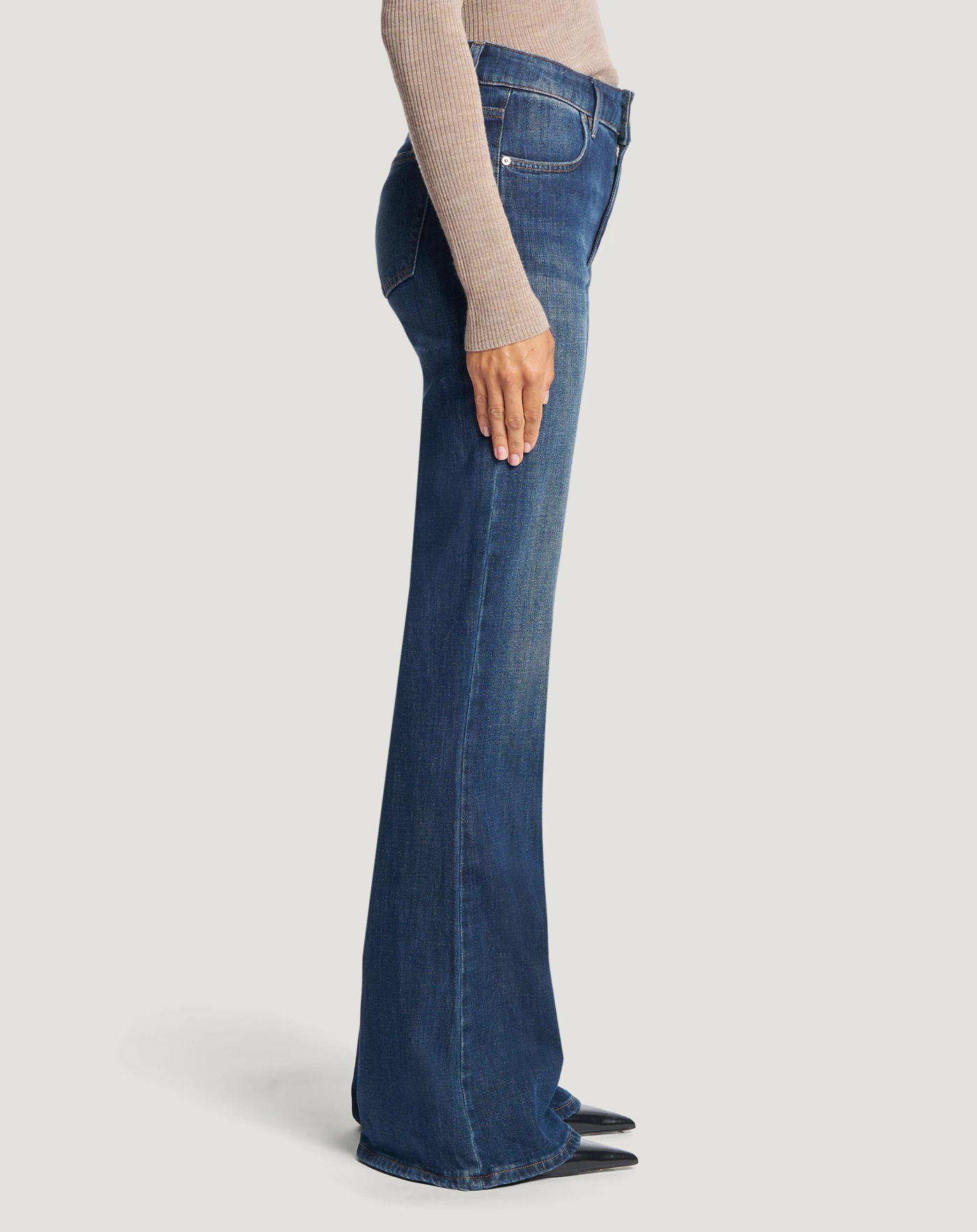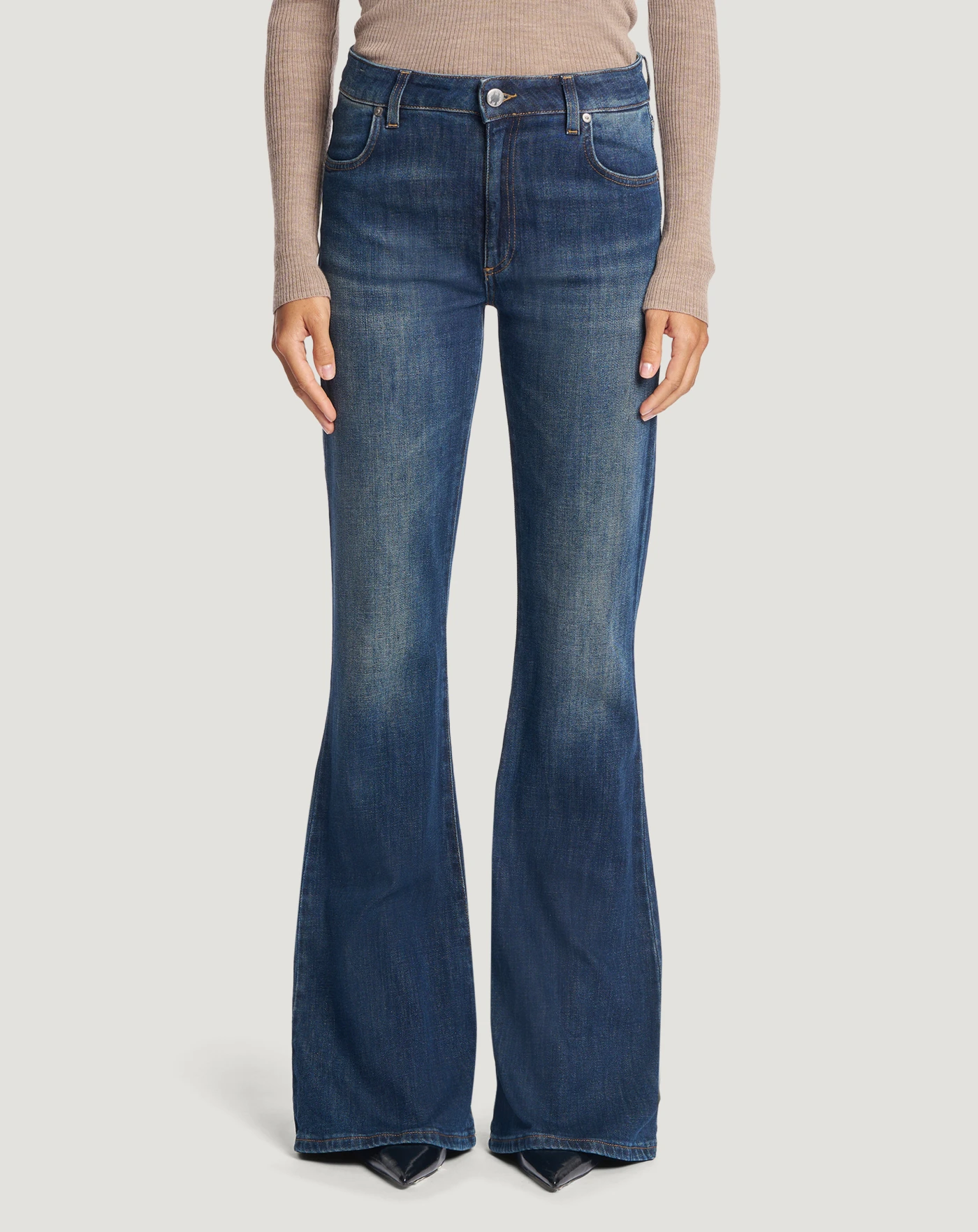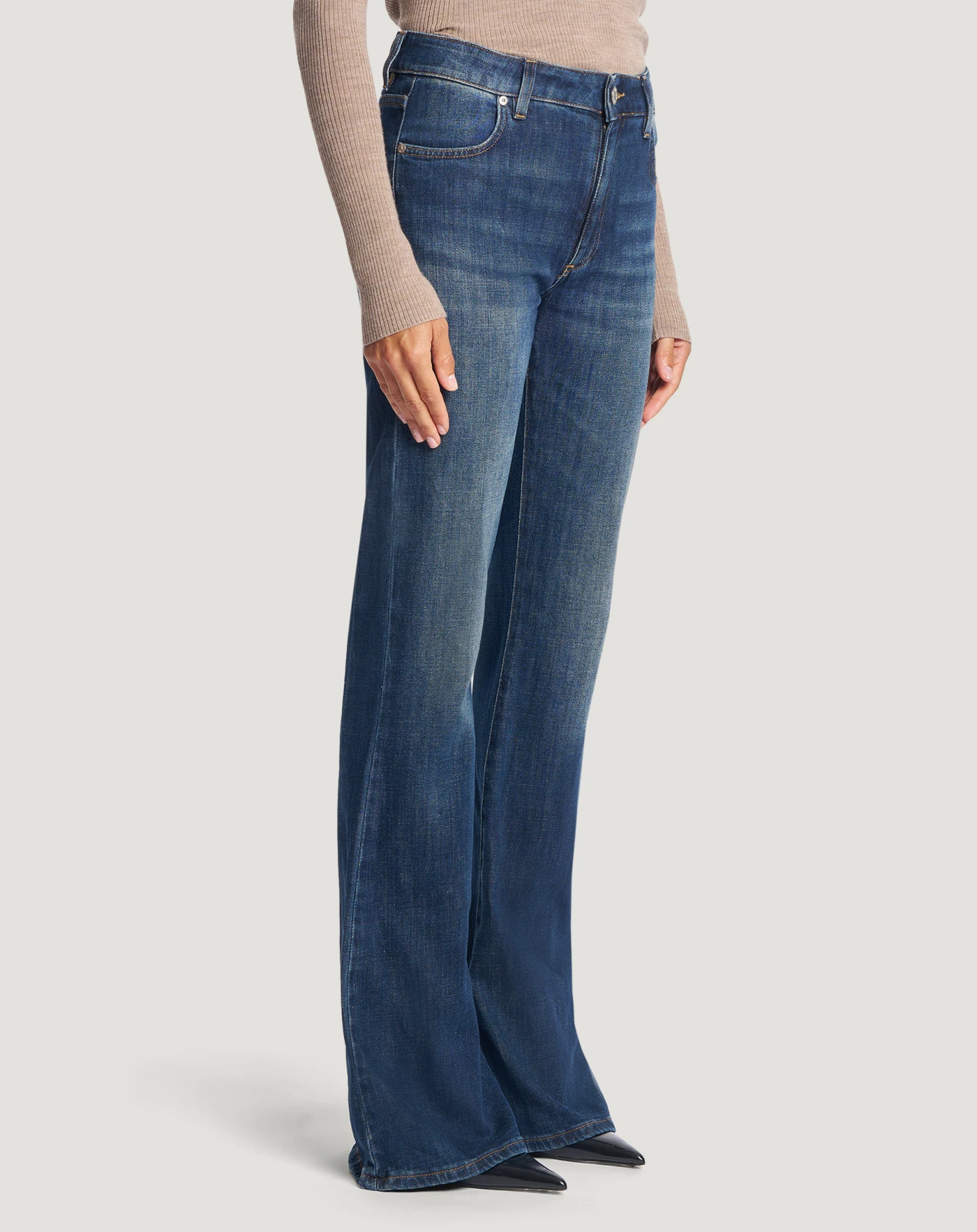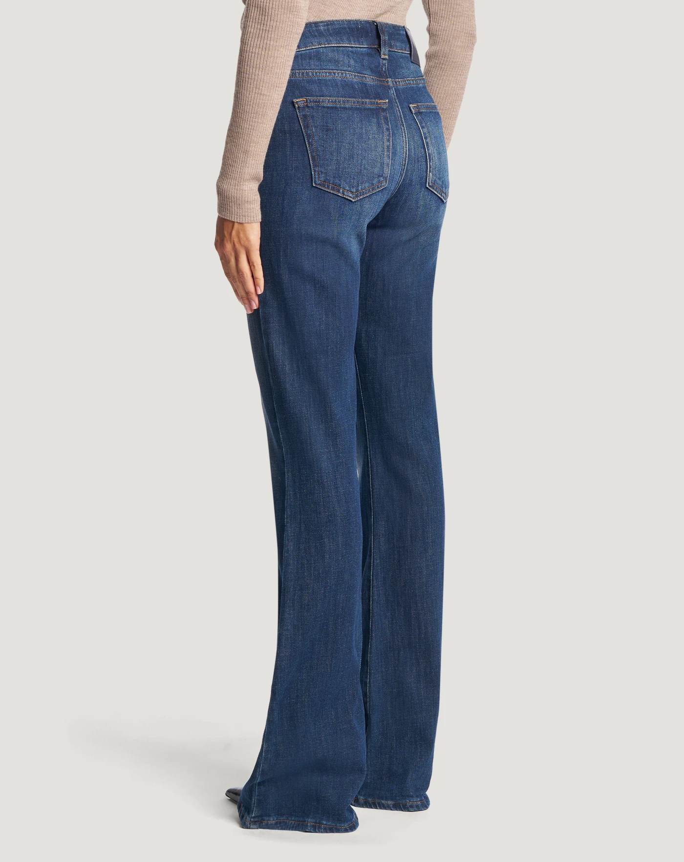 Jeans in denim stretch dalla tela morbida, confortevole e resistente (12 once), con lavaggio scuro caratterizzato da schiariture localizzate. Con vita regular, piega stirata e linea flare, hanno un'attitudine urbana ricercata e versatile.