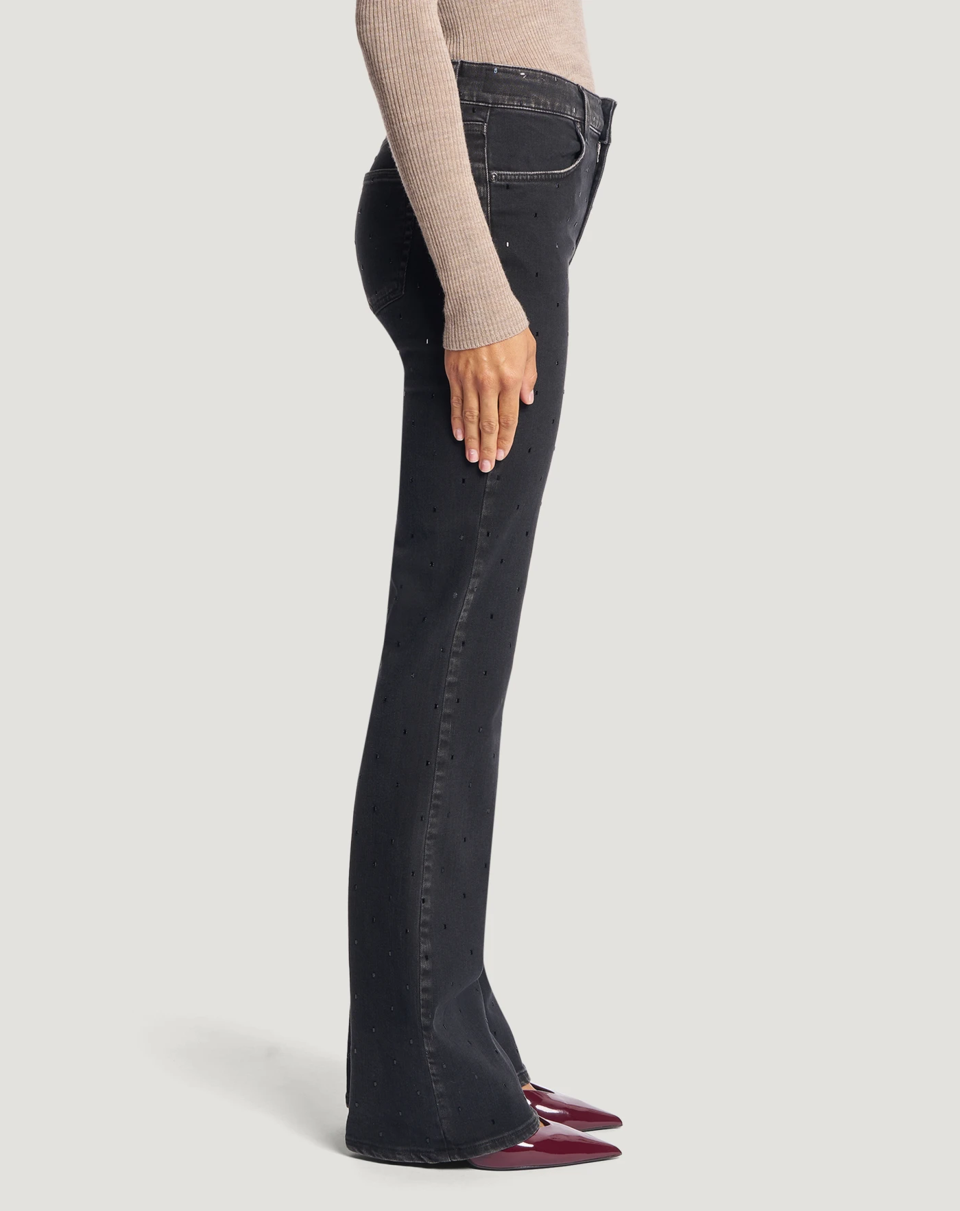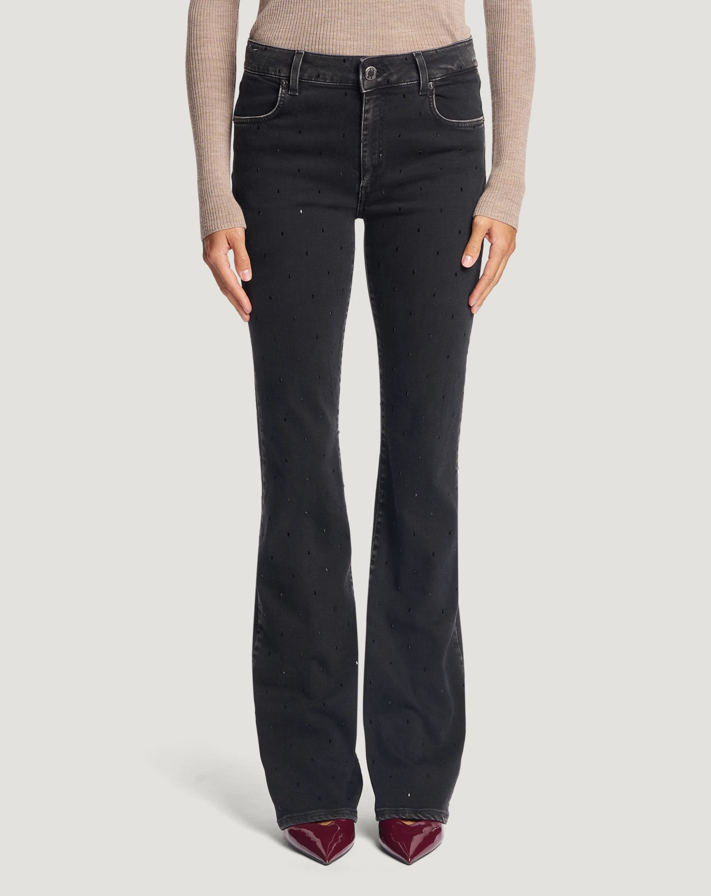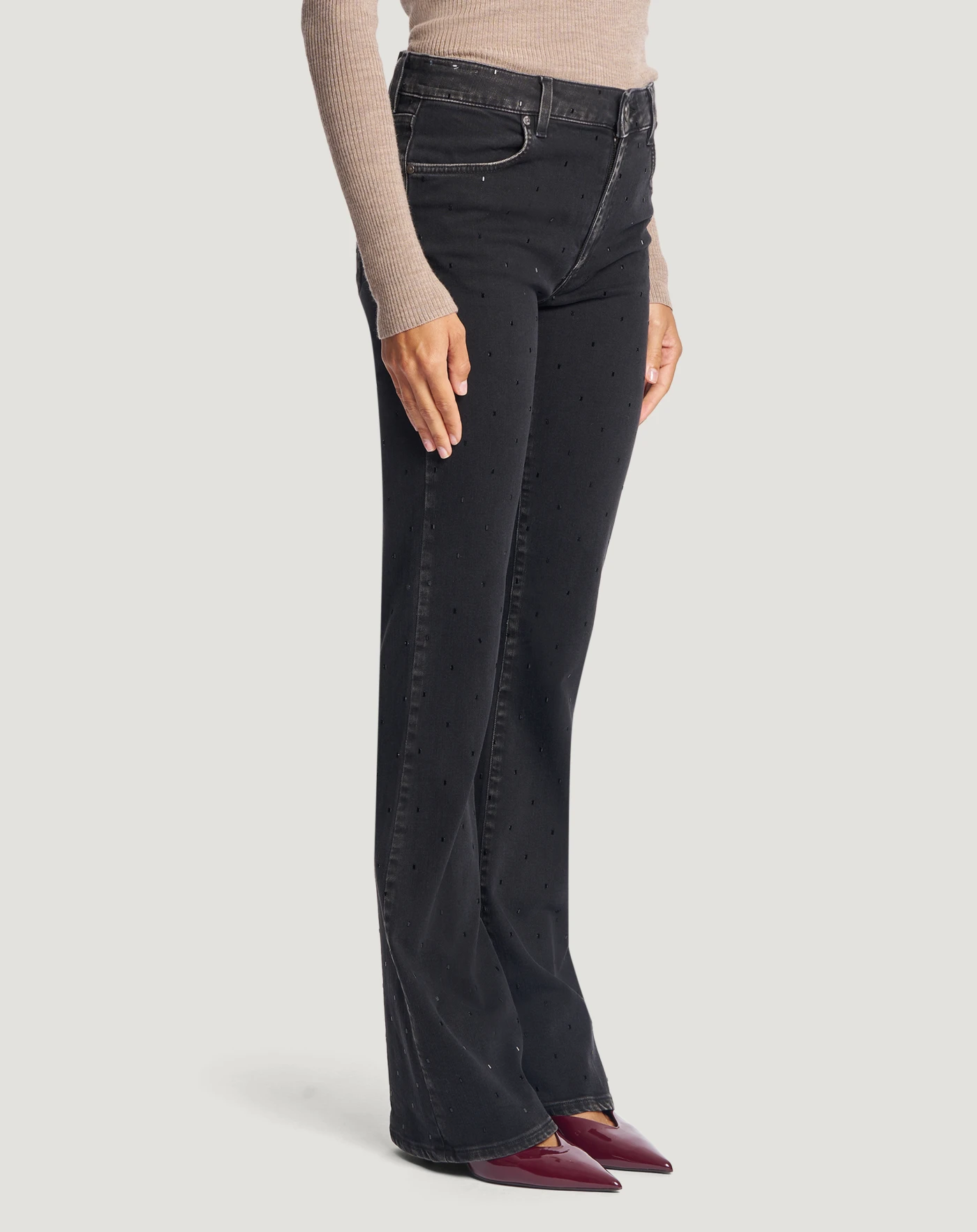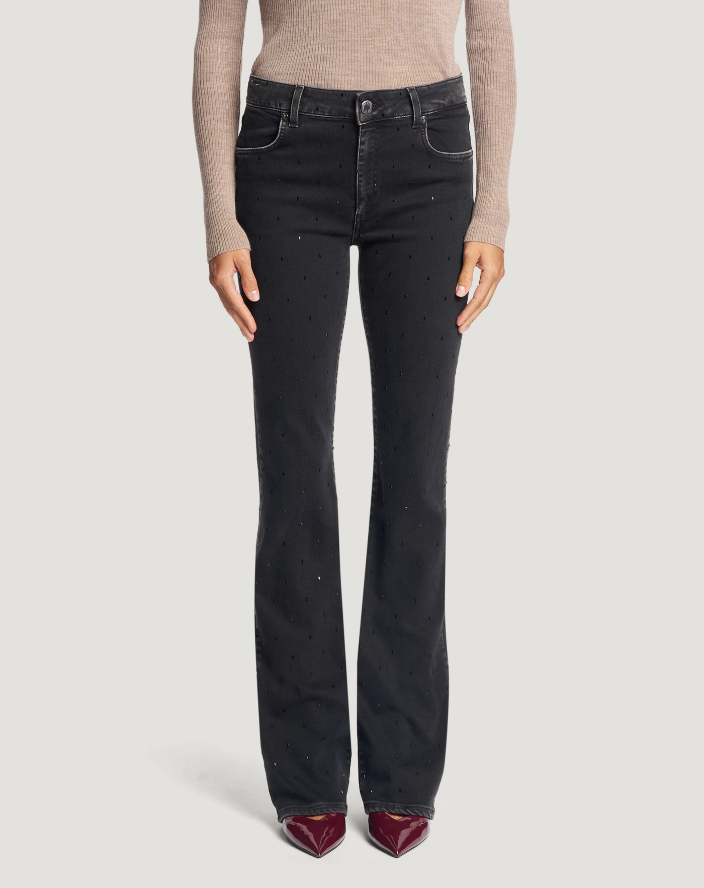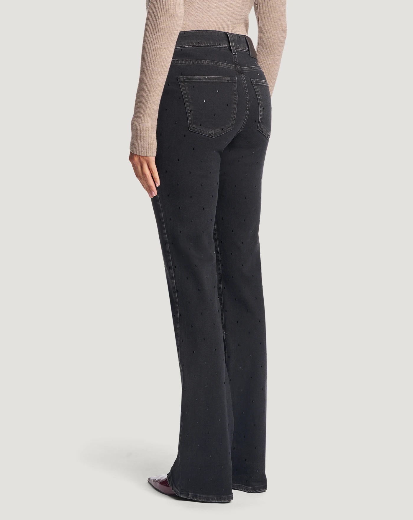 Jeans in black denim di cotone stretch riciclato, una tela morbida, leggera (10 once) e piacevole da indossare, con un lavaggio scuro e uniforme impreziosito da punti metallici all over. Con vita regular, piega stirata e linea flare hanno un'allure glamour perfetta per una serata speciale.