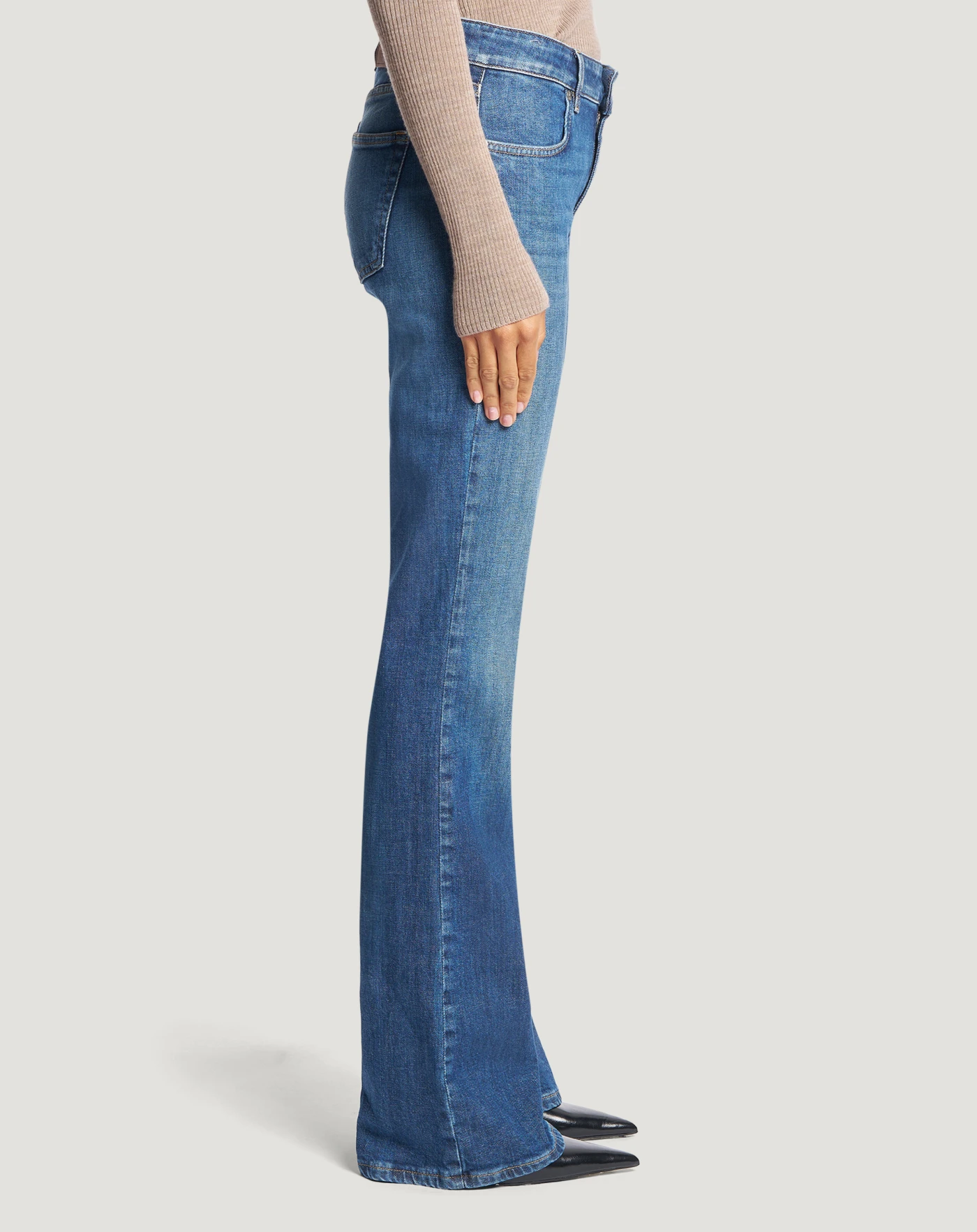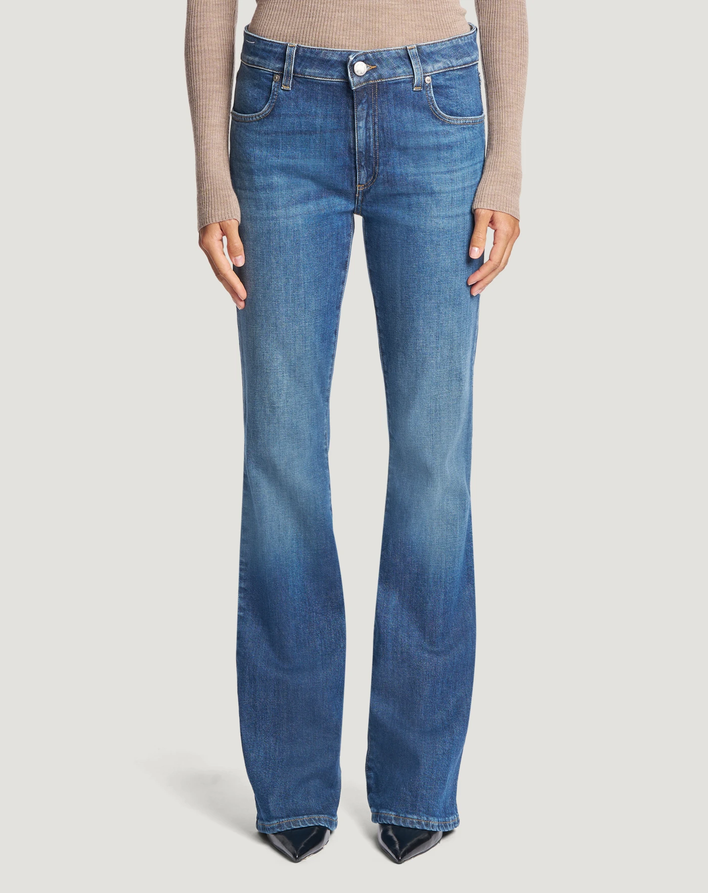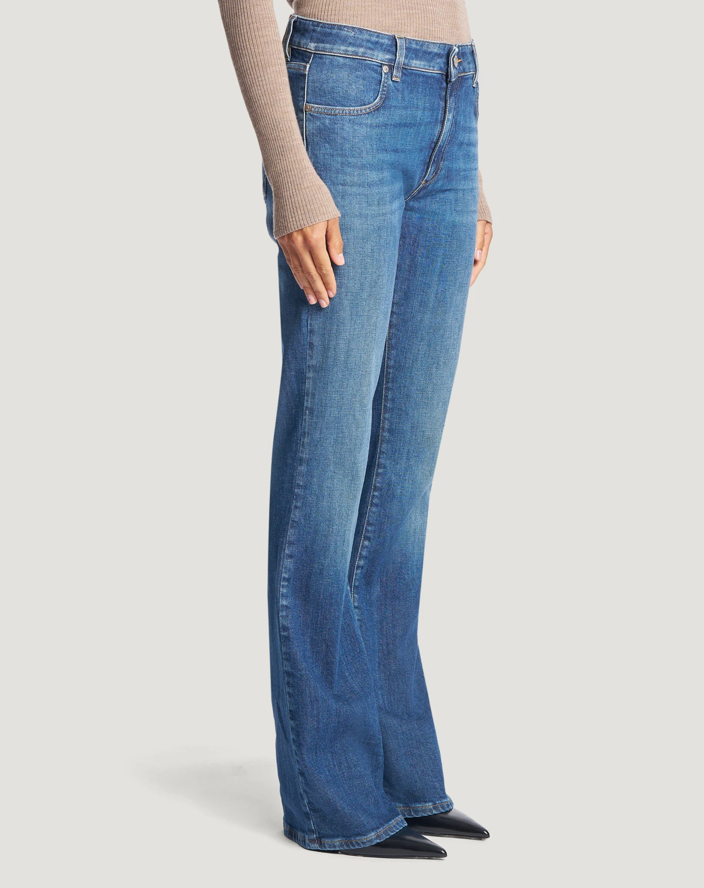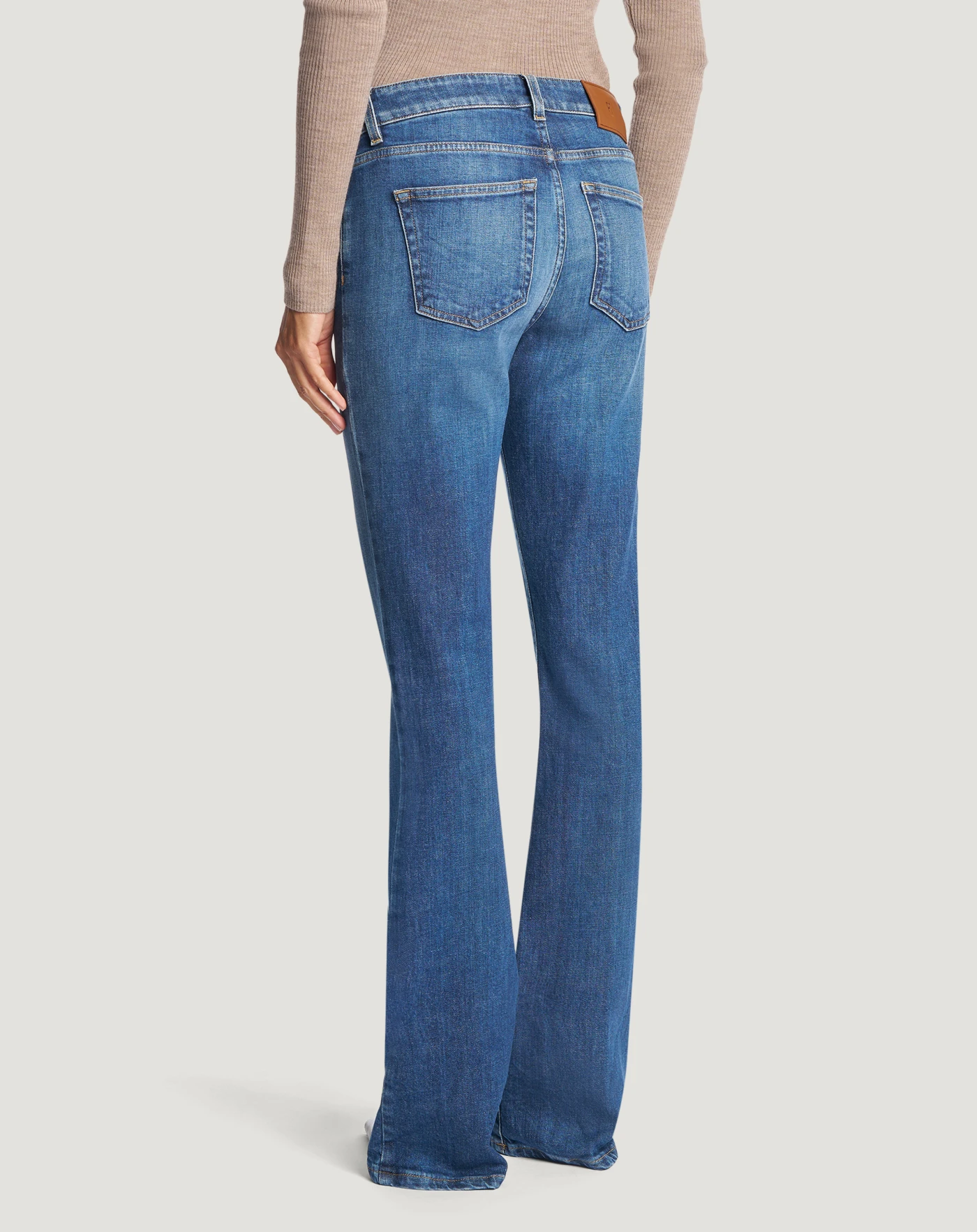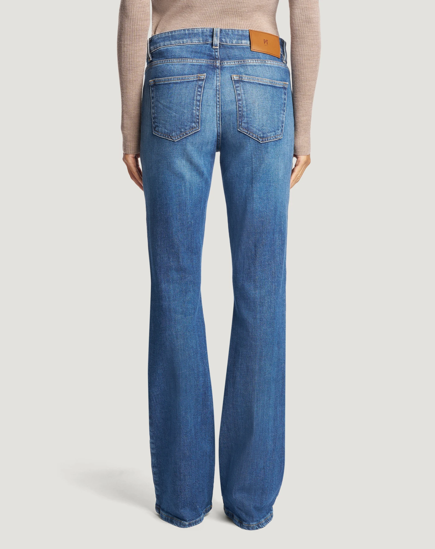 Jeans in denim di cotone stretch responsabile, una tela morbida, leggera (10,5 once) e piacevole da indossare, con un lavaggio caratterizzato da evidenti schiariture. Con vita regular, piega stirata e linea flare hanno un aspetto versatile e ricercato.