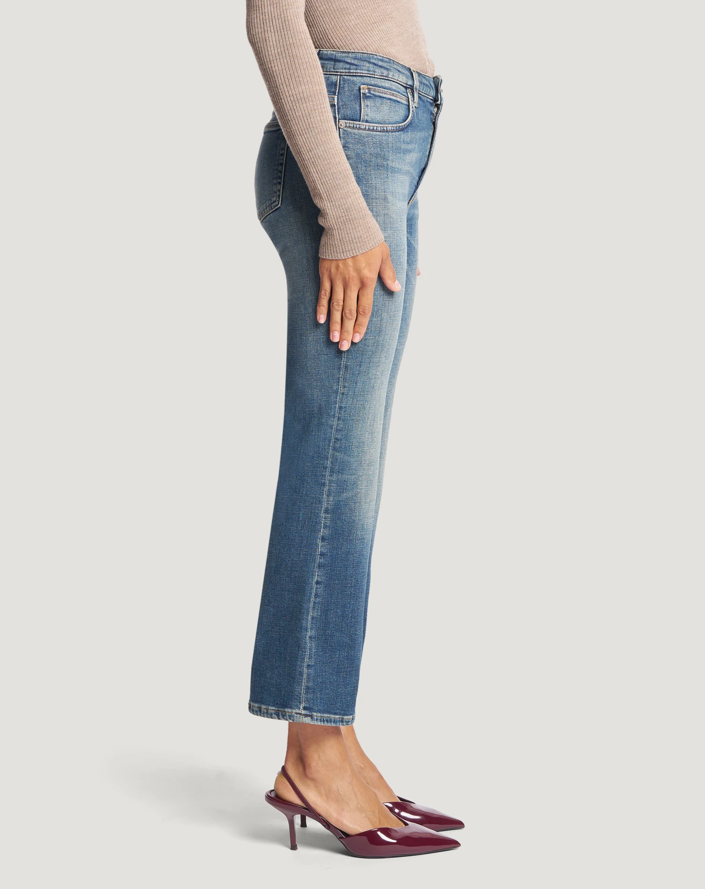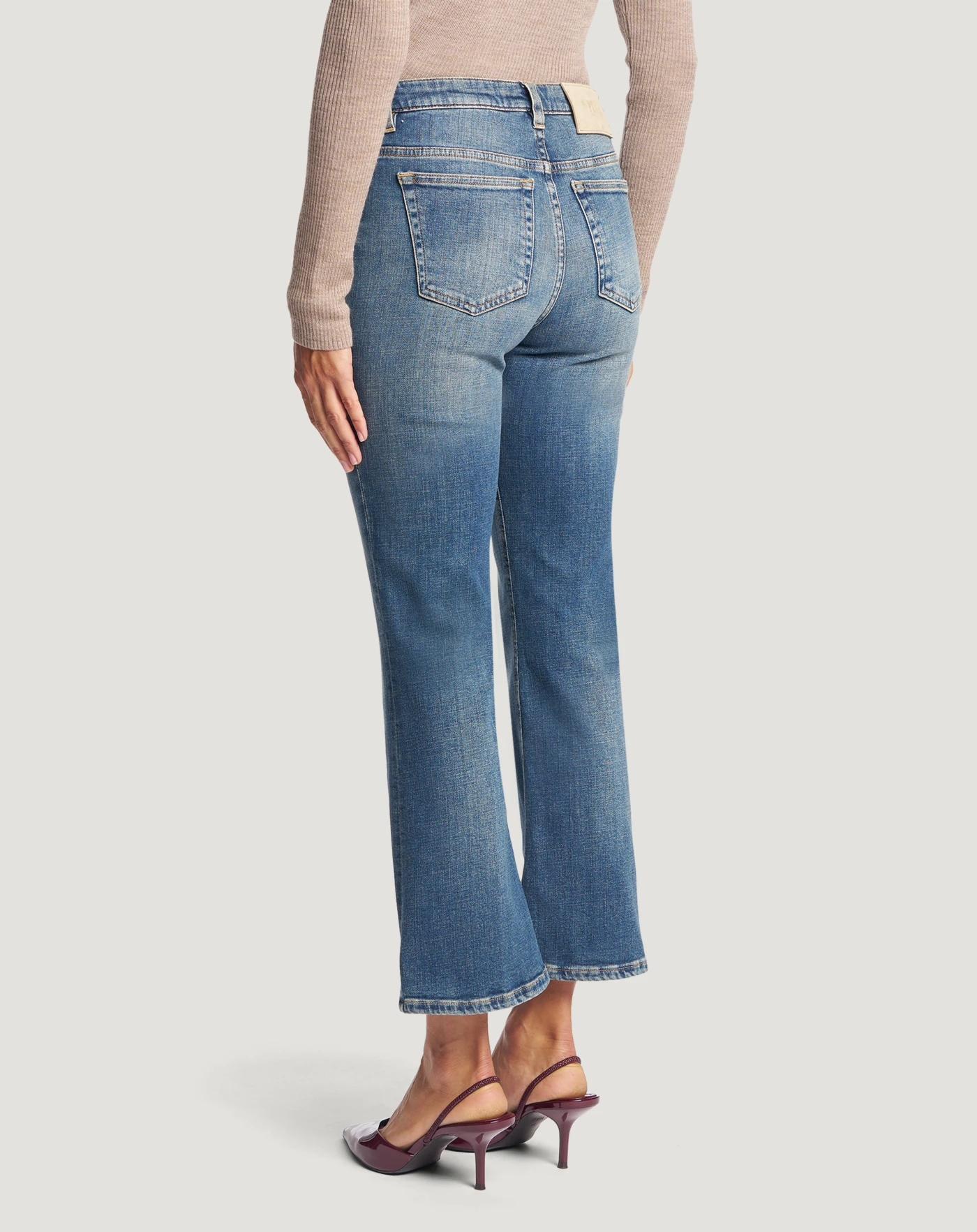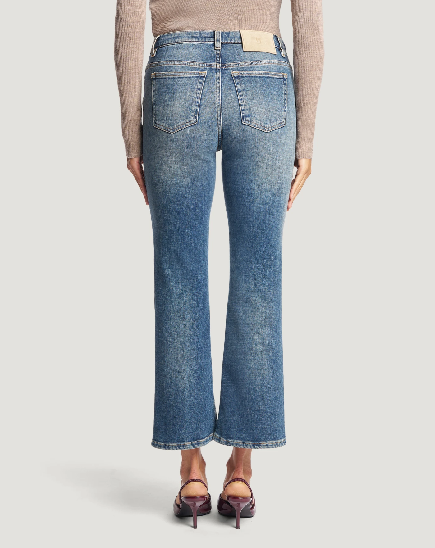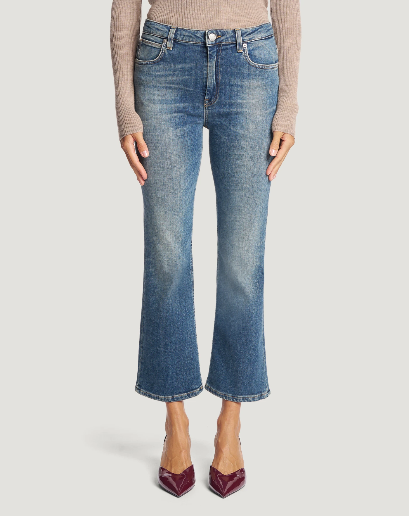 Jeans in denim di cotone stretch con lavaggio caratterizzato da evidenti schiariture che danno una nota di carattere. Con vita regular e linea flare cropped, hanno un design che non passerà inosservato nei tuoi look daily.