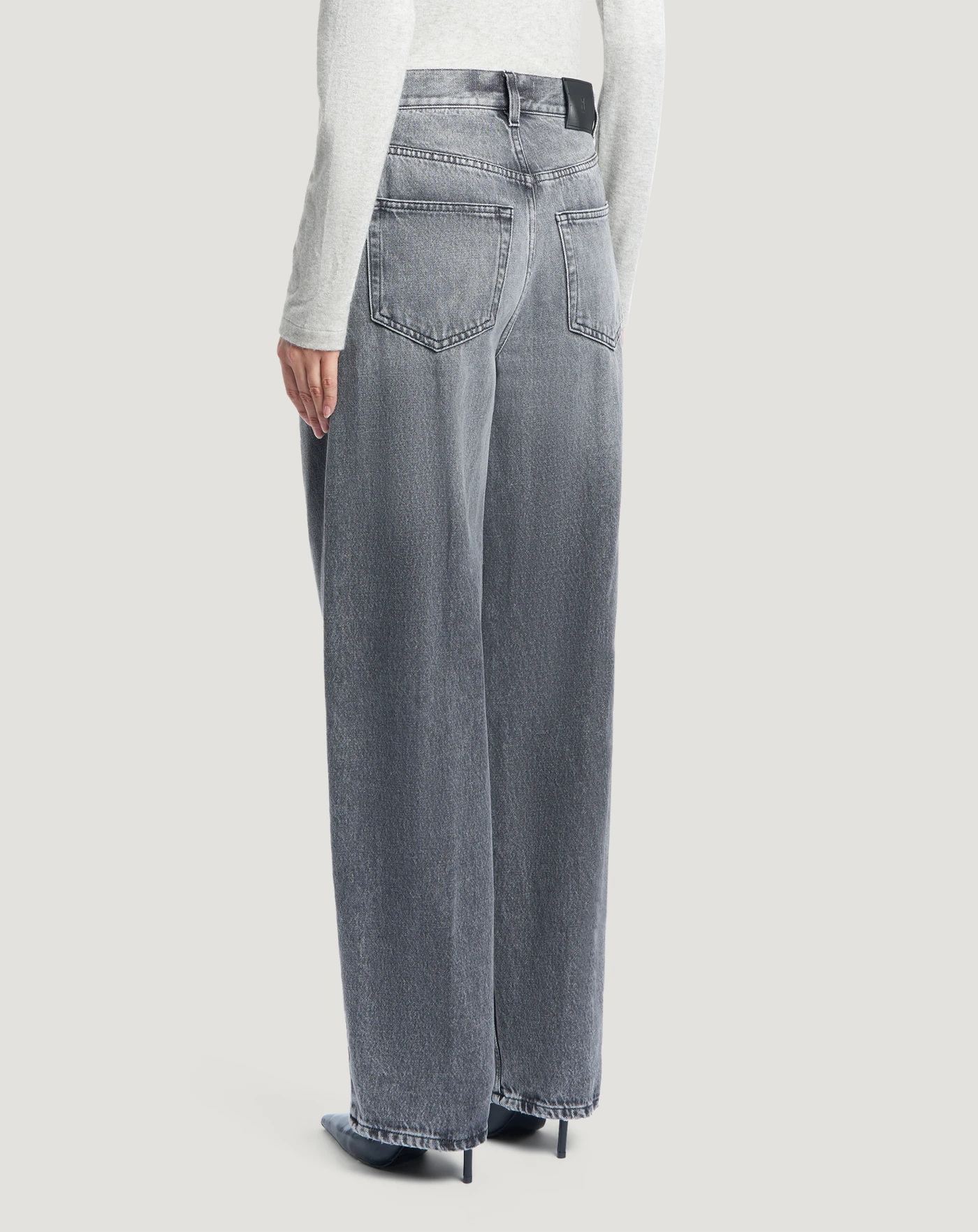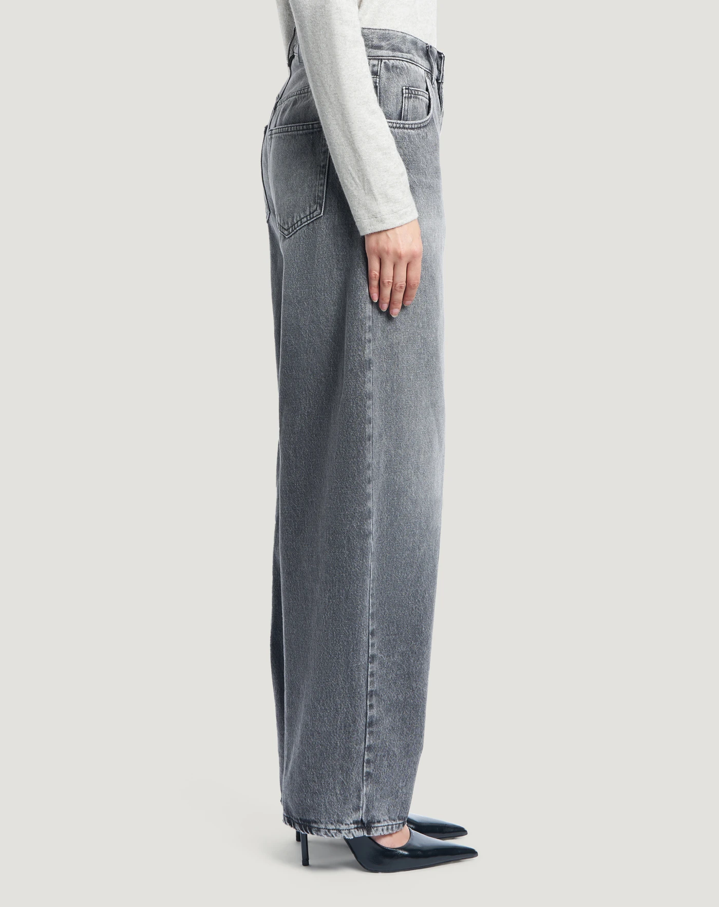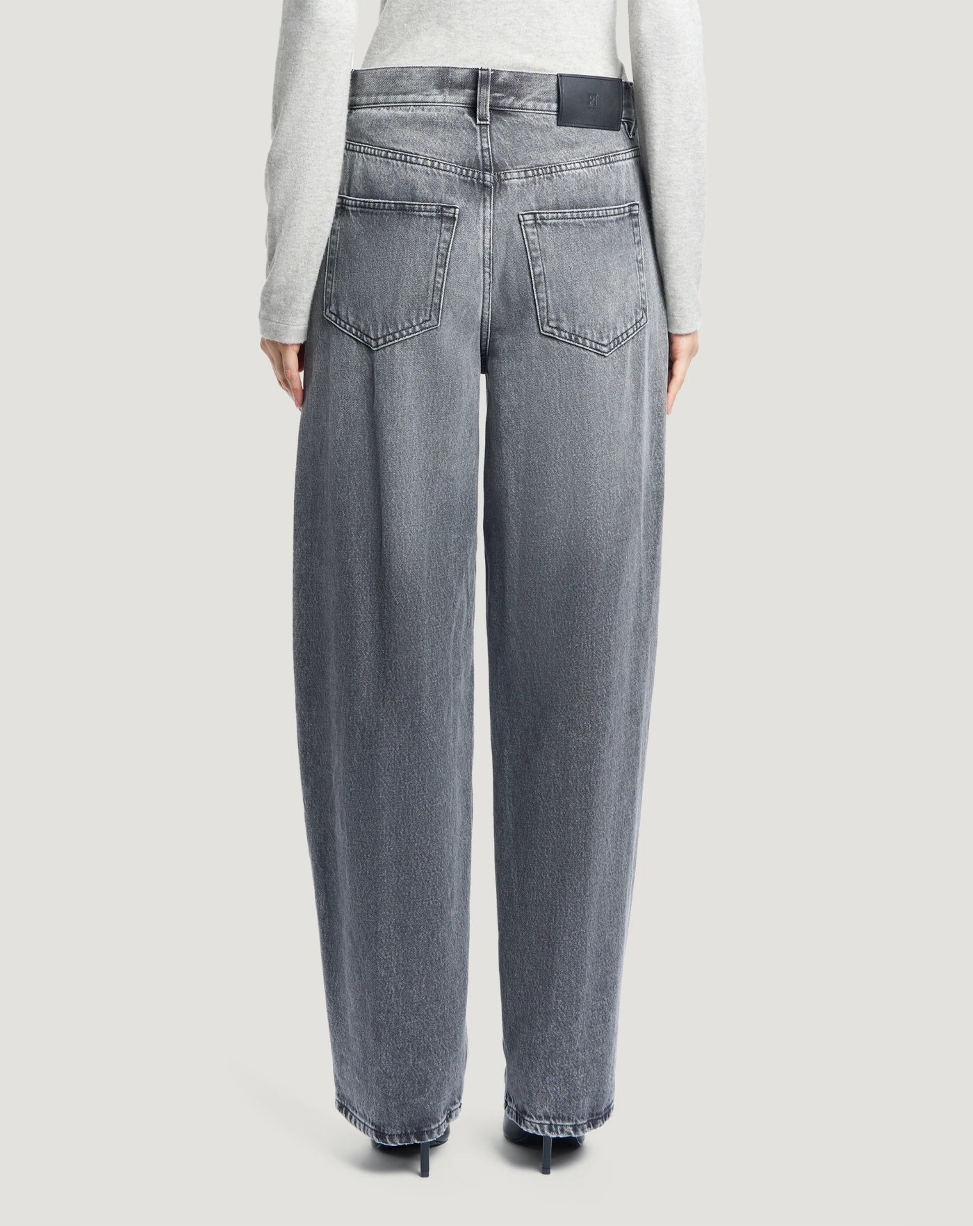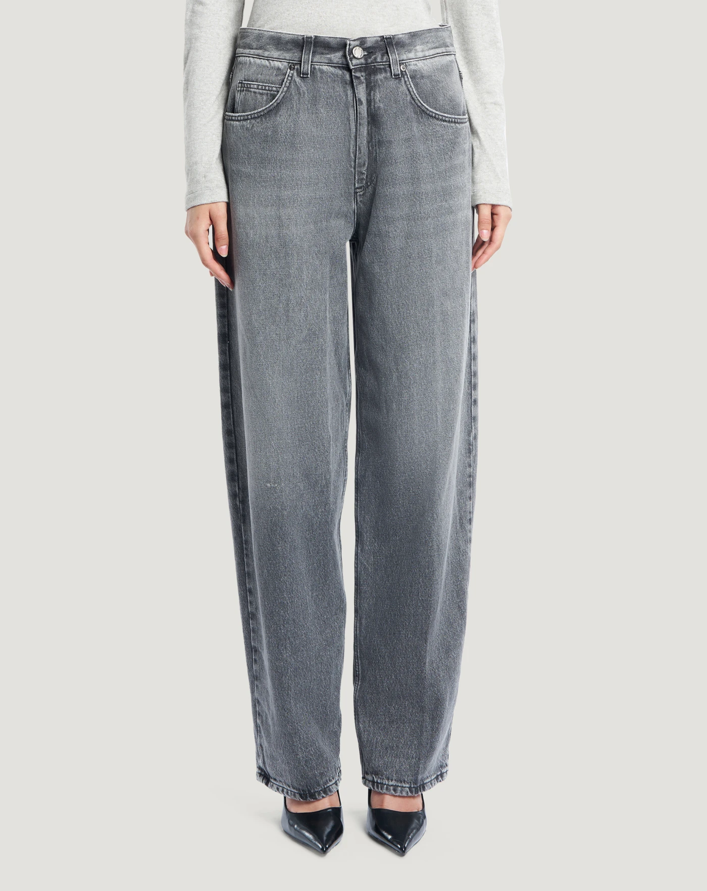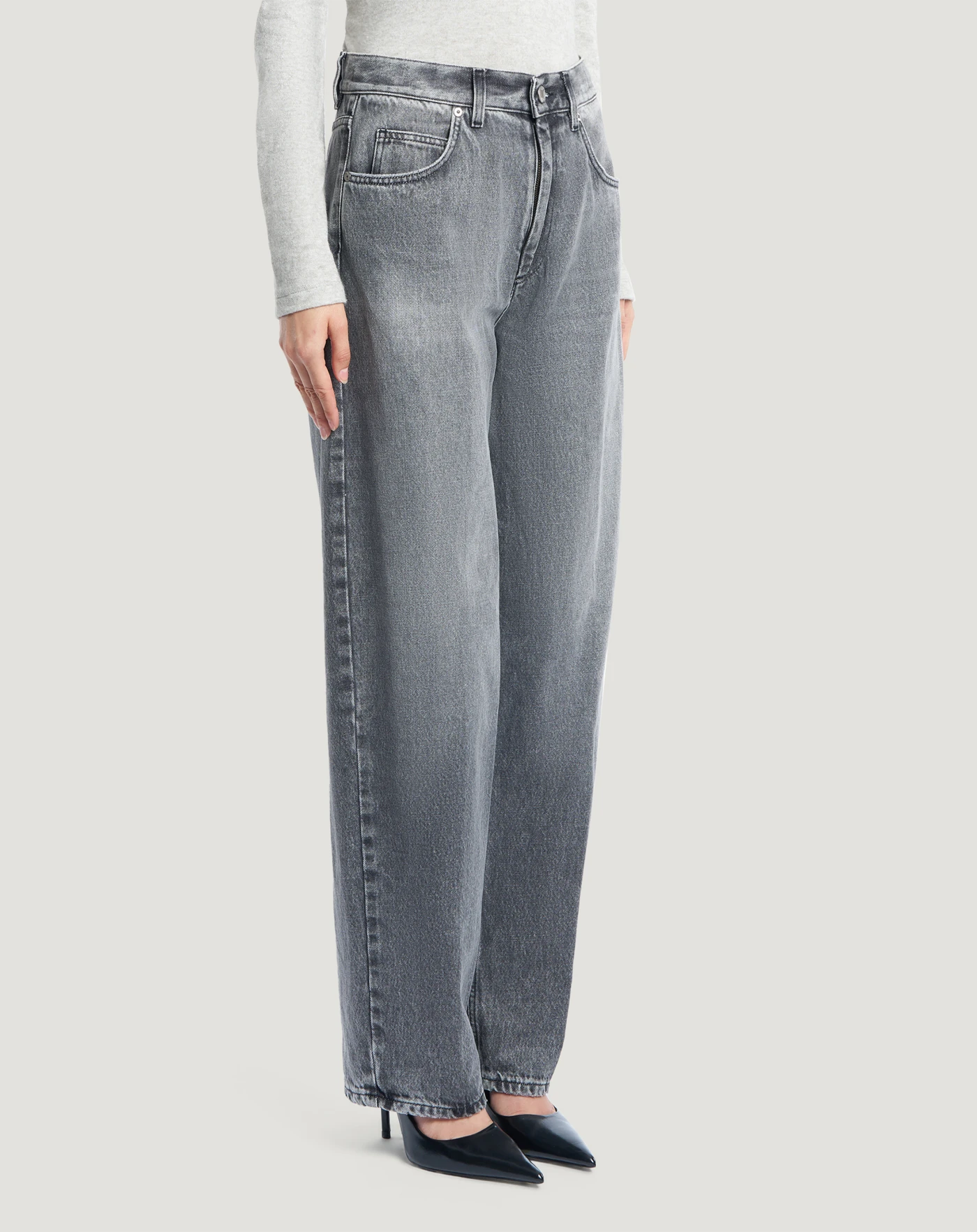 Jeans in black denim di cotone, una tela ferma morbida, leggera (10 once) e piacevole da indossare, con un lavaggio effetto grigio caratterizzato da evidenti schiariture. Con vita alta e linea carrot hanno un'attitudine contemporanea che eleva in un attimo lo stile.