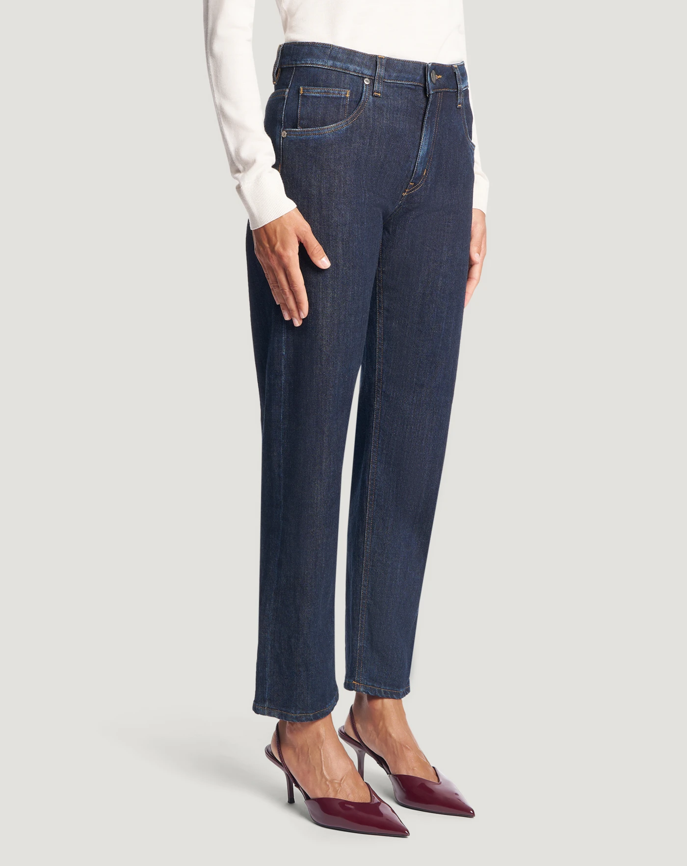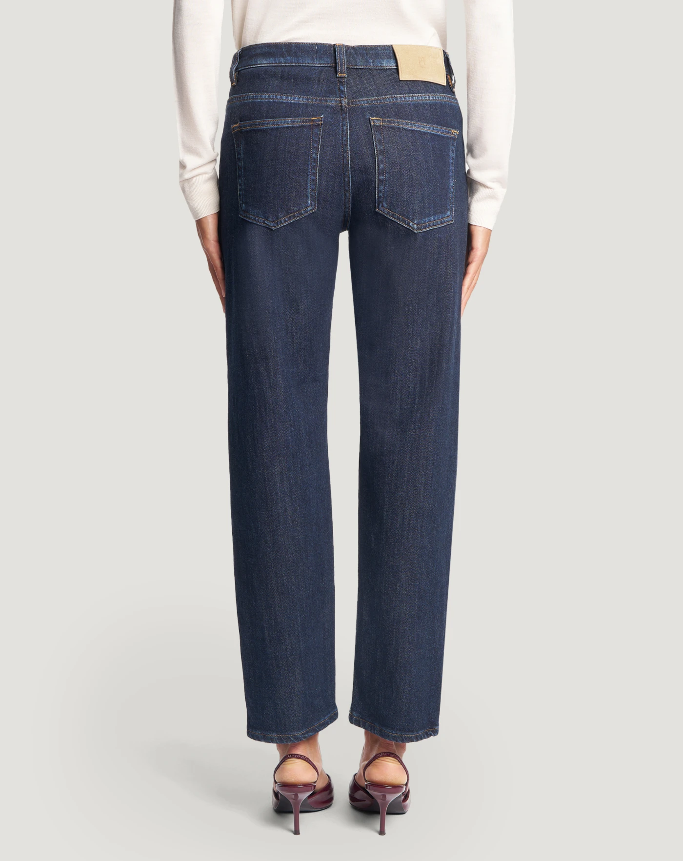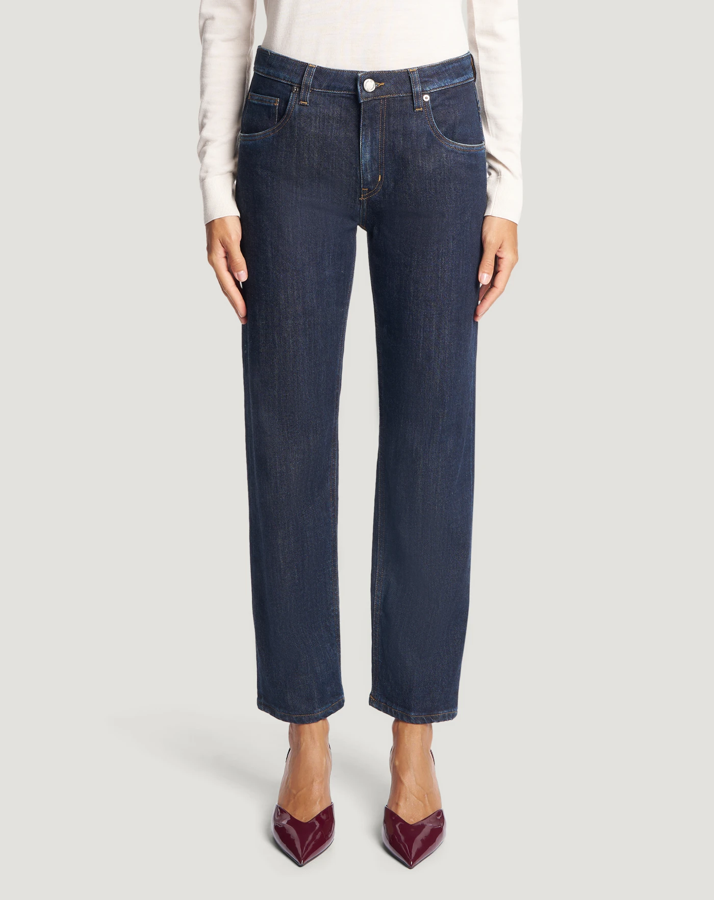 Jeans in denim stretch di cotone e cachemire, una tela soffice e pregiata, dal lavaggio scuro omogeneo per un aspetto elegante e sartoriale.Vita regular e mom carrot fit per un modello adatto a completare anche i look speciali.
