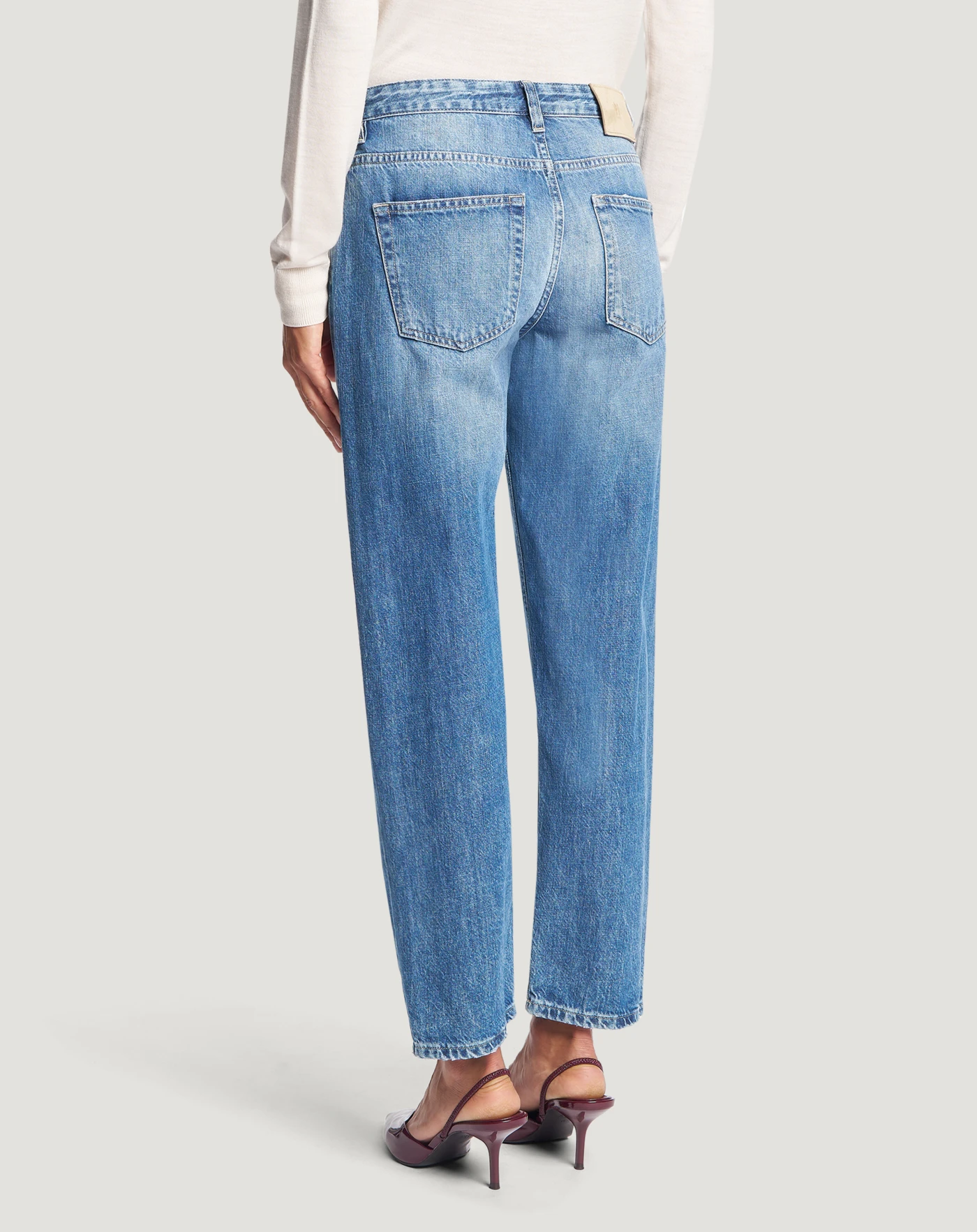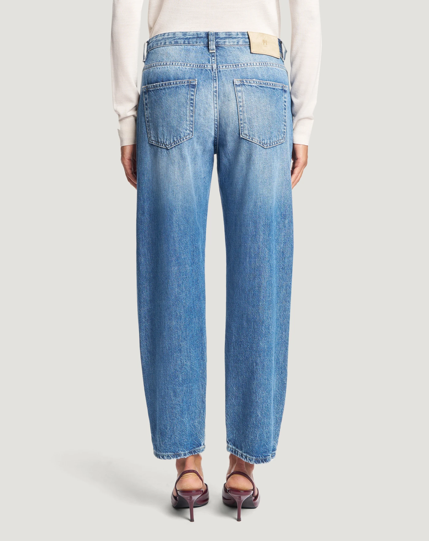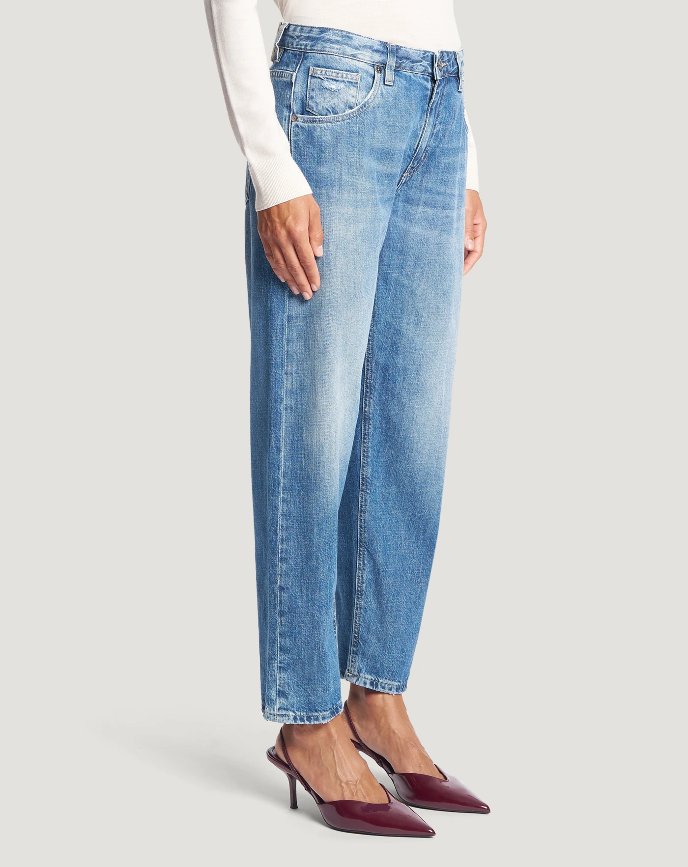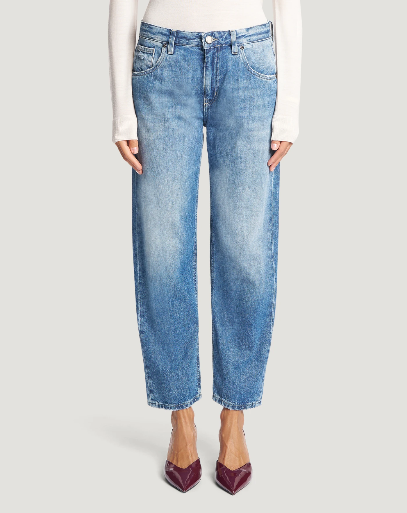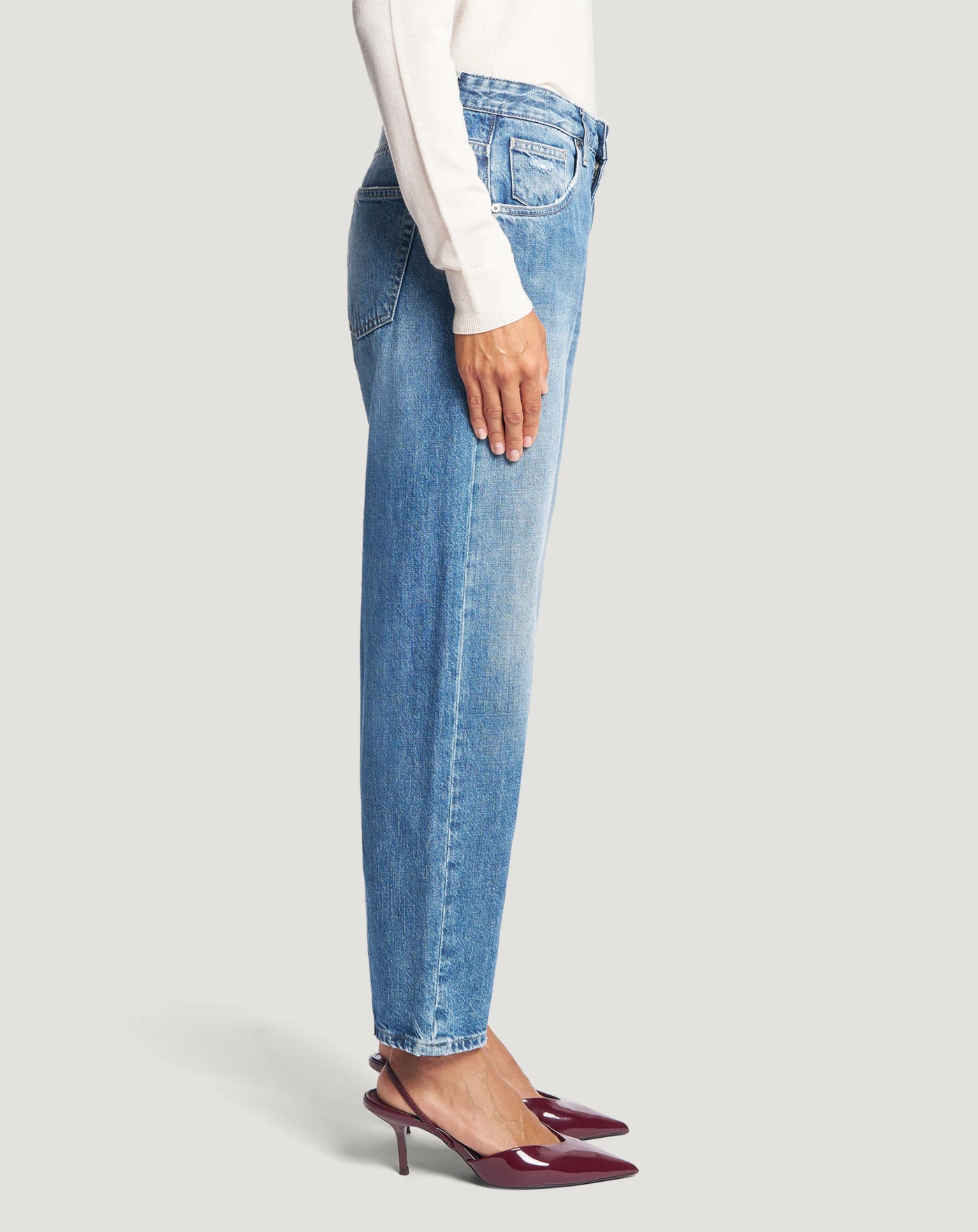 Jeans in denim di cotone una tela ferma confortevole e che dura nel tempo (11 once), con lavaggio caratterizzato da baffi e schiariture localizzate evidenti.Con vita regular e mom carrot fit, daranno personalità ai tuoi look off duty.