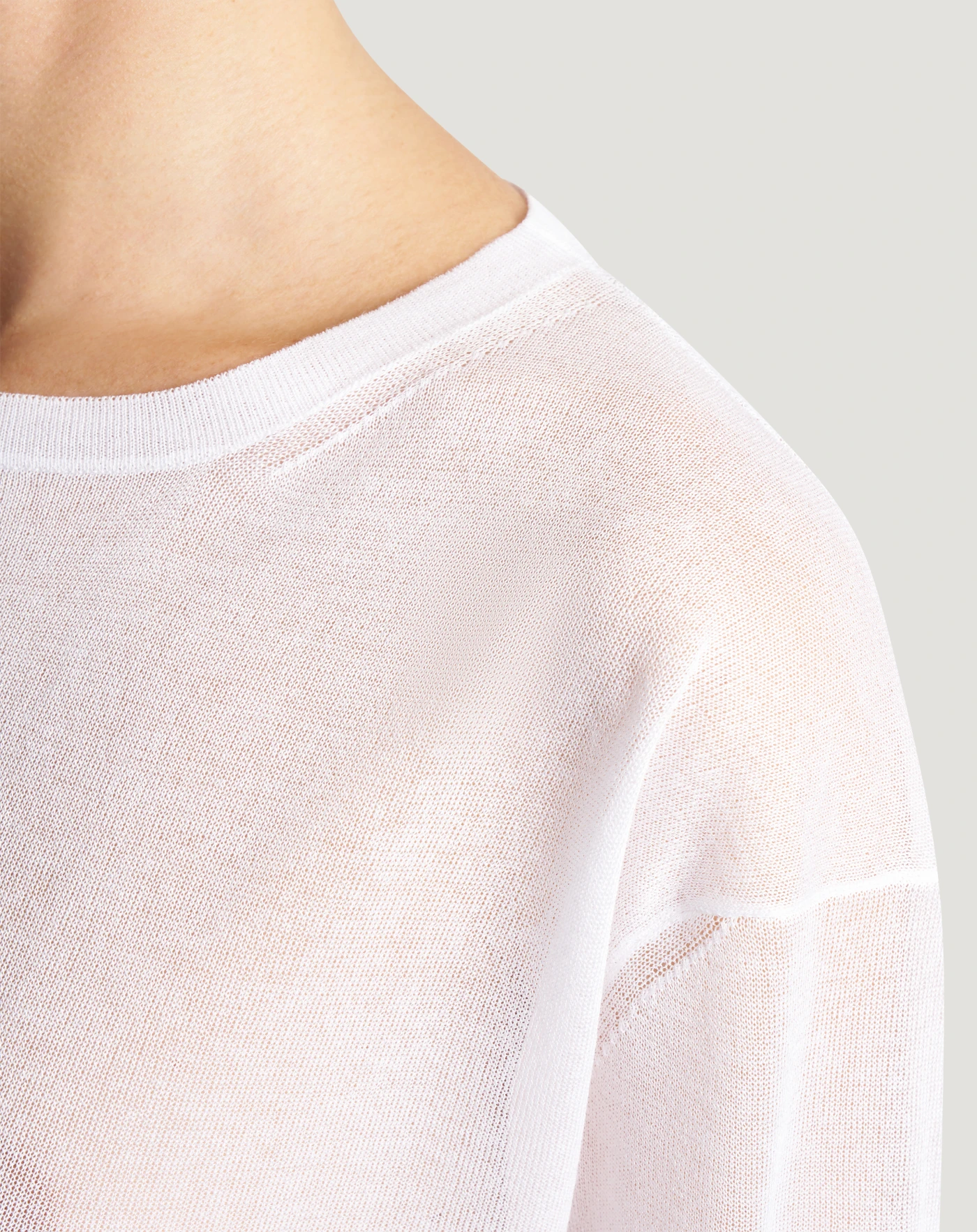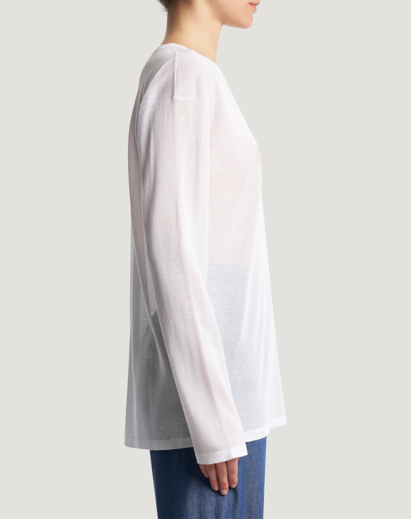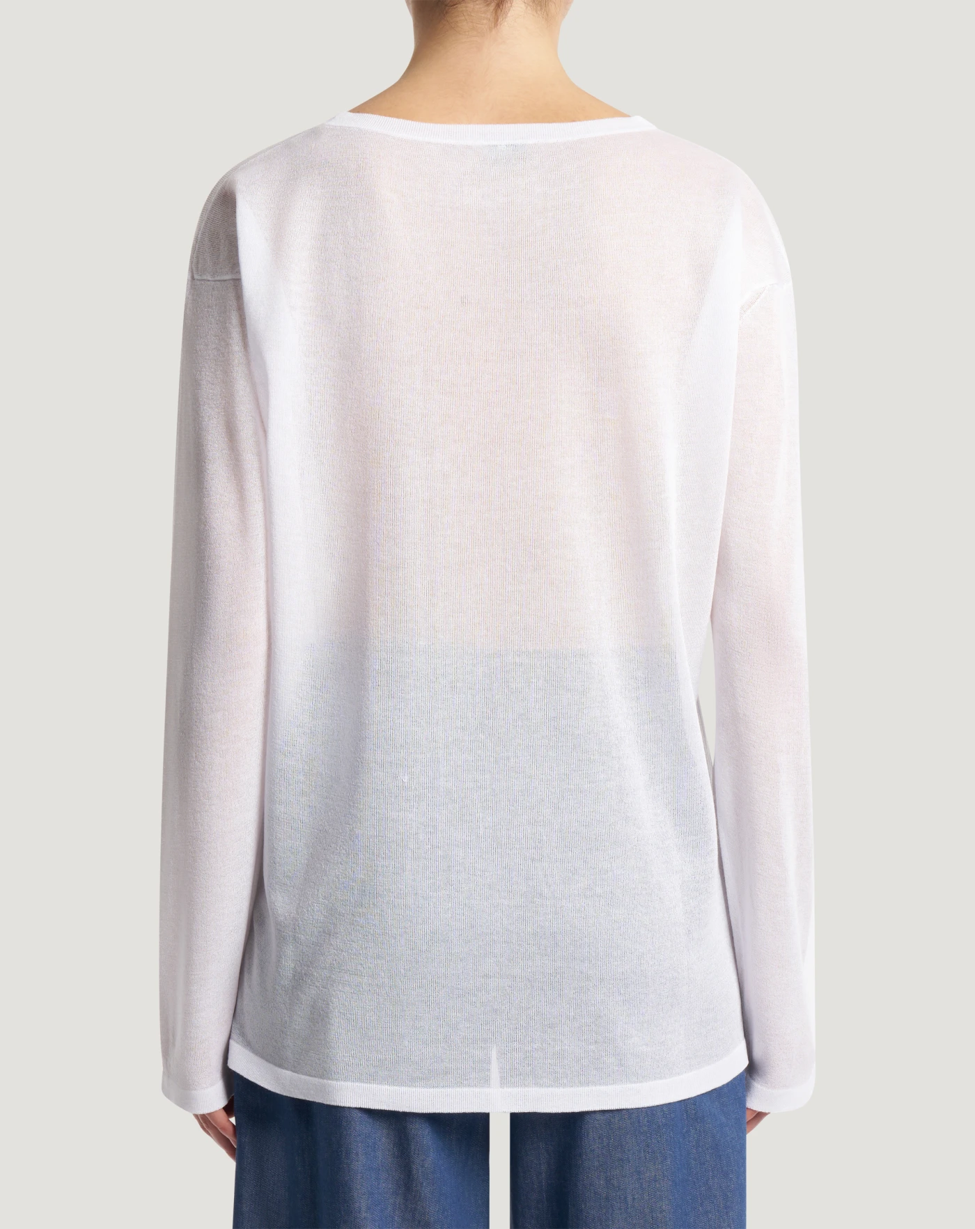 Maglia in filato di viscosa dalla superficie liscia e uniforme, caratterizzato da una mano molto morbida e da una leggera luminosità che dona un aspetto raffinato e contemporaneo. Linea dritta e collo tondo, per un modello impalpabile e facile da abbinare.