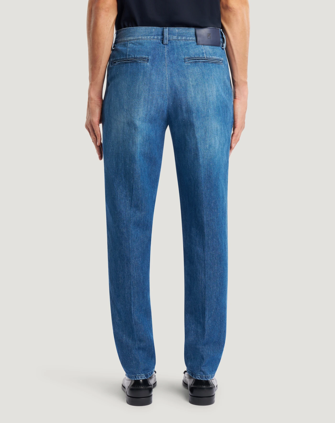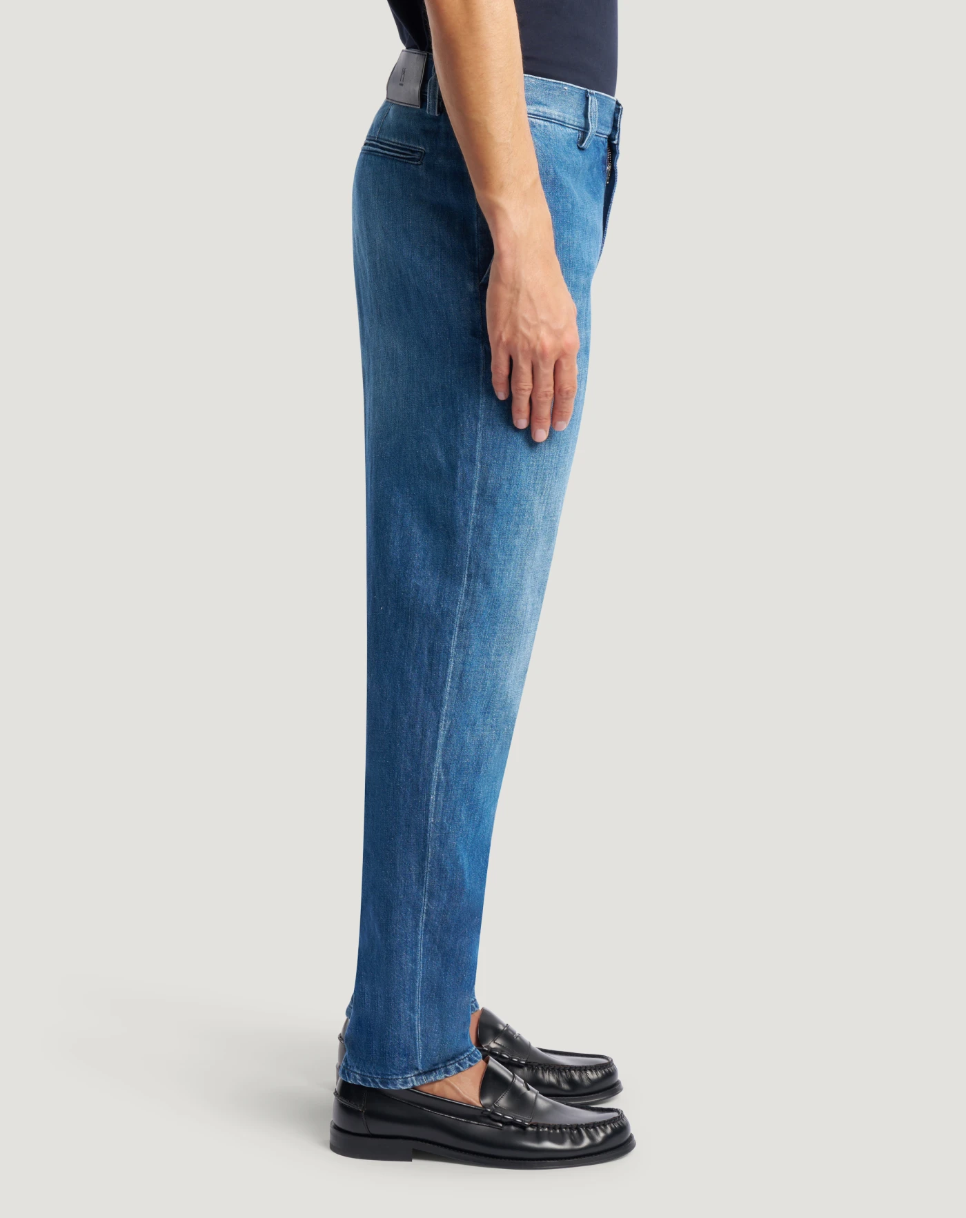 Pantalone in denim leggero realizzato con una miscela di cotone e lino, che conferisce al tessuto un aspetto naturale, una mano fresca e una traspirabilità superiore rispetto al denim tradizionale. Con linea tapered e vita regular, elevano lo stile dei look on e off duty.