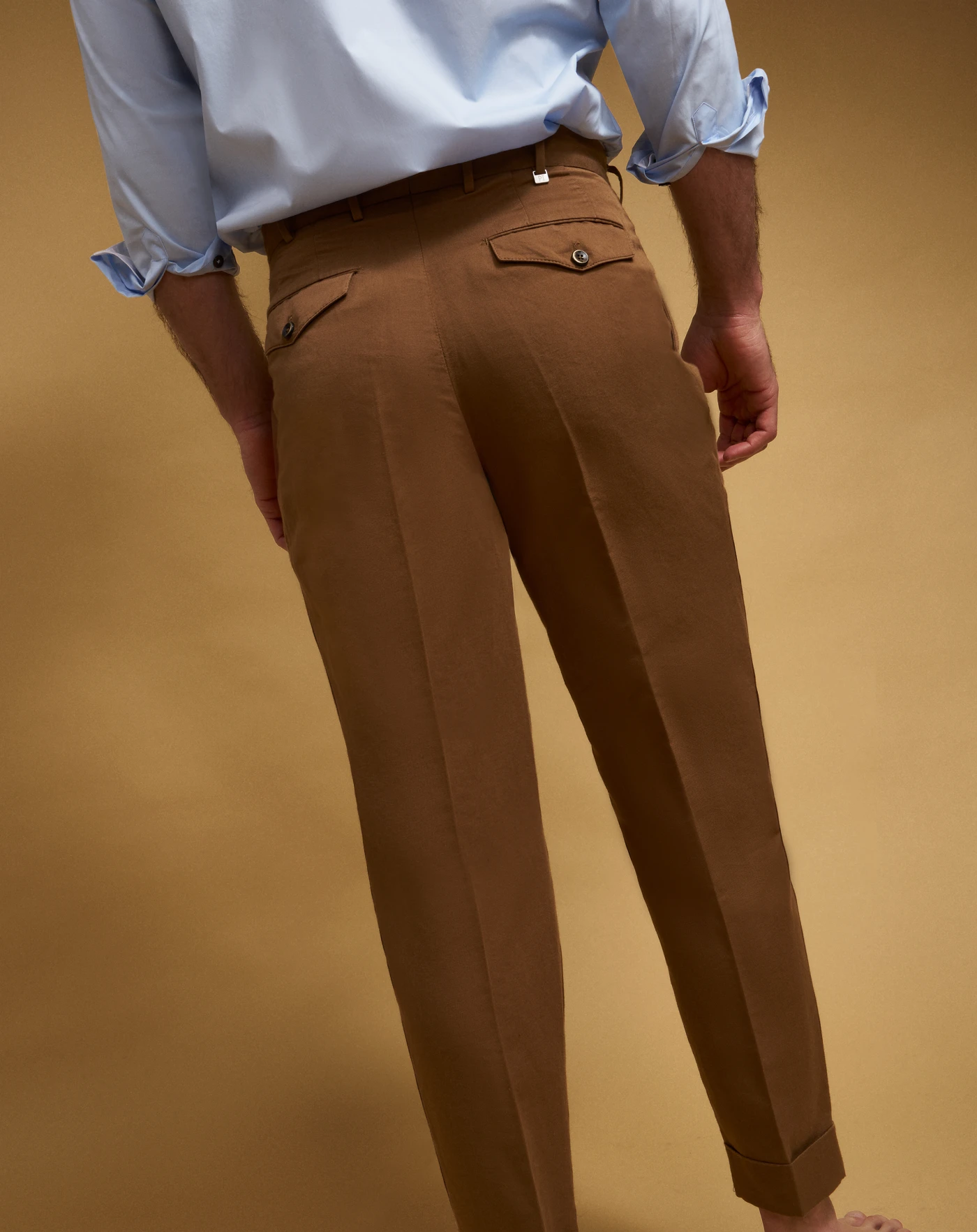 Pantaloni in twill di cotone e lino lavato, un tessuto leggero caratterizzato da una trama diagonale fine che dona struttura mantenendo una mano fresca e naturale. Con due pieghe davanti e risvolto al fondo, in variante marrone sono perfetti per look casual d'impatto.