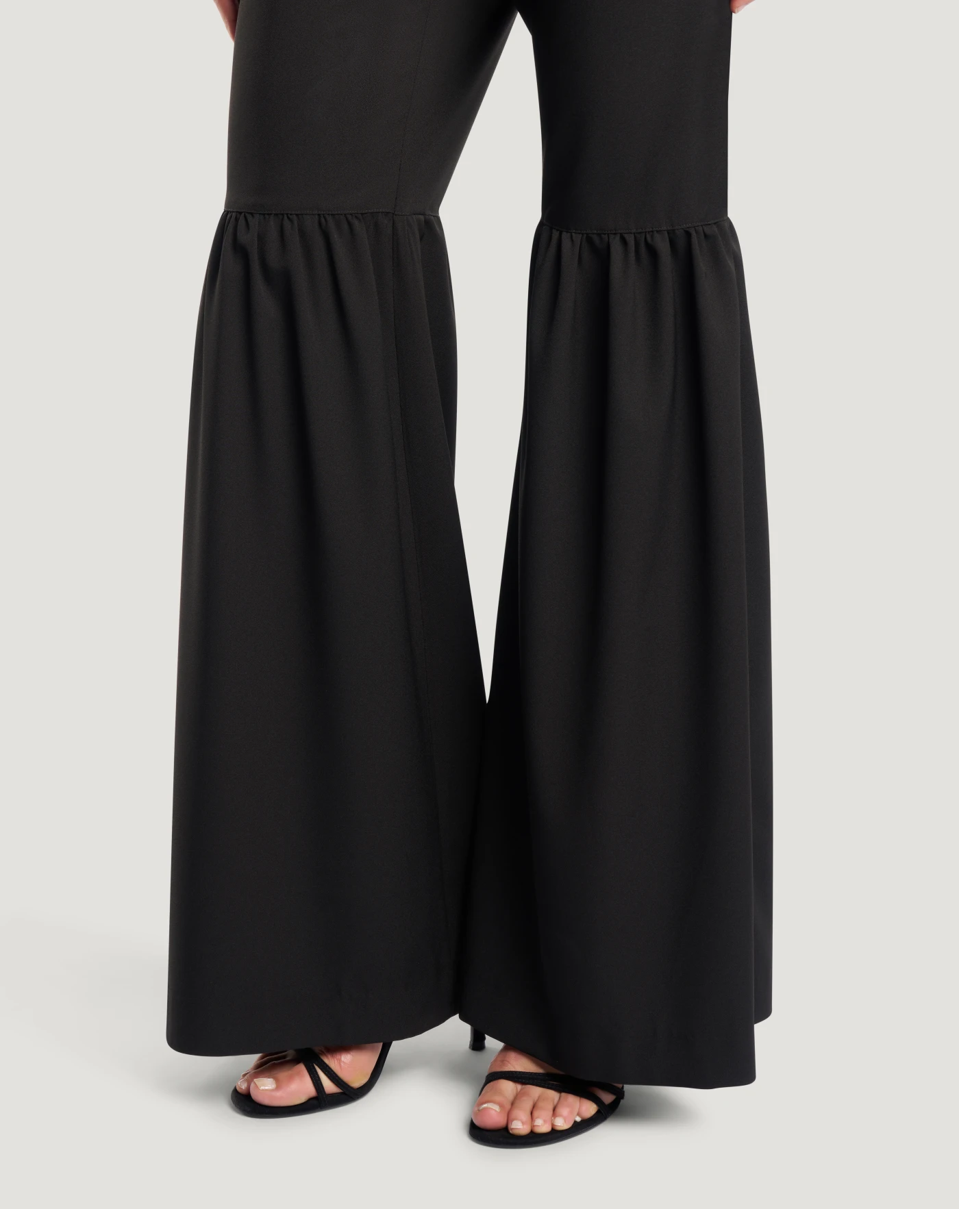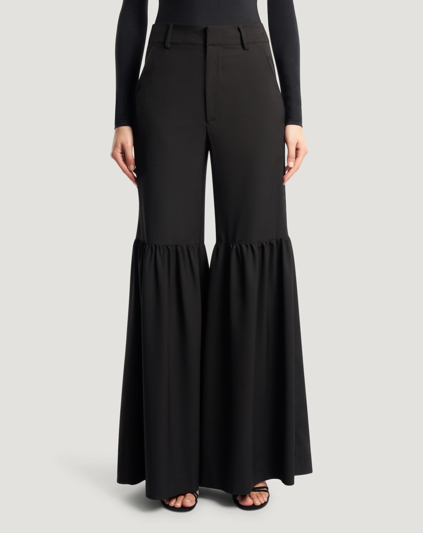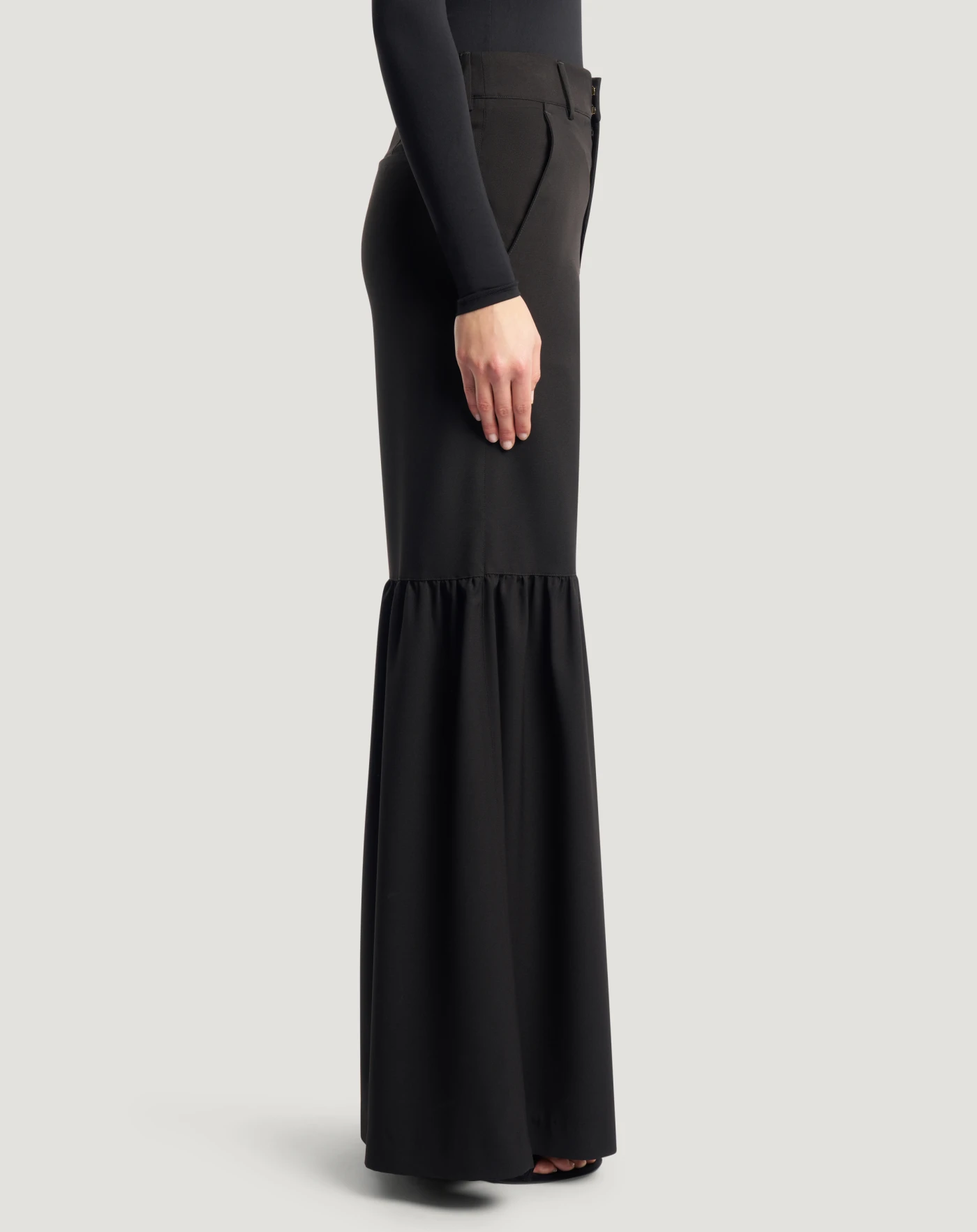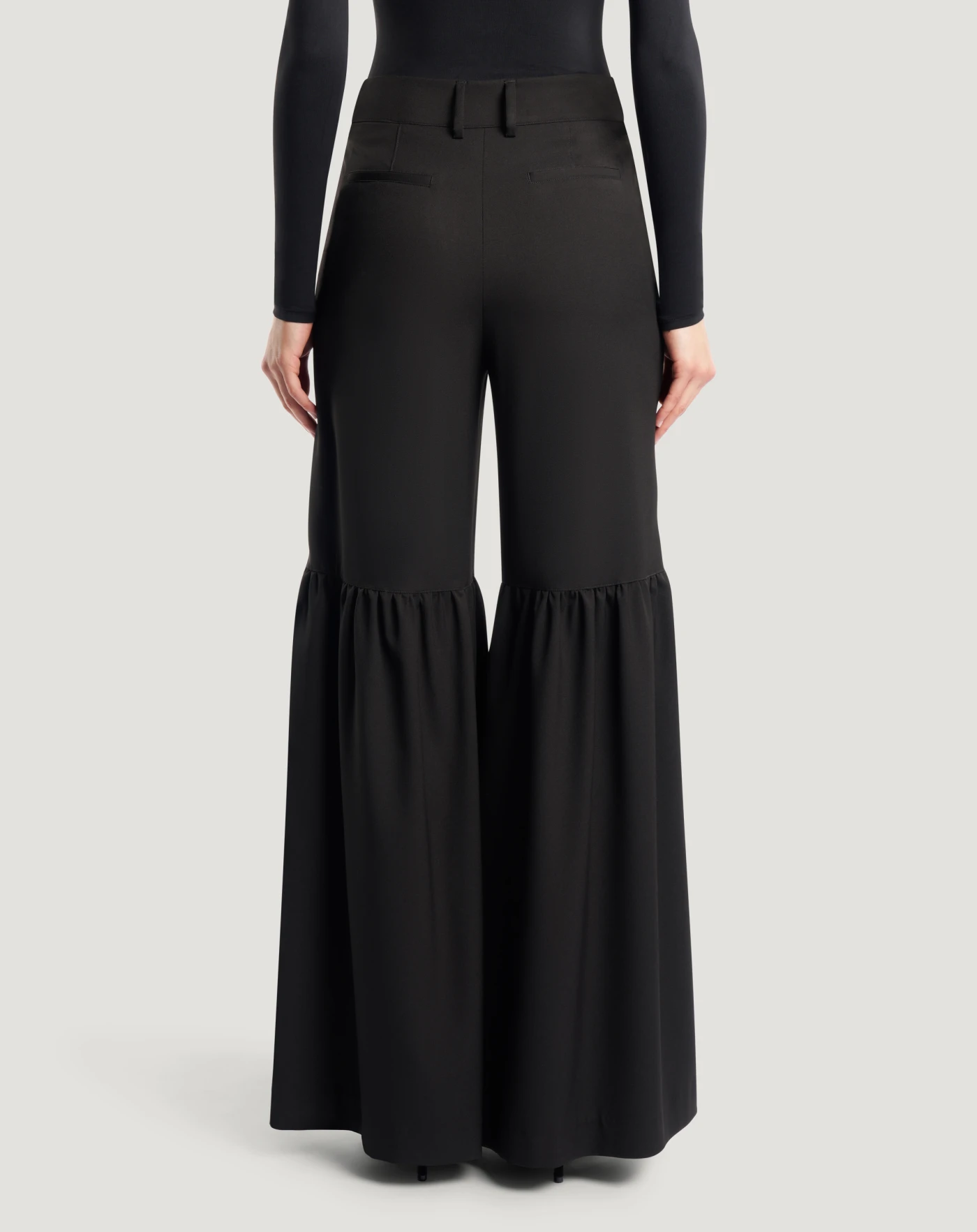 Pantaloni in cady stretch un tessuto elegante e compatto, caratterizzato da una mano piena ma fluida. Il design con vita alta e balza al ginocchio lo rende un modello inedito e femminile, che lascia il segno.