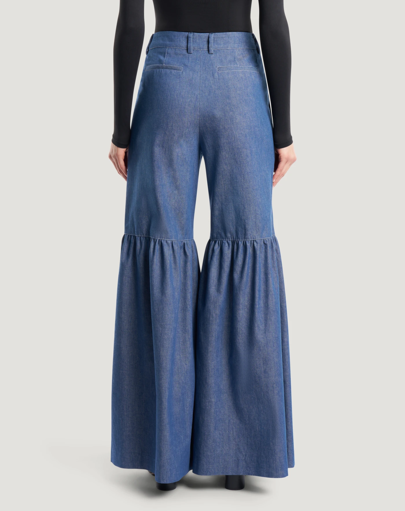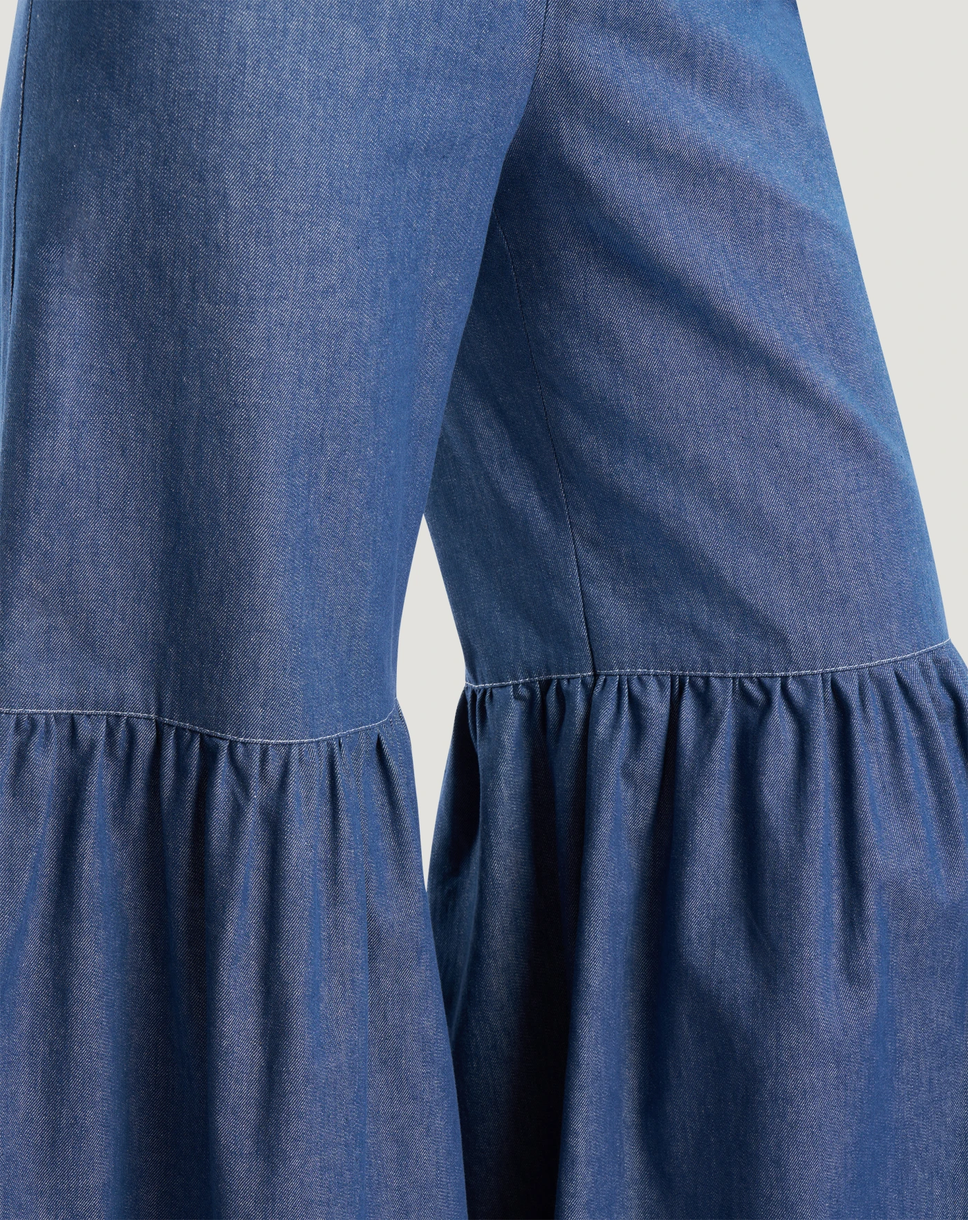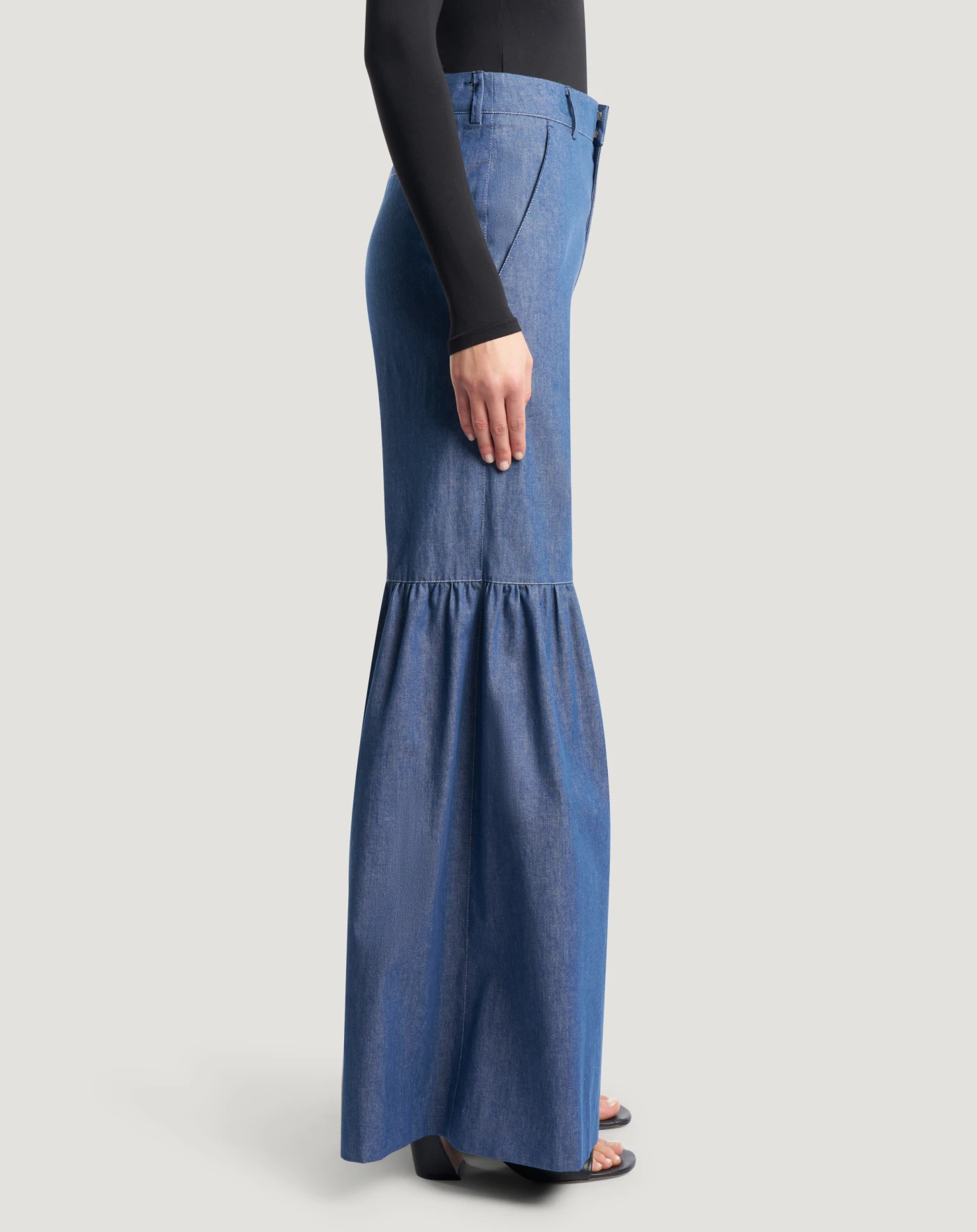 Pantaloni in denim di cotone riciclato dalla tela leggera, perfetta per la stagione. Il design con vita alta e balza al ginocchio lo rende un modello inedito e femminile, che lascia il segno.