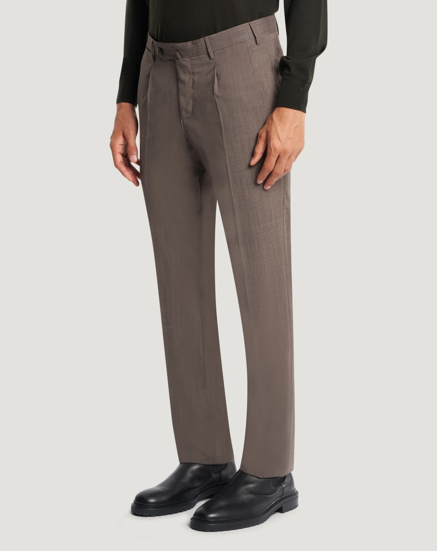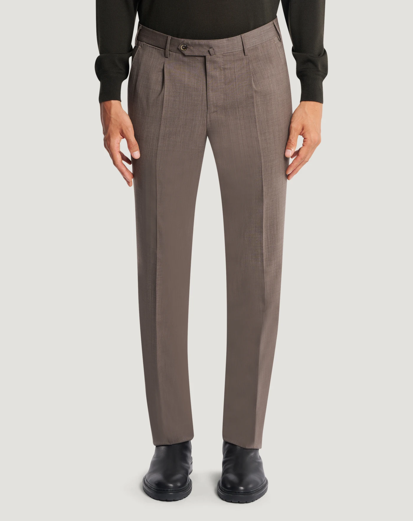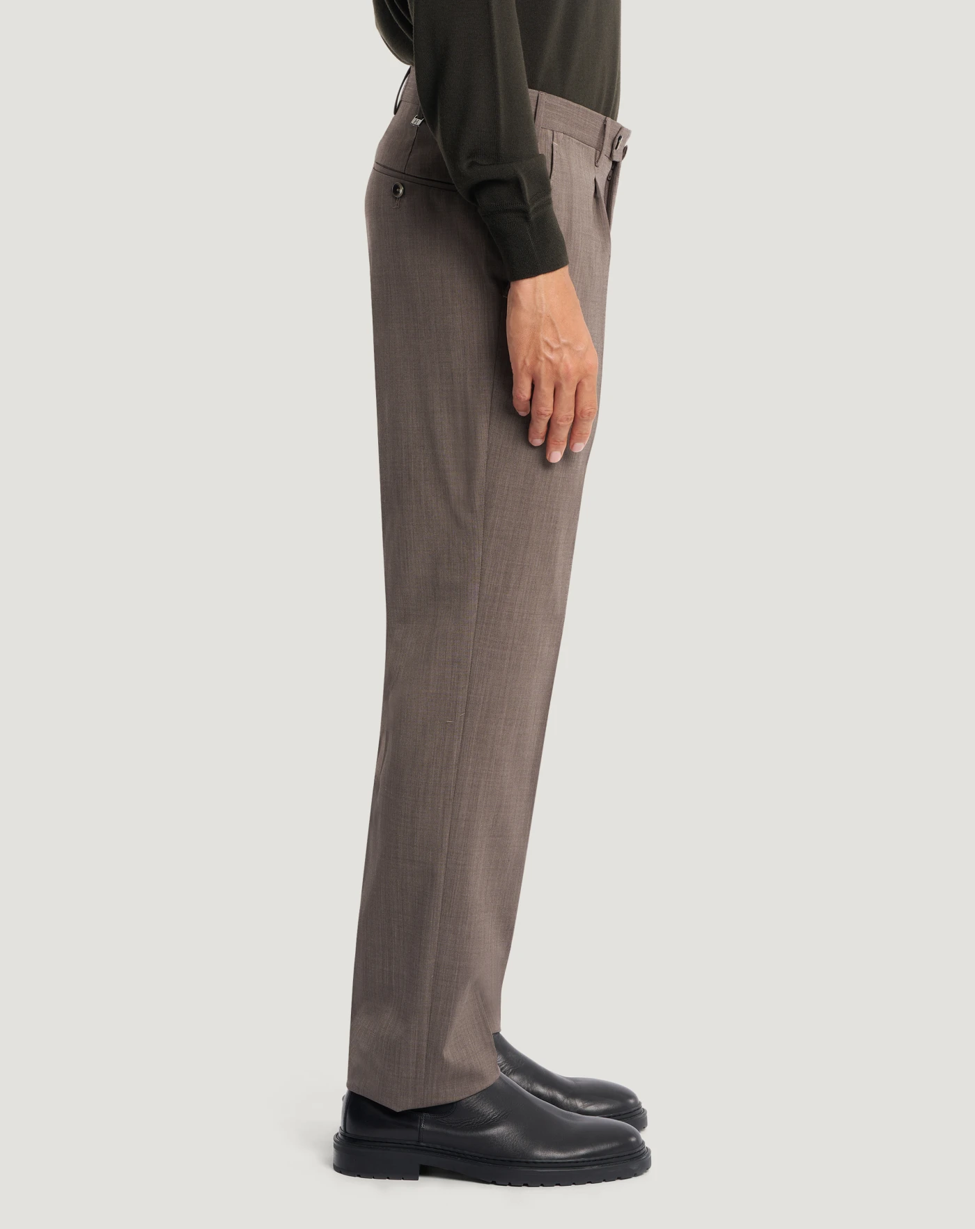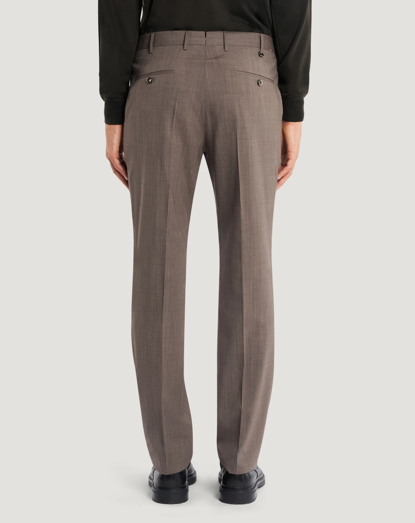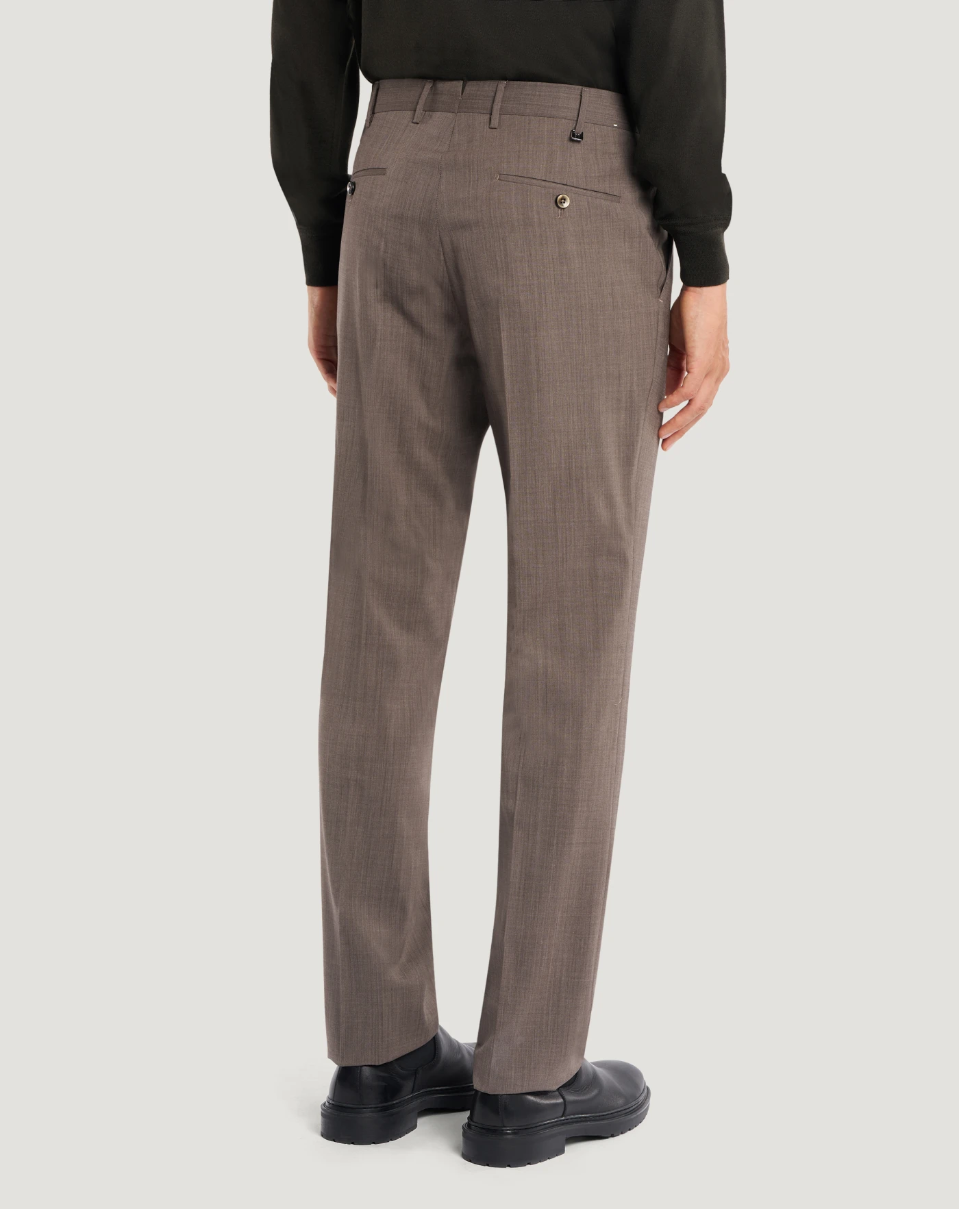 Pantaloni in lana four season un tessuto stretch a trama tela, pensato per un utilizzo quattro stagioni. Leggero ma strutturato, combina comfort e praticità con un aspetto pulito ed essenziale.Il modello viene consegnato sfilato, da rifinire con un semplice intervento di sartoria su misura, per adattarlo alle tue esigenze di lunghezza e stile.Con piega davanti e linea dritta, in variante nocciola per un'eleganza ricercata.