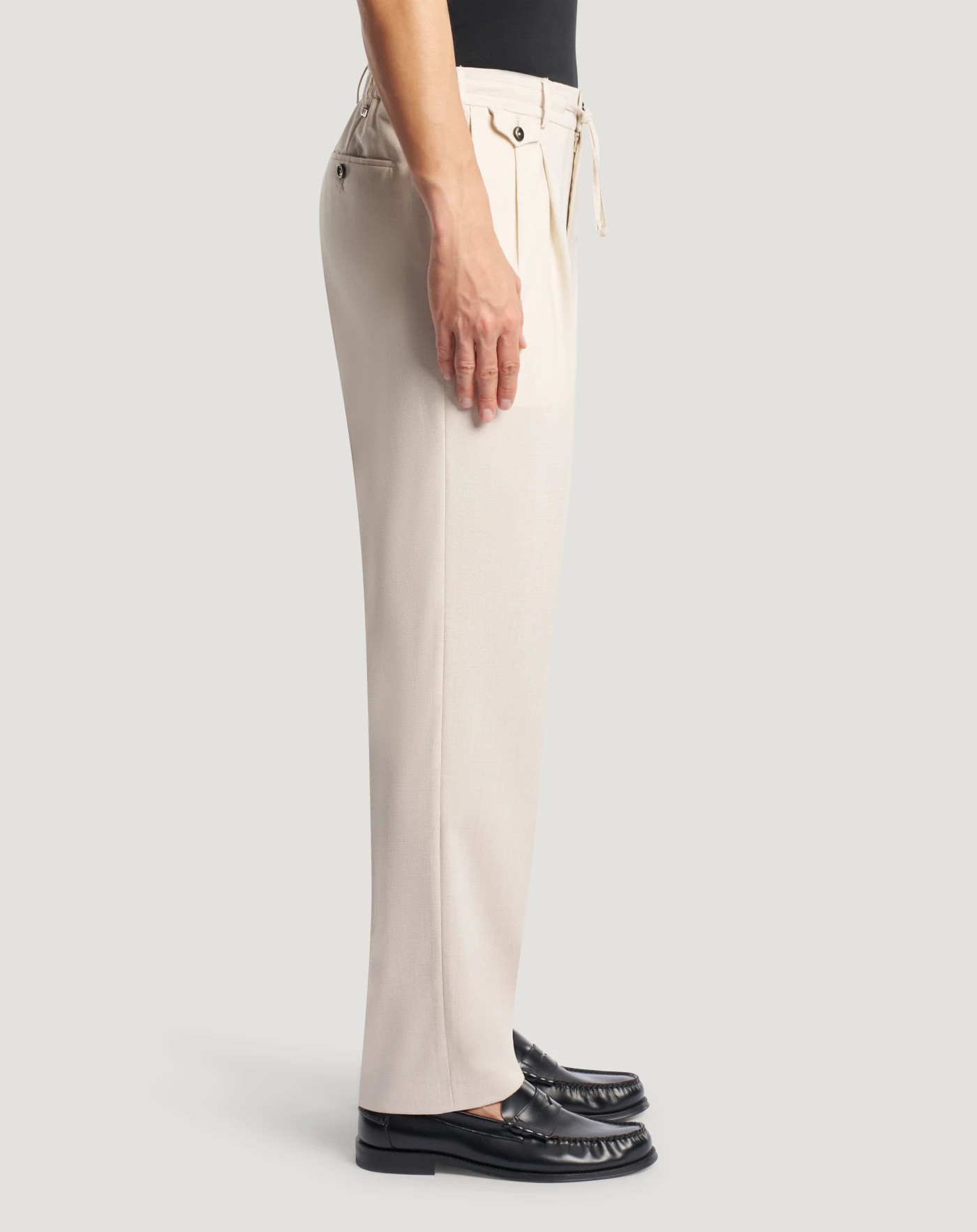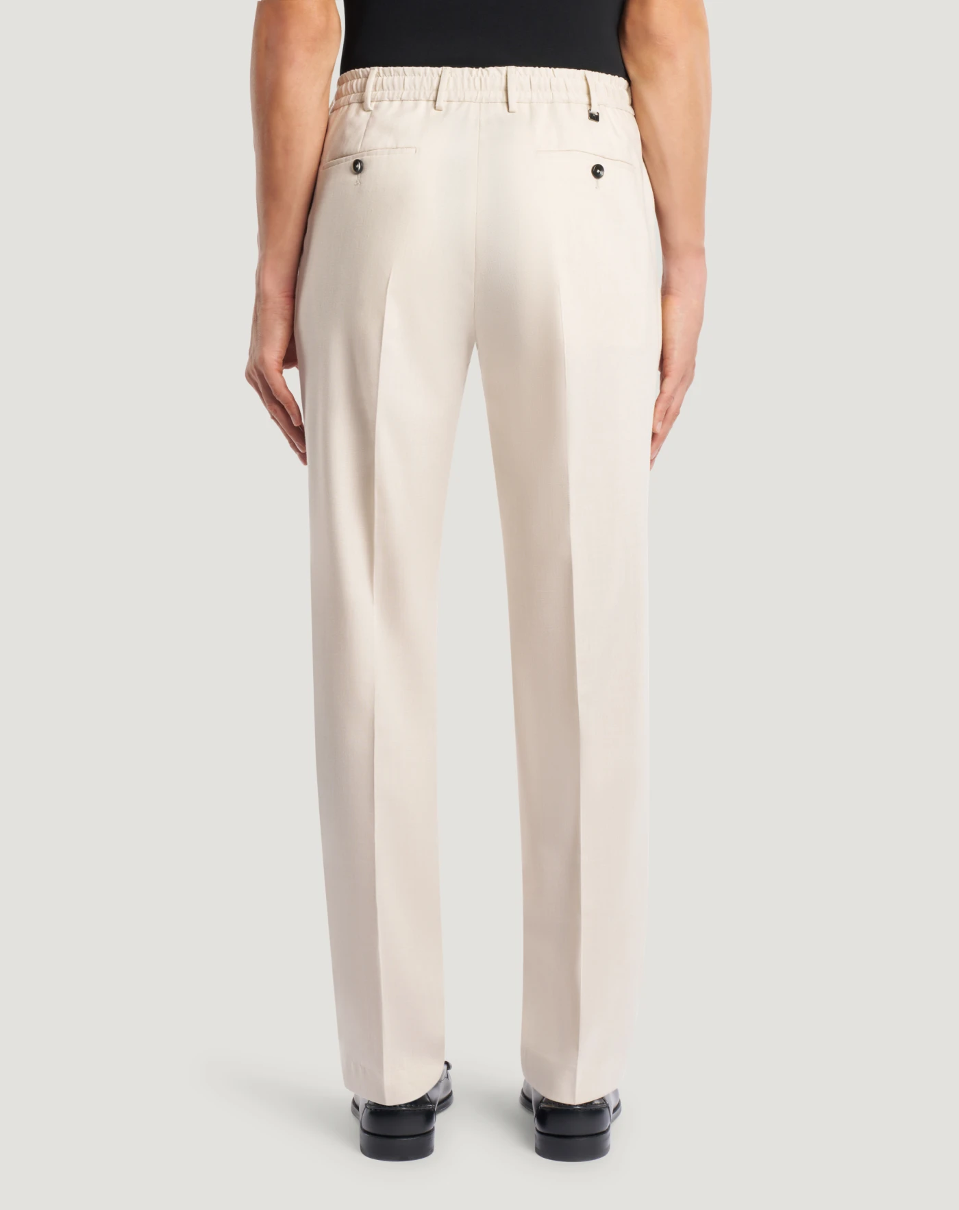 Pantaloni in misto lana traveller stretch, un tessuto leggero e performante, progettato per offrire comfort dinamico, elasticità e praticità d’uso, ideale per chi viaggia o per un uso quotidiano intenso. Il modello viene consegnato sfilato, da rifinire con un semplice intervento di sartoria su misura, per adattarlo alle tue esigenze di lunghezza e stile. Con pieghe, elastico in vita e coulisse per un'eleganza décontracté.