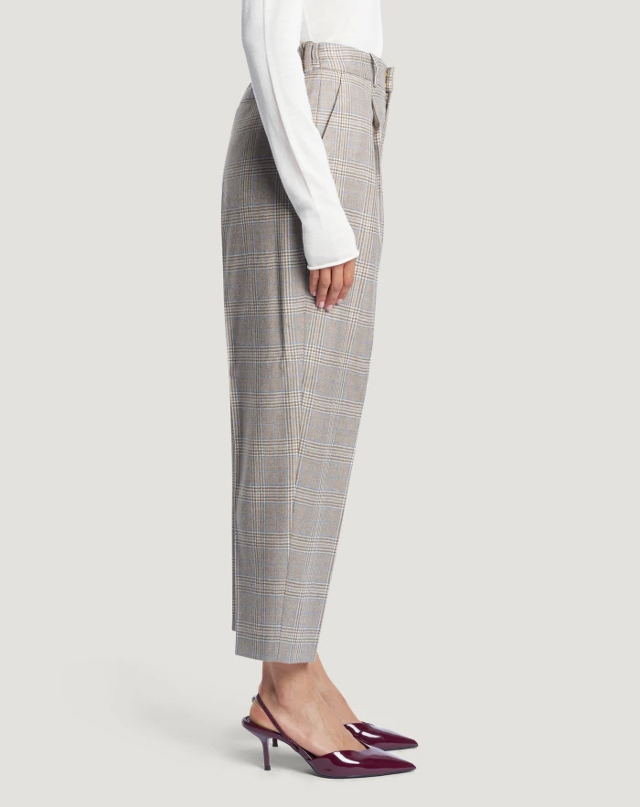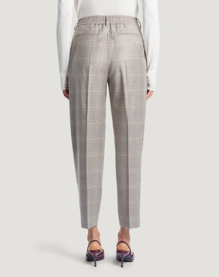 Pantaloni in flanella spazzolata di pura lana, un tessuto morbido, resistente e pregiato, con fantasia check multicolor. Con pieghe al bacino ed elastico sul retro sono facili da indossare e perfetti per look da ufficio e casual.