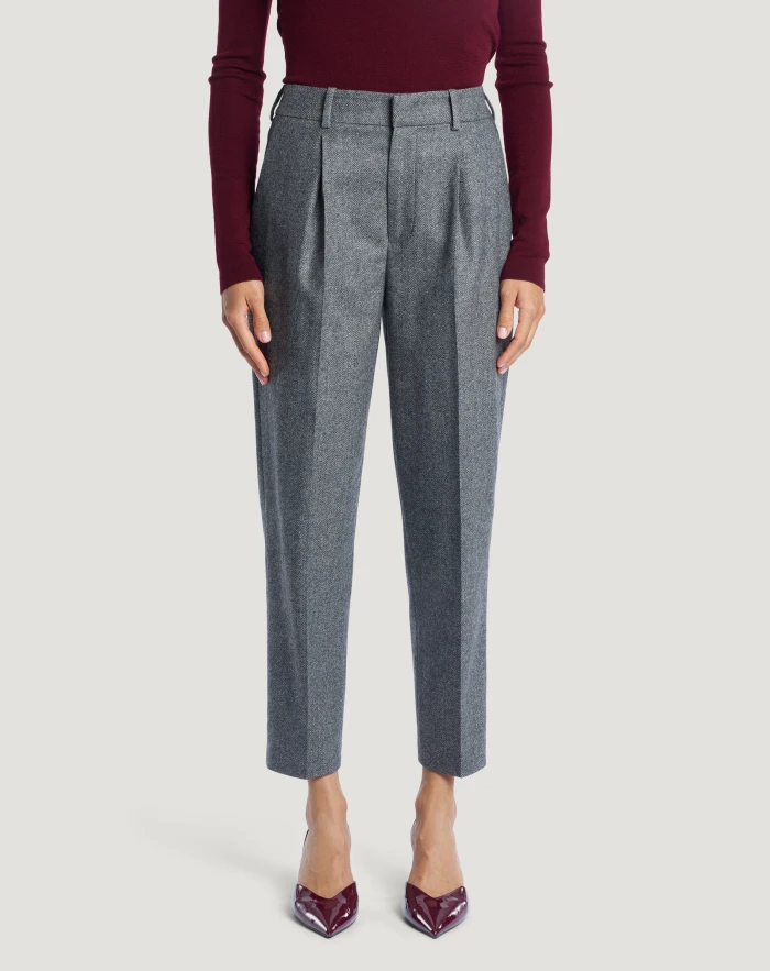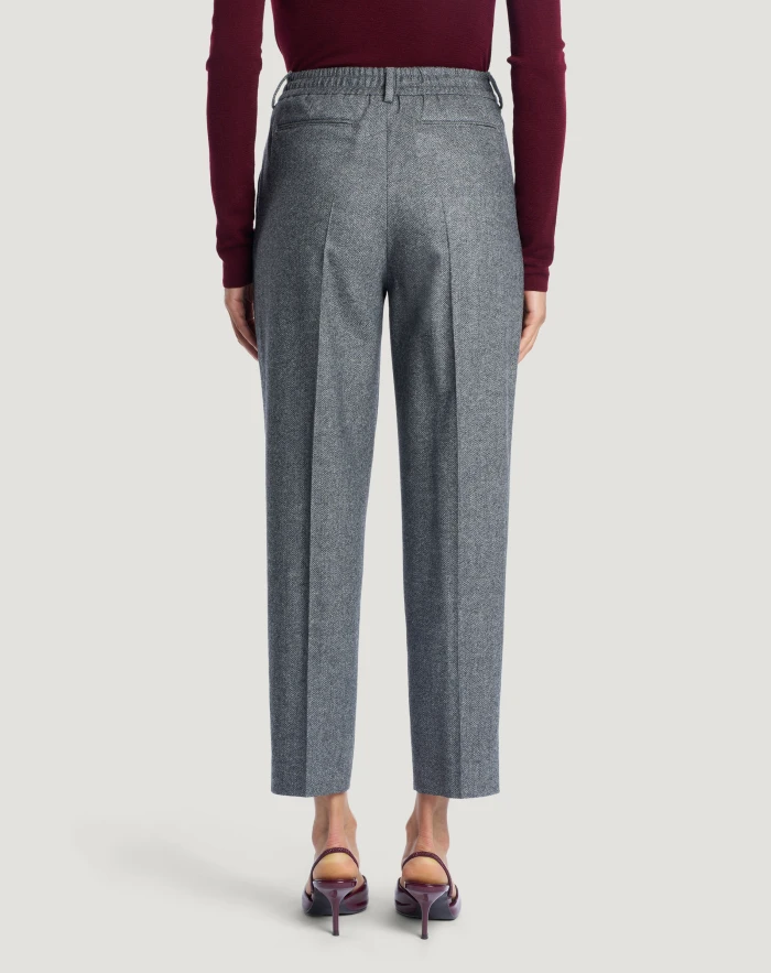 Pantaloni in flanella di lana e cachemire, un tessuto morbido e pregiato con fantasia micro chevron. Il design con pieghe al bacino ed elastico sul retro li rendono un modello quotidiano ed elegante allo stesso tempo.