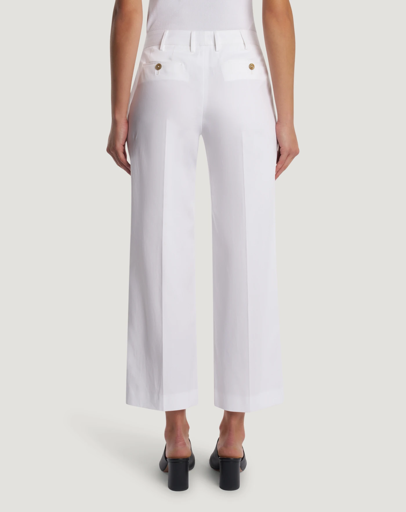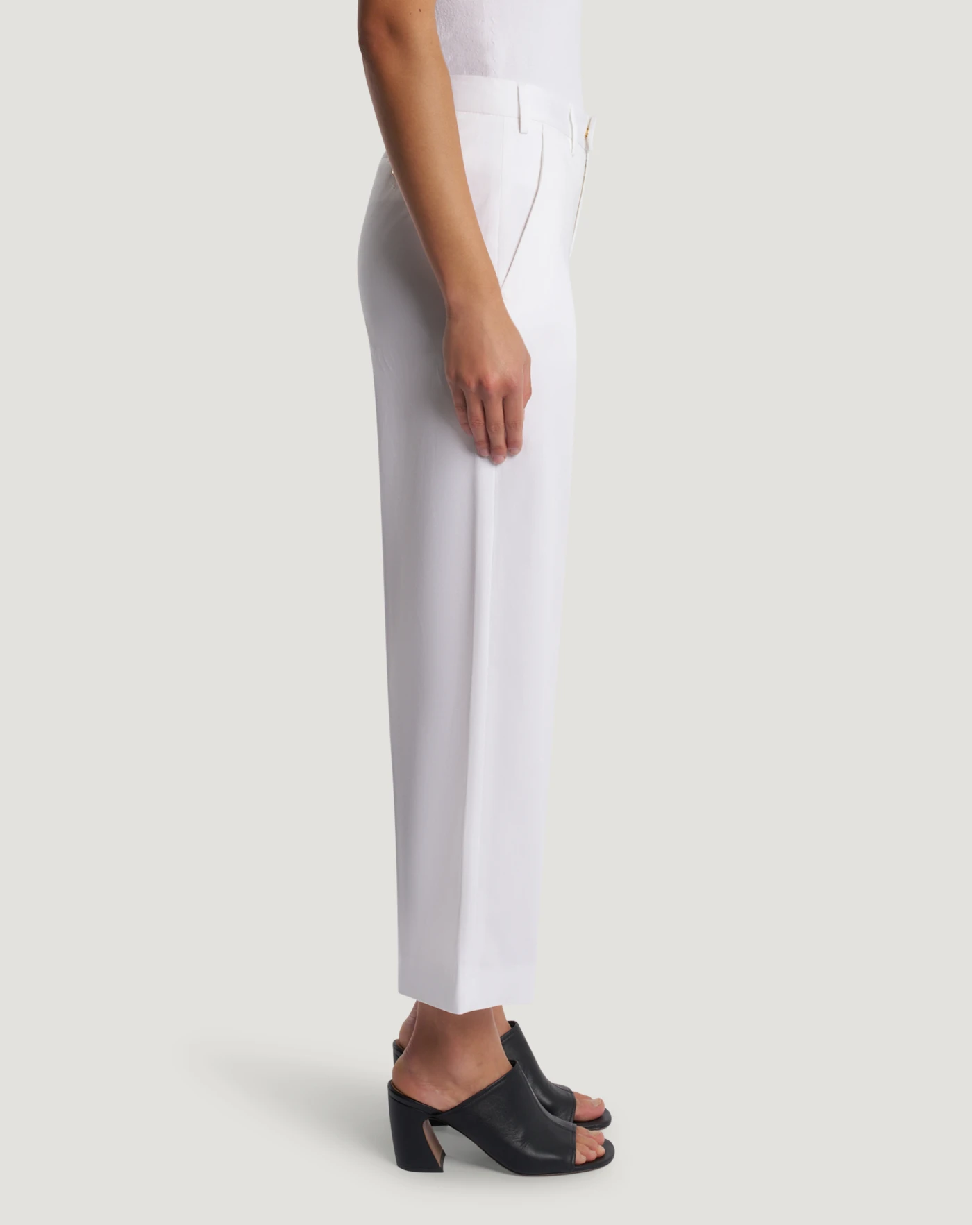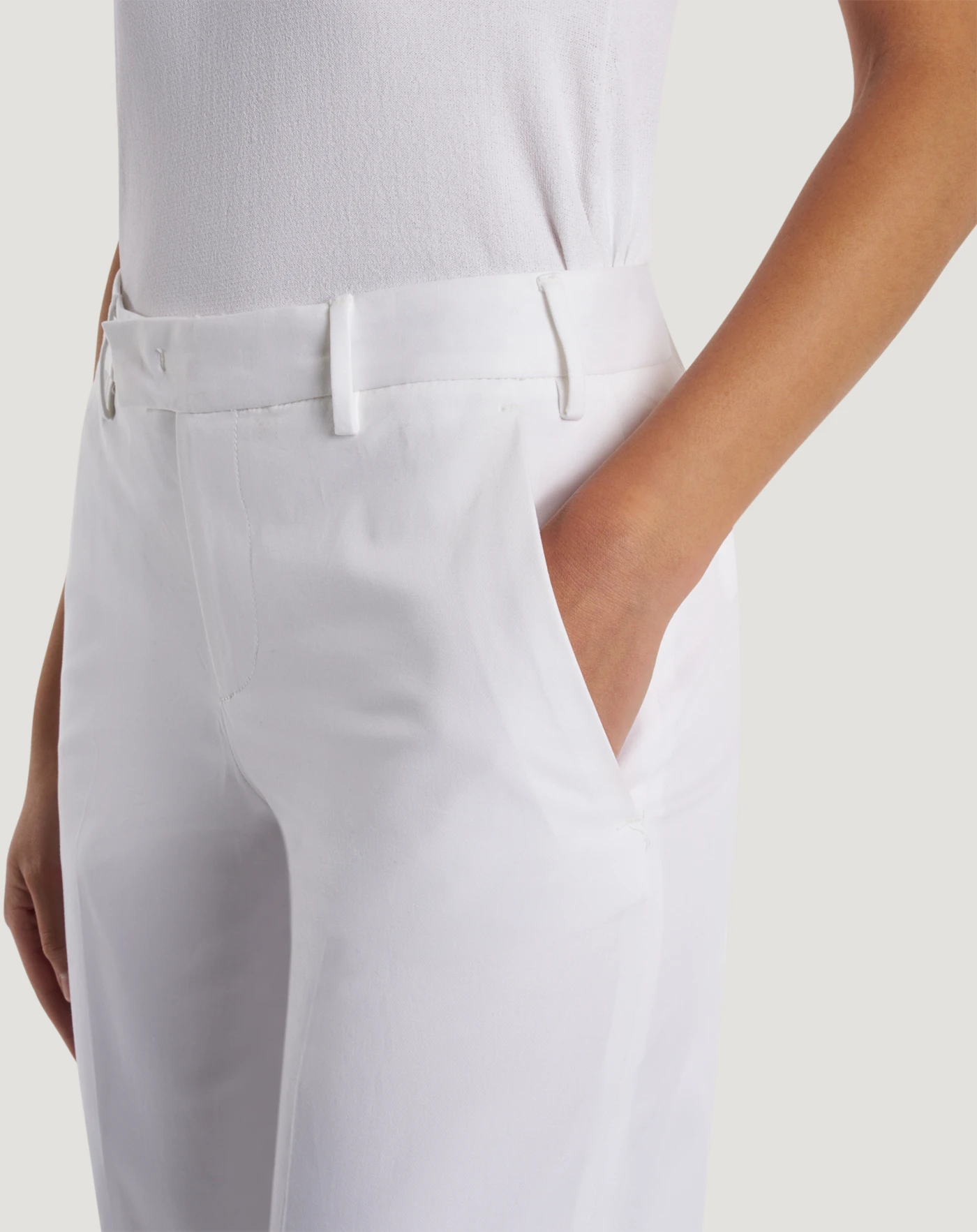 Pantaloni in gabardina di cotone stretch un tessuto perfetto per look versatili dall'aspetto pulito e contemporaneo. Con linea diritta e piega stirata hanno un fascino sartoriale che in bianco completa con stile il tuo look.