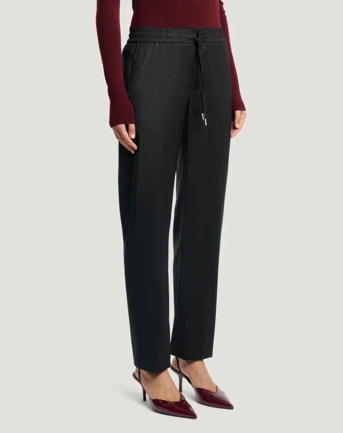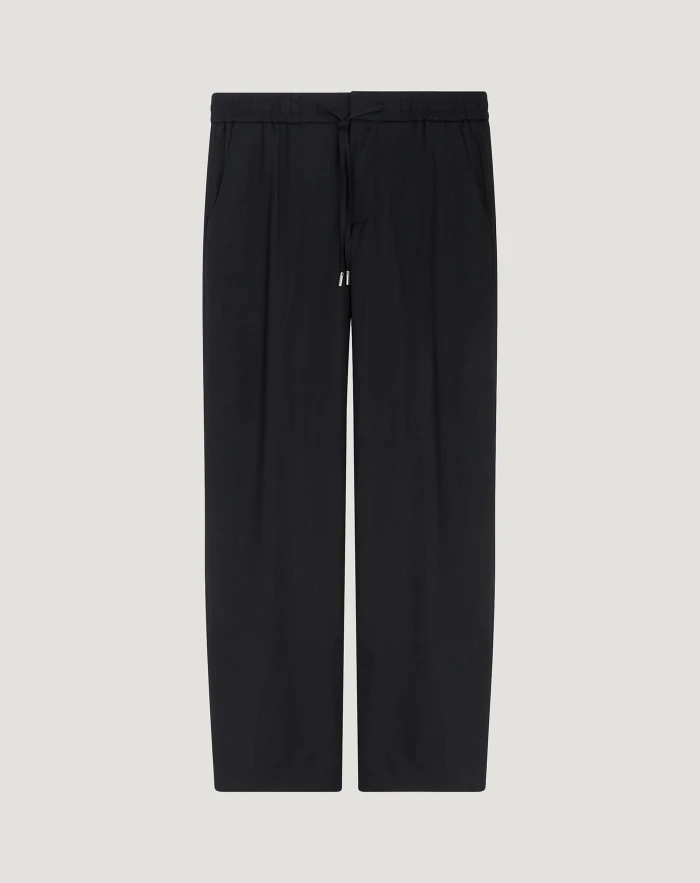 Pantaloni in twill di lana stretch un tessuto pregiato a trama diagonale sottile, caratterizzato da una mano fluida e da una leggera componente stretch che garantisce comfort e libertà di movimento. Linea rilassata con elastico in vita regolabile con coulisse. In nero per dare intensità ai look daily.