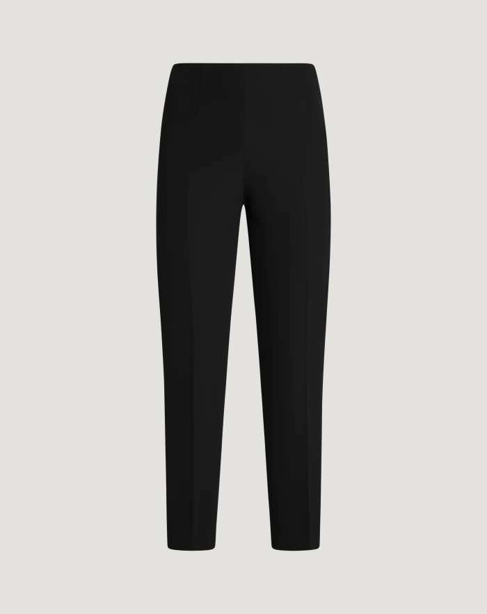 Pantaloni in tricotina stretch fluida, un tessuto molto morbido e piacevole al tatto, che unisce resistenza ed elasticità. Hanno vita alta, linea skinny e spacchetto al fondo sul retro. In variante nero per look raffinati da giorno o da ufficio.