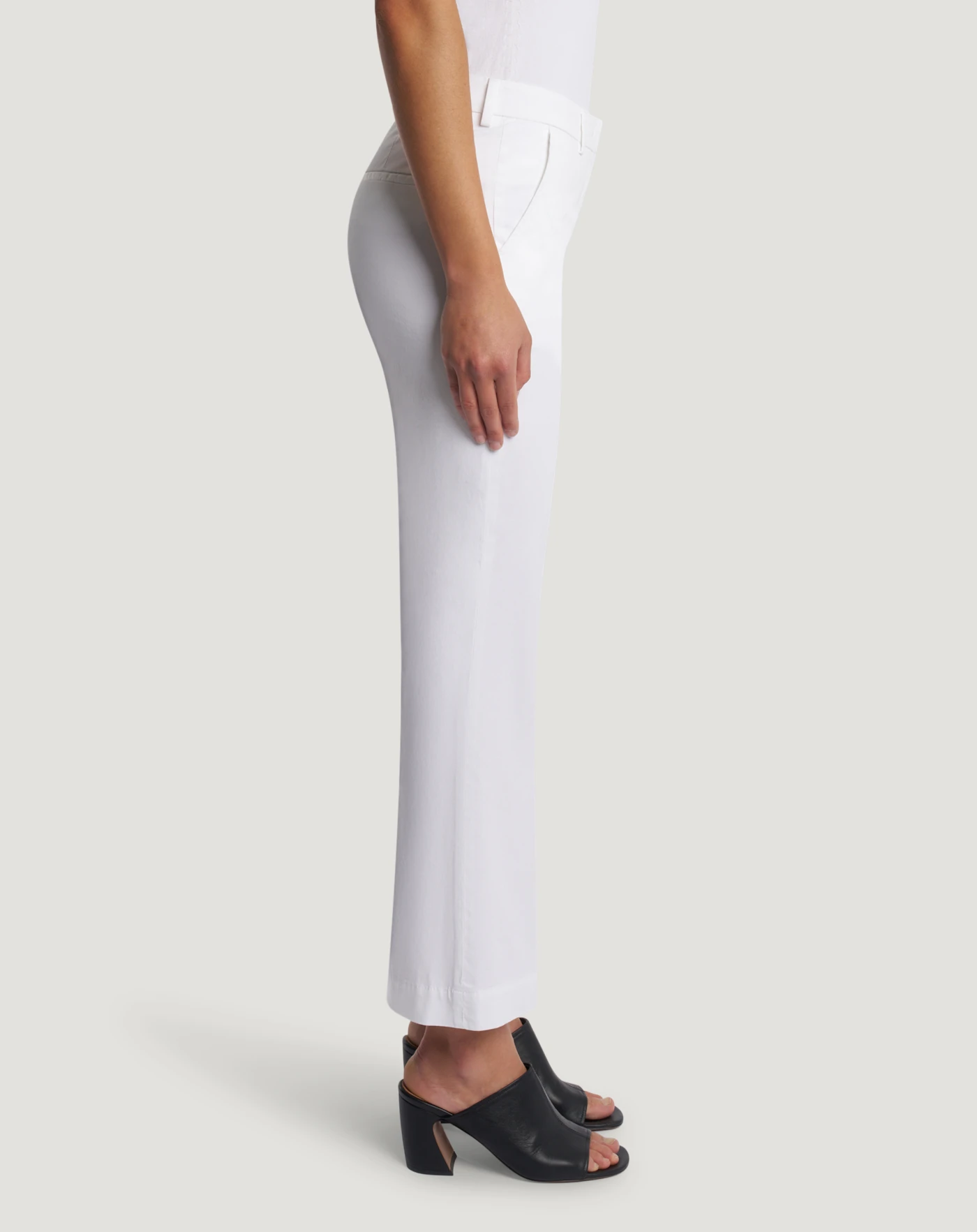 Pantaloni in satin stretch un raso leggero e morbido, caratterizzato da una superficie liscia e leggermente lucida, arricchito da una componente elastica che ne aumenta comfort e libertà di movimento. Con linea flare e lunghezza alla caviglia, scegli il bianco per un modello versatile del guardaroba.