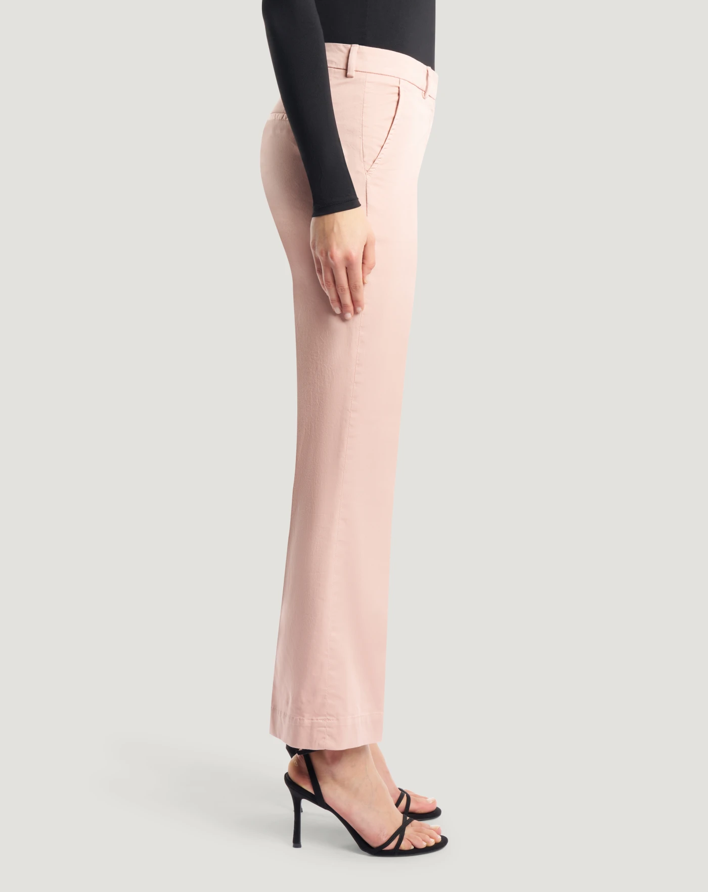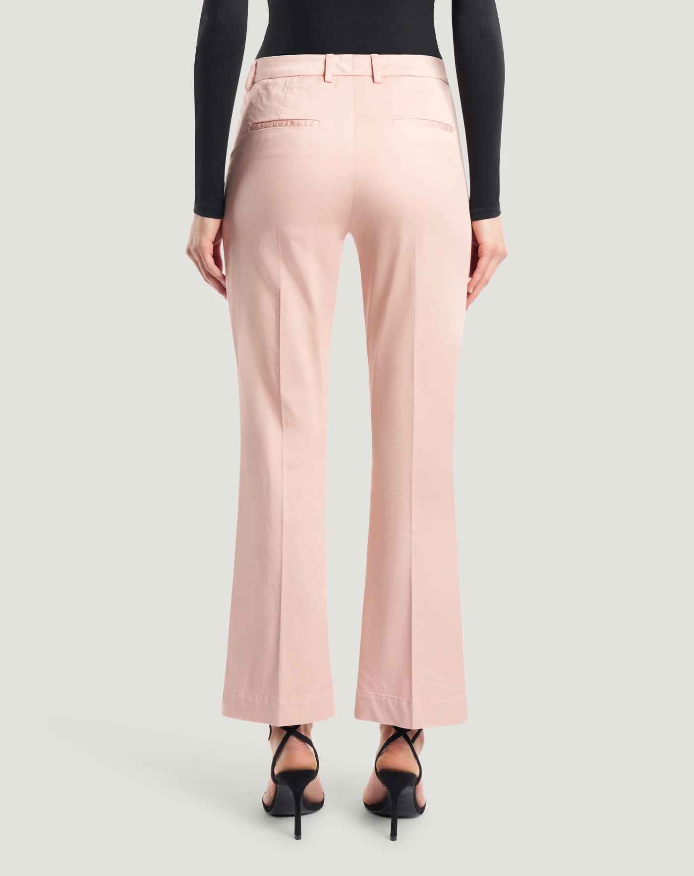 Pantaloni in satin stretch un raso leggero e morbido, caratterizzato da una superficie liscia e leggermente lucida, arricchito da una componente elastica che ne aumenta comfort e libertà di movimento. Con linea flare e lunghezza alla caviglia, scegli il rosa polvere per dare una nota delicata al look.