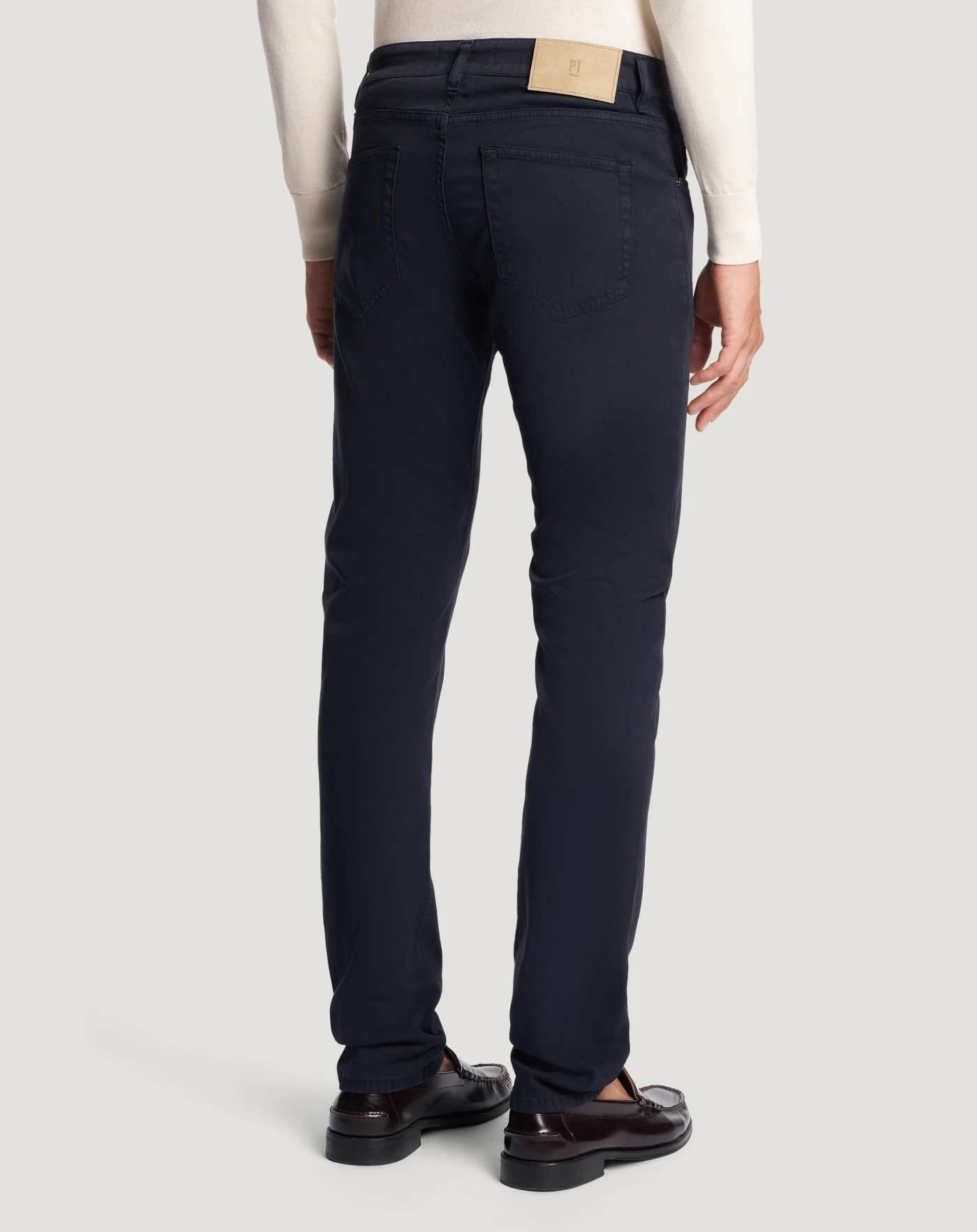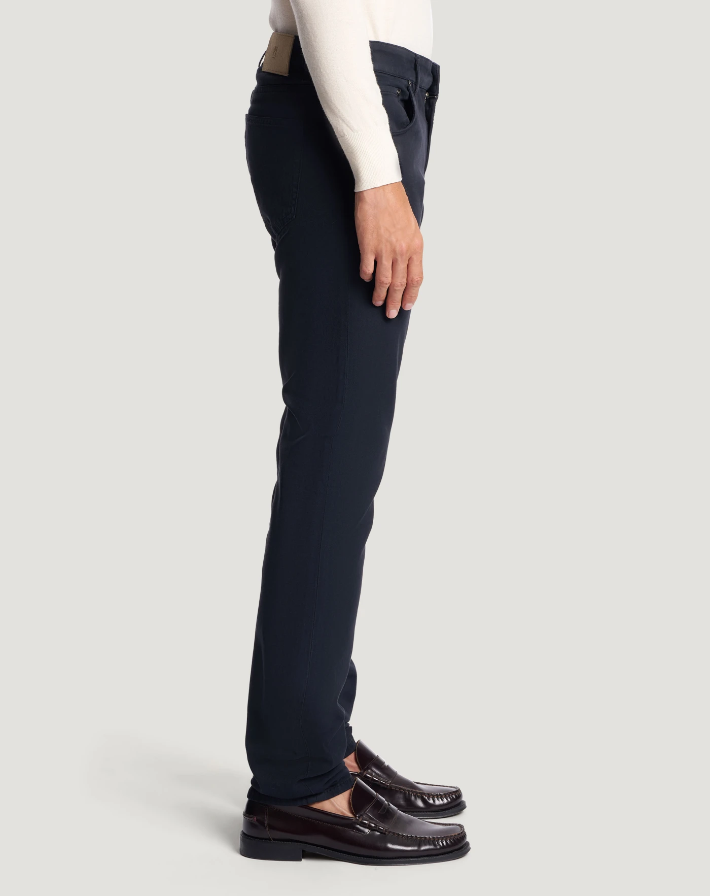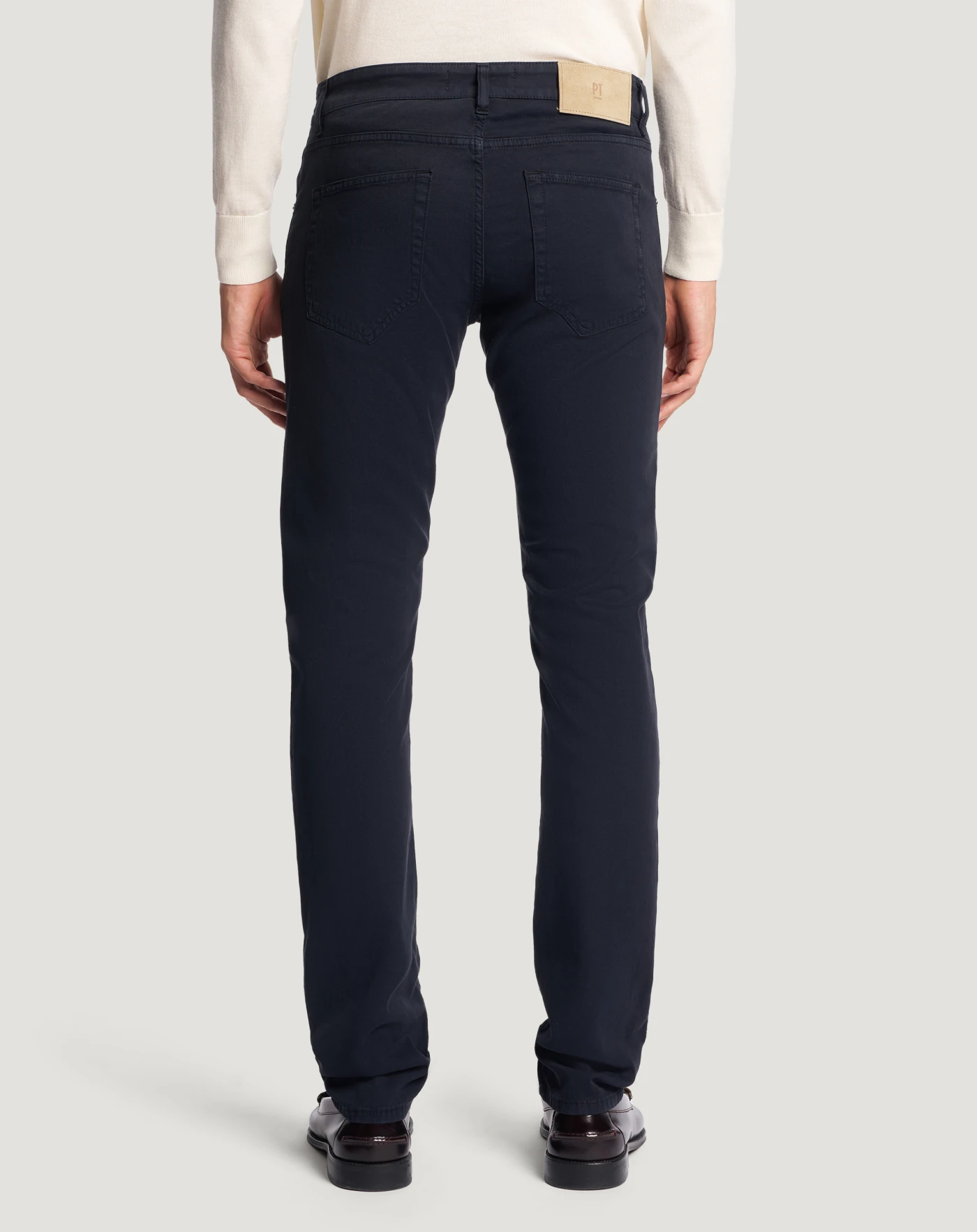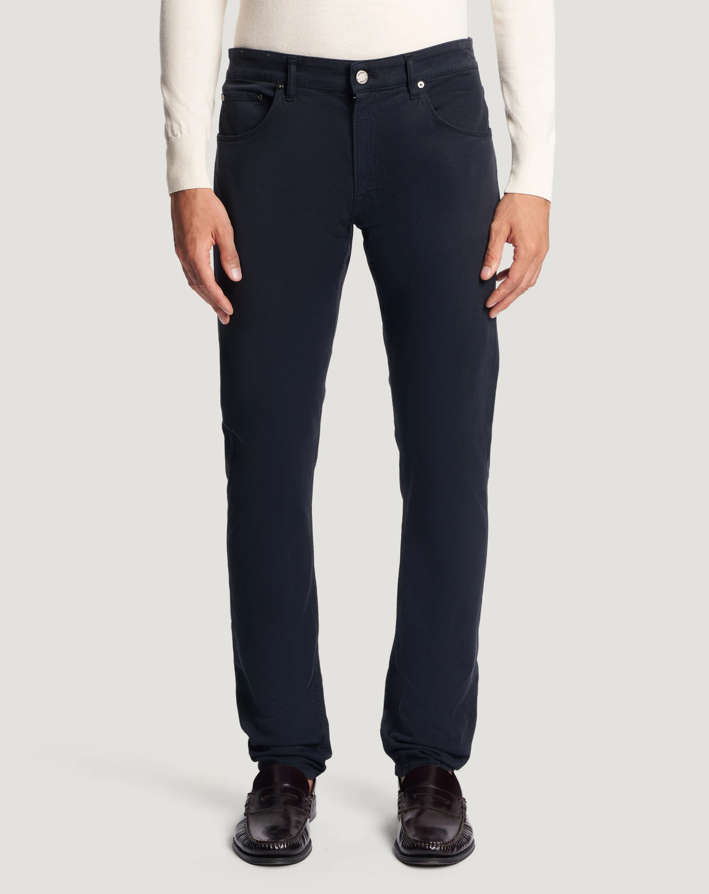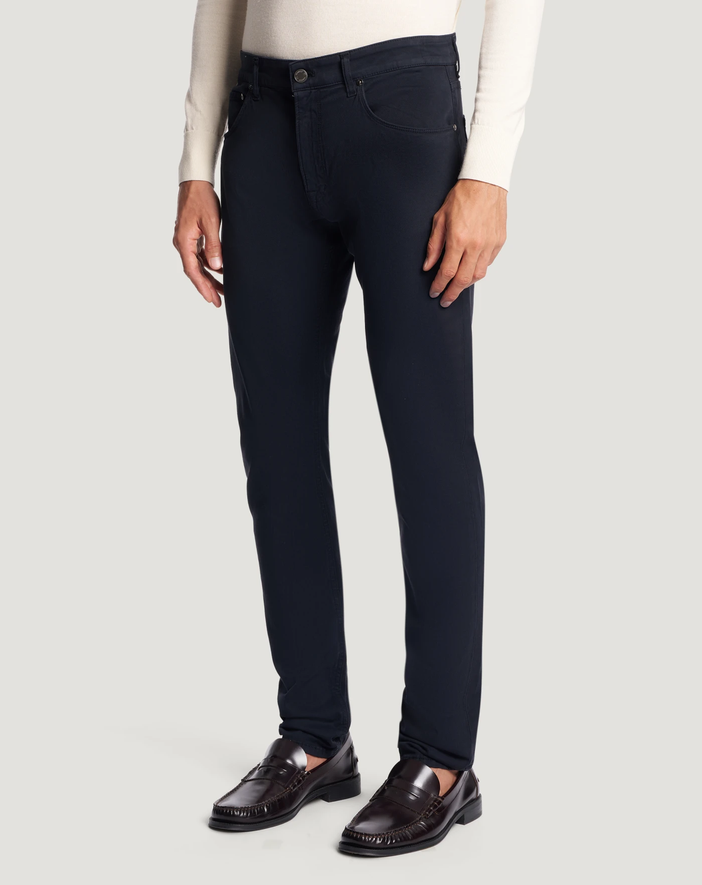 Pantaloni in tricotina stretch di cotone e cachemire, un tessuto pregiato piacevole al tatto, che unisce resistenza ed elasticità. Con cinque tasche, vita regular e linea slim, hanno un design versatile adatto al lavoro e nel tempo libero. In variante blu navy per un tocco di eleganza urbana.