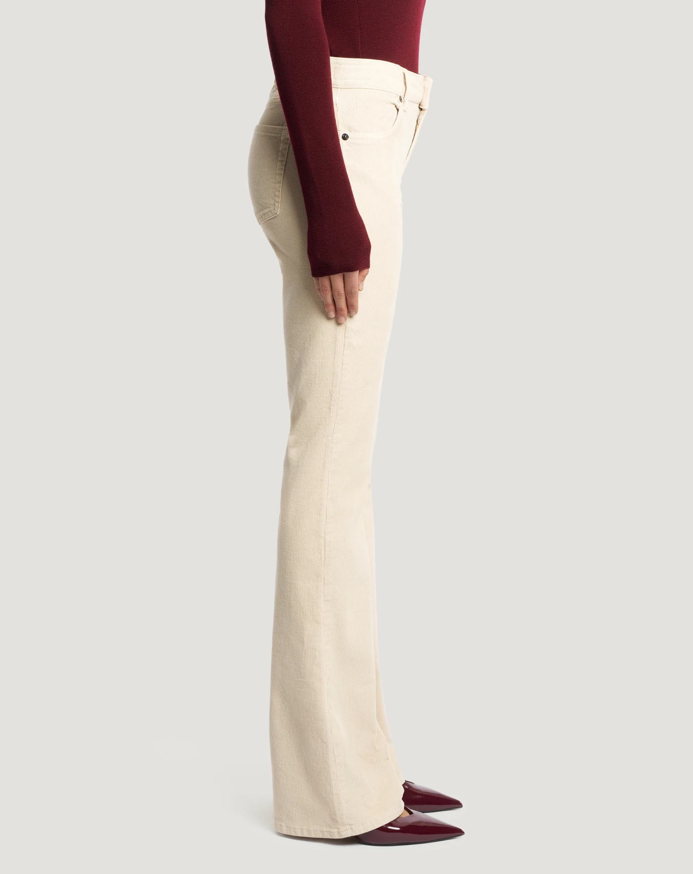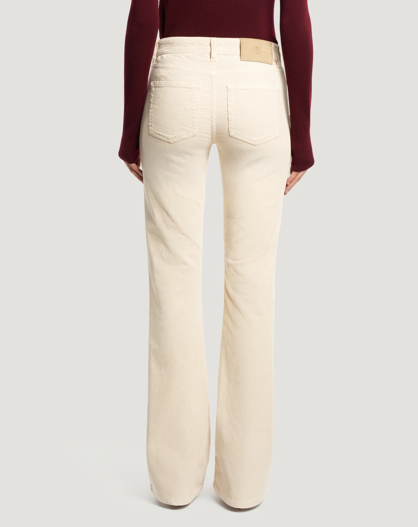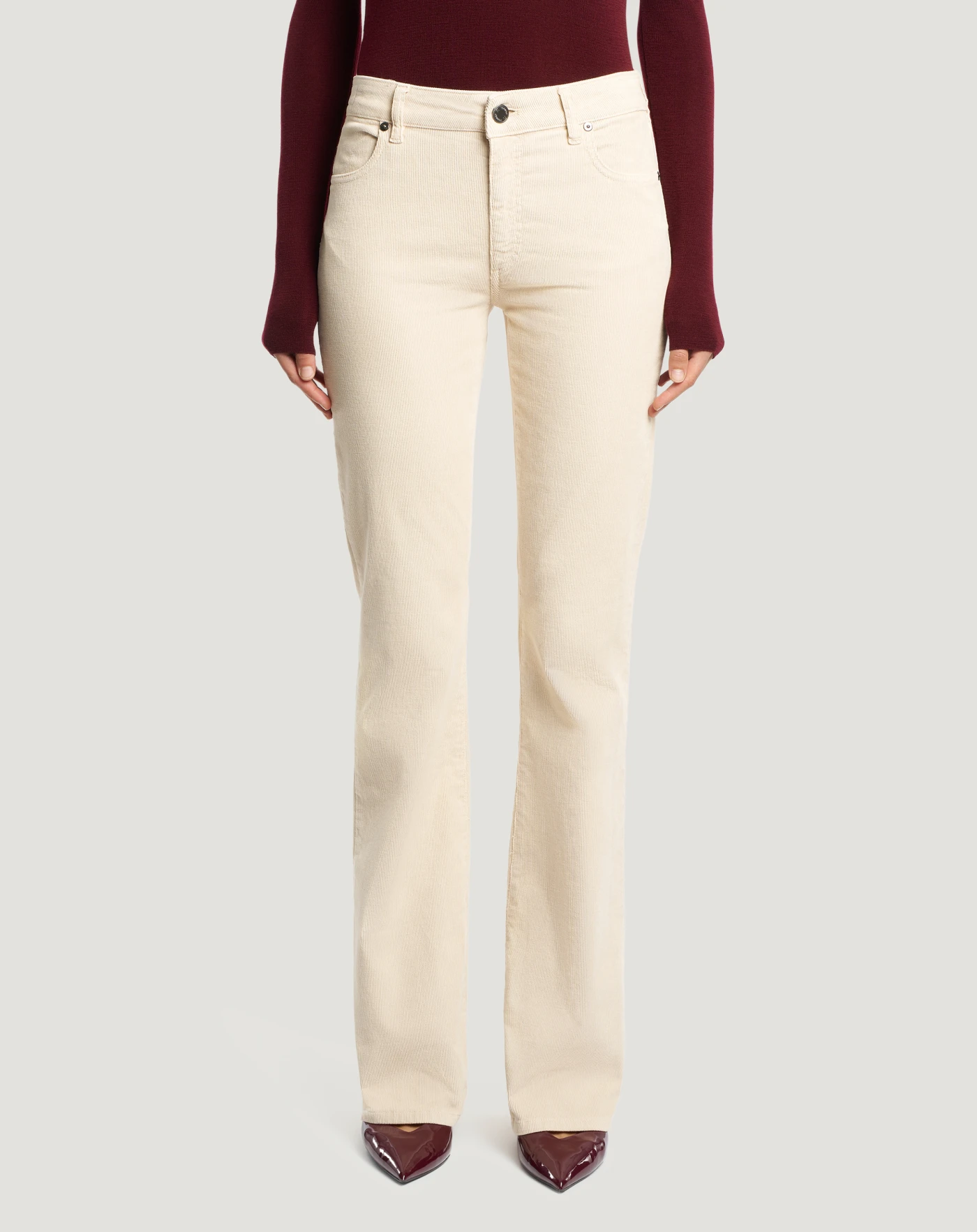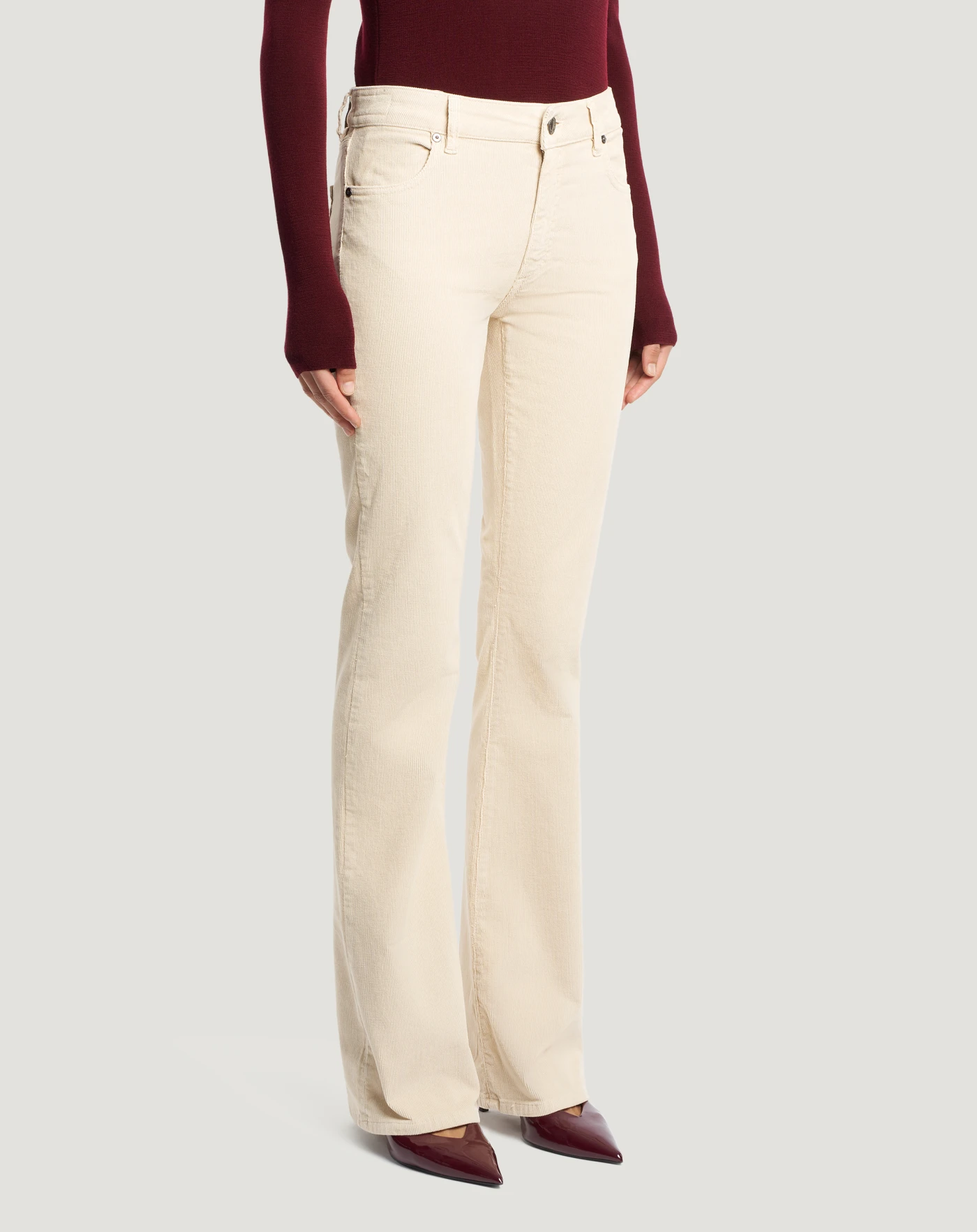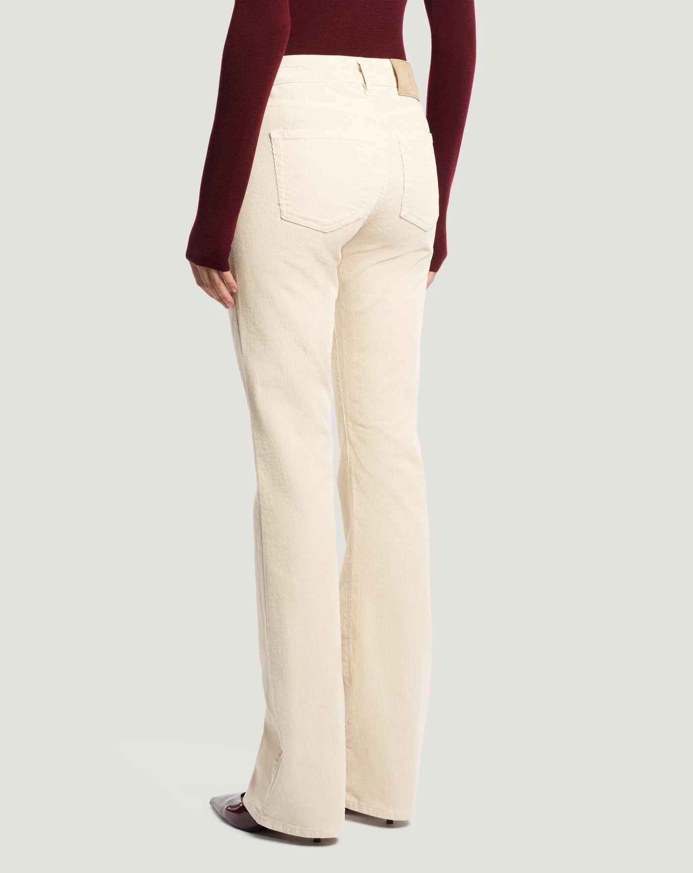Pantaloni in velluto stretch di cotone con trama a costine sottili, confortevole, calda e perfetta per la stagione. Vita regular e linea flare per completare lo stile con un tocco attuale e décontracté. Scegli il colore burro versatile per completare lo stile al lavoro e nelle occasioni off duty.