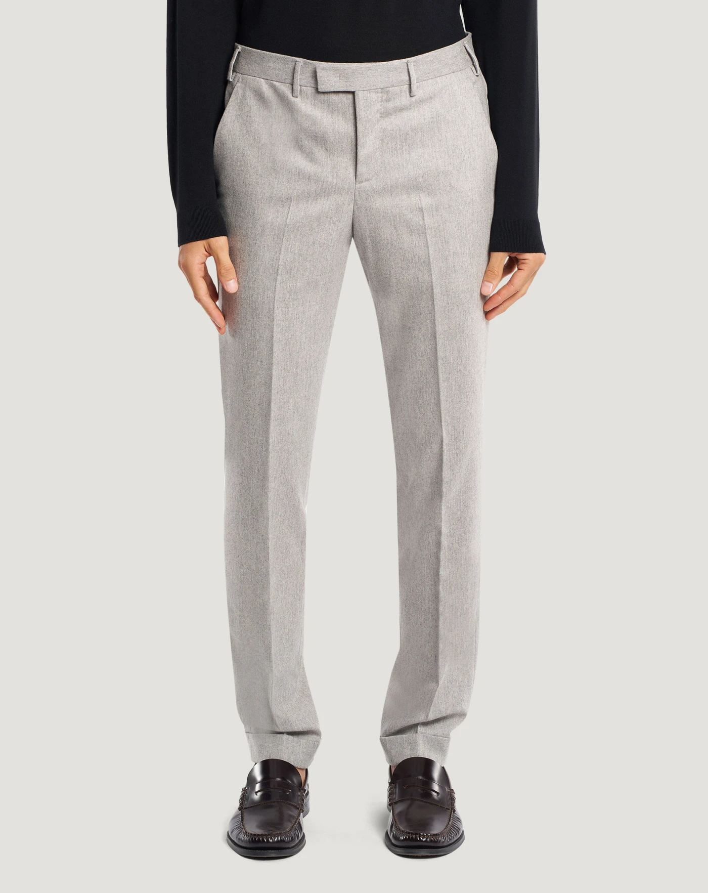 Pantaloni in flanella di lana e cashmere, un tessuto morbido e caldo, perfetto per completare i look di stagione.Con bacino pulito, piega stirata e risvolto al fondo, hanno un design sartoriale inedito. In grigio azzurro per dare una nota cromatica delicata allo stile.