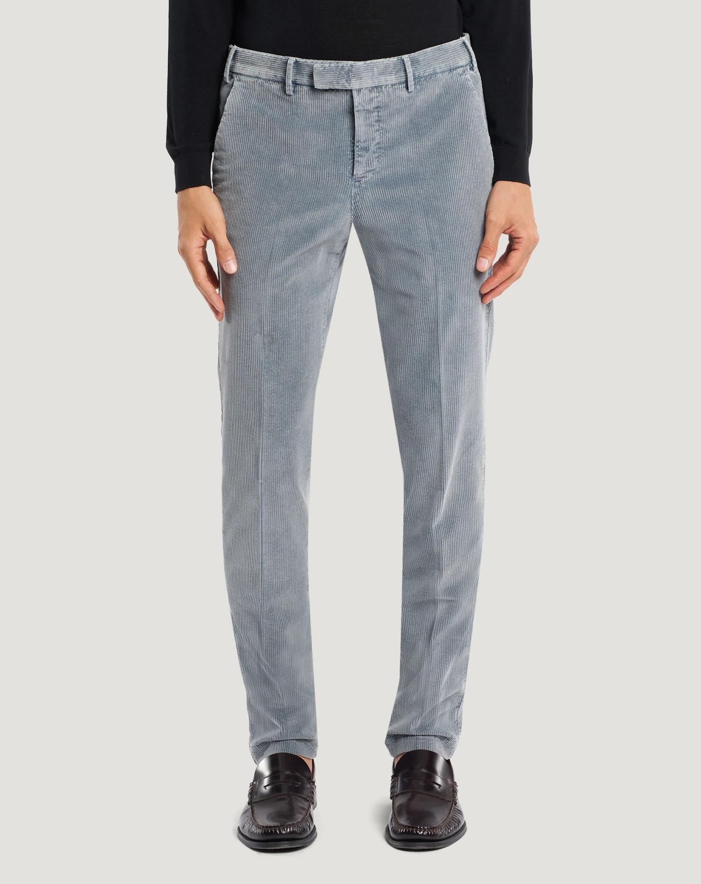 Pantaloni in velluto stretch a costine un tessuto morbido dall'aspetto délavé che aggiunge carattere allo stile.Con linea ampia e pieghe davanti che creano movimento, sono perfetti per dare personalità ai look quotidiani e formali.