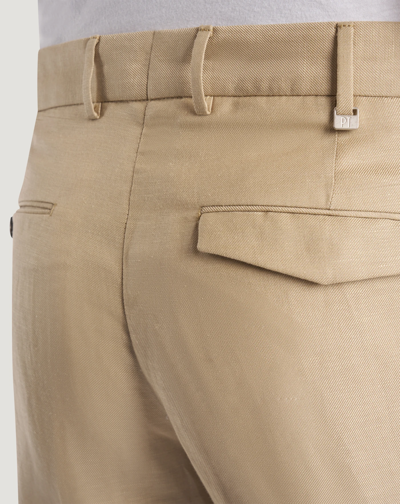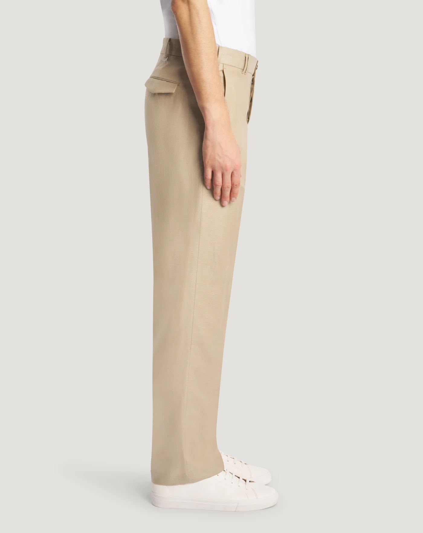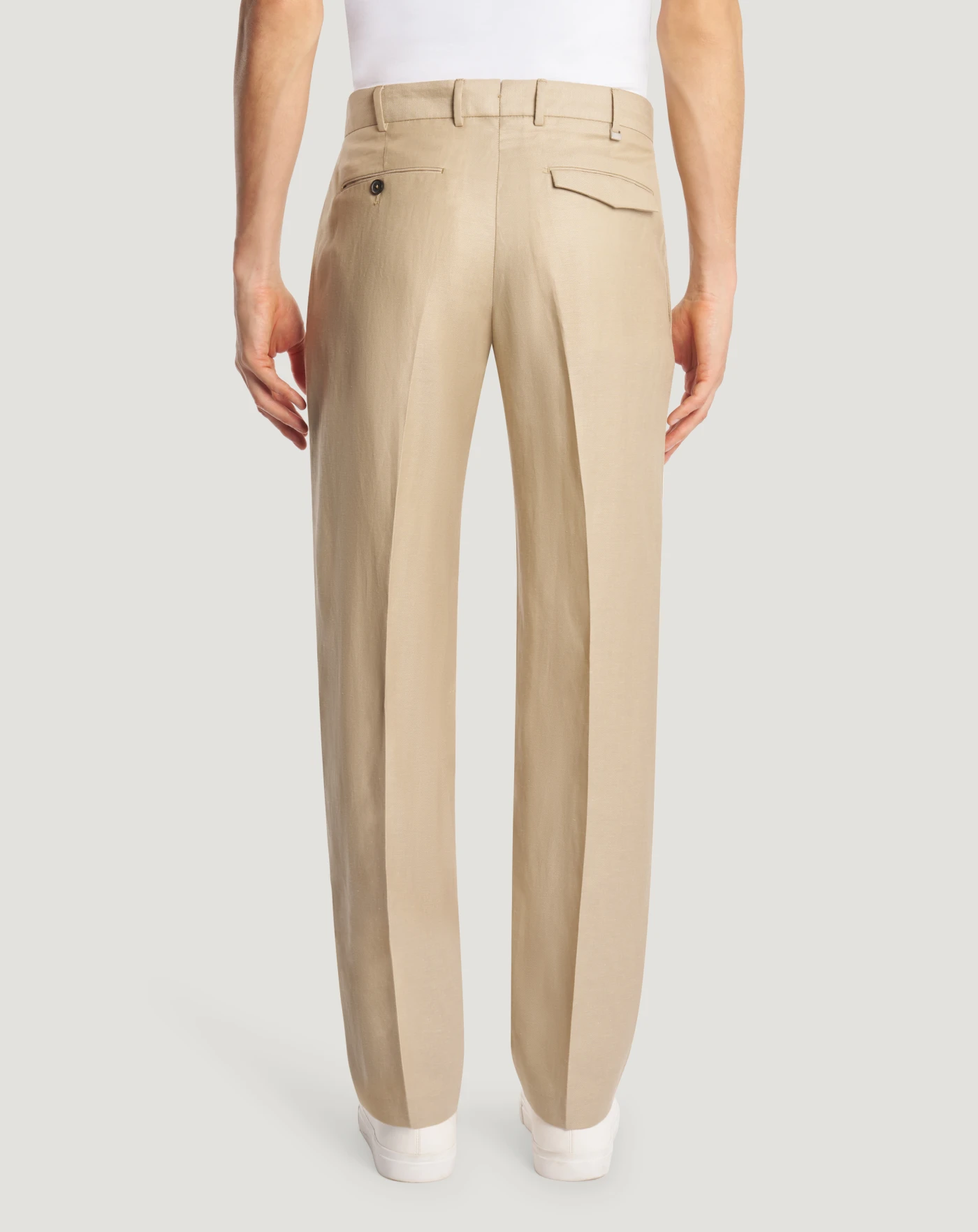 Pantalone in twill di lana e lino, un tessuto ad armatura diagonale che combina la freschezza naturale del lino con l’eleganza e la morbidezza della lana. Linea dritta versatile e piega stirata per un modello perfetto per completare i tuoi look quotidiani. Scegli il beige come base versatile del guardaroba.
