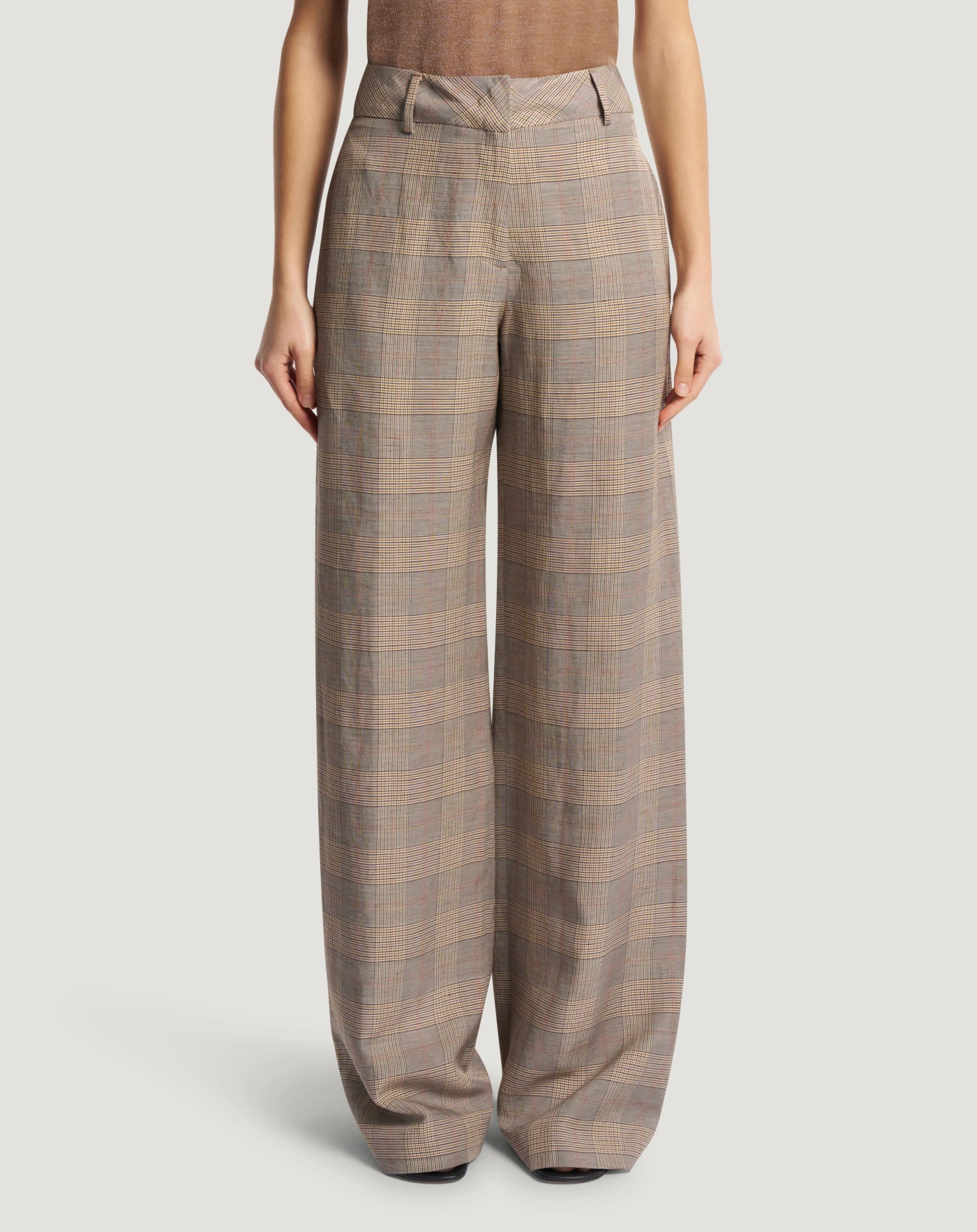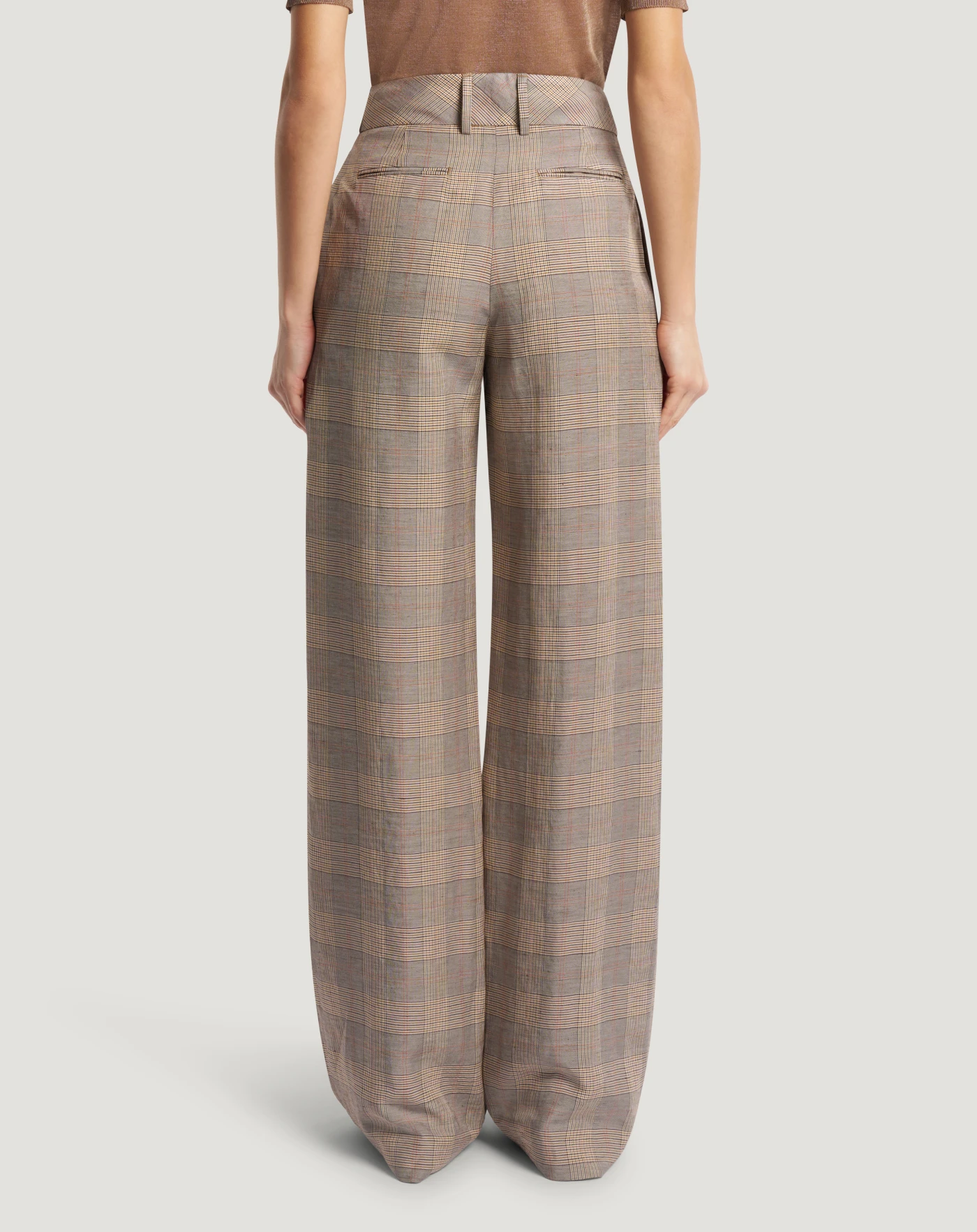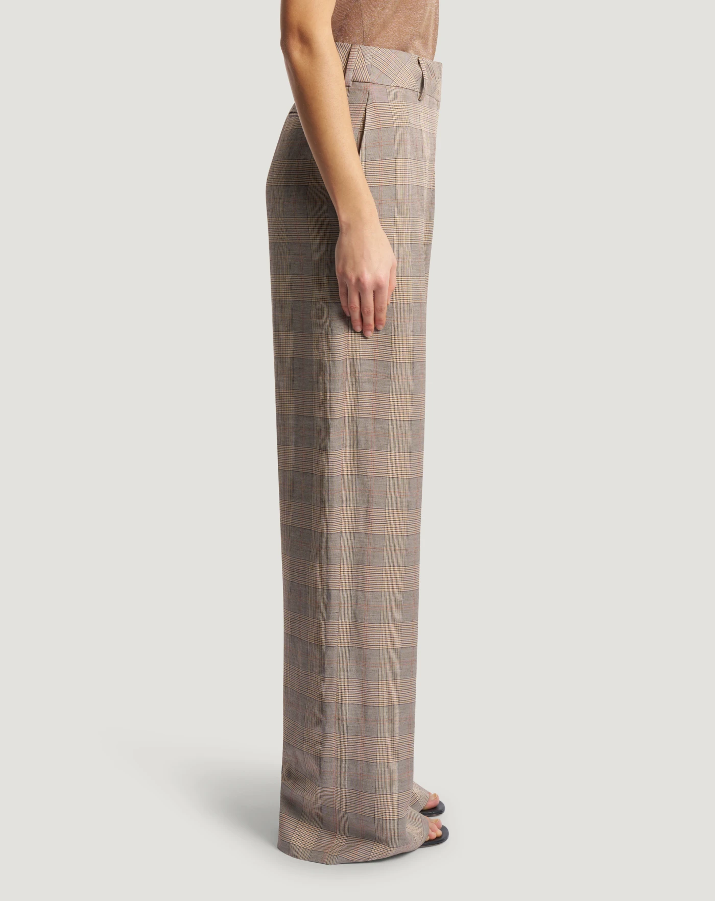 Pantaloni in tessuto, disegno galles di lino e viscosa una combinazione che unisce fluidità, leggerezza e una mano fresca e naturale. Con linea ampia e vita bassa, sono perfetti per dare una nota grafica allo stile, anche in abbinamento alla giacca in coordinato.