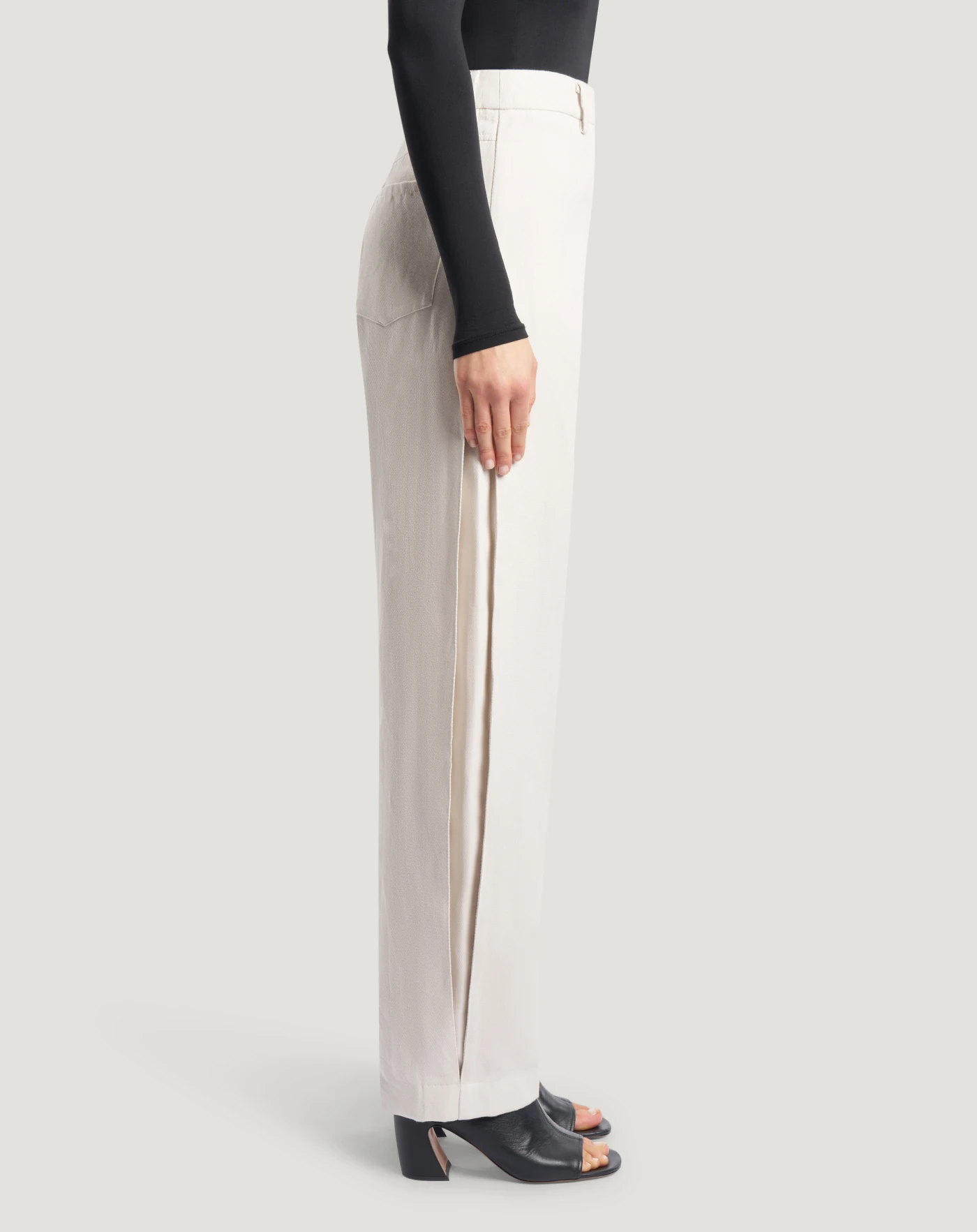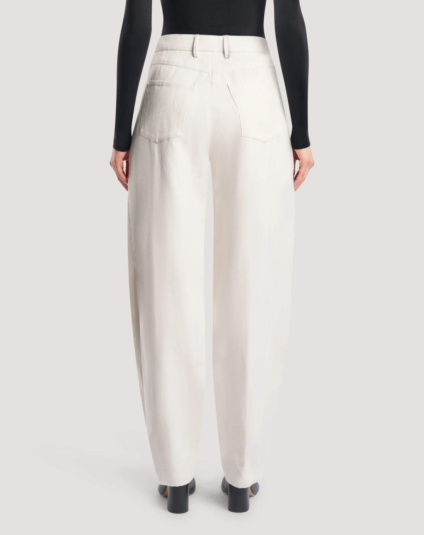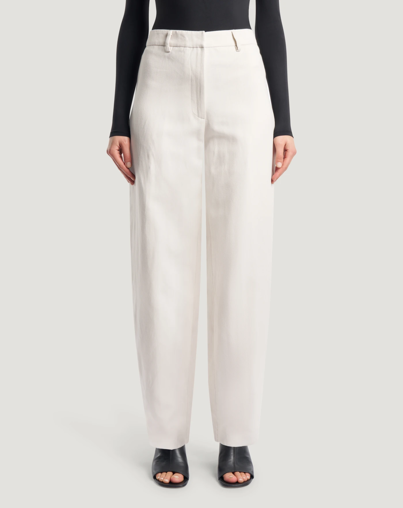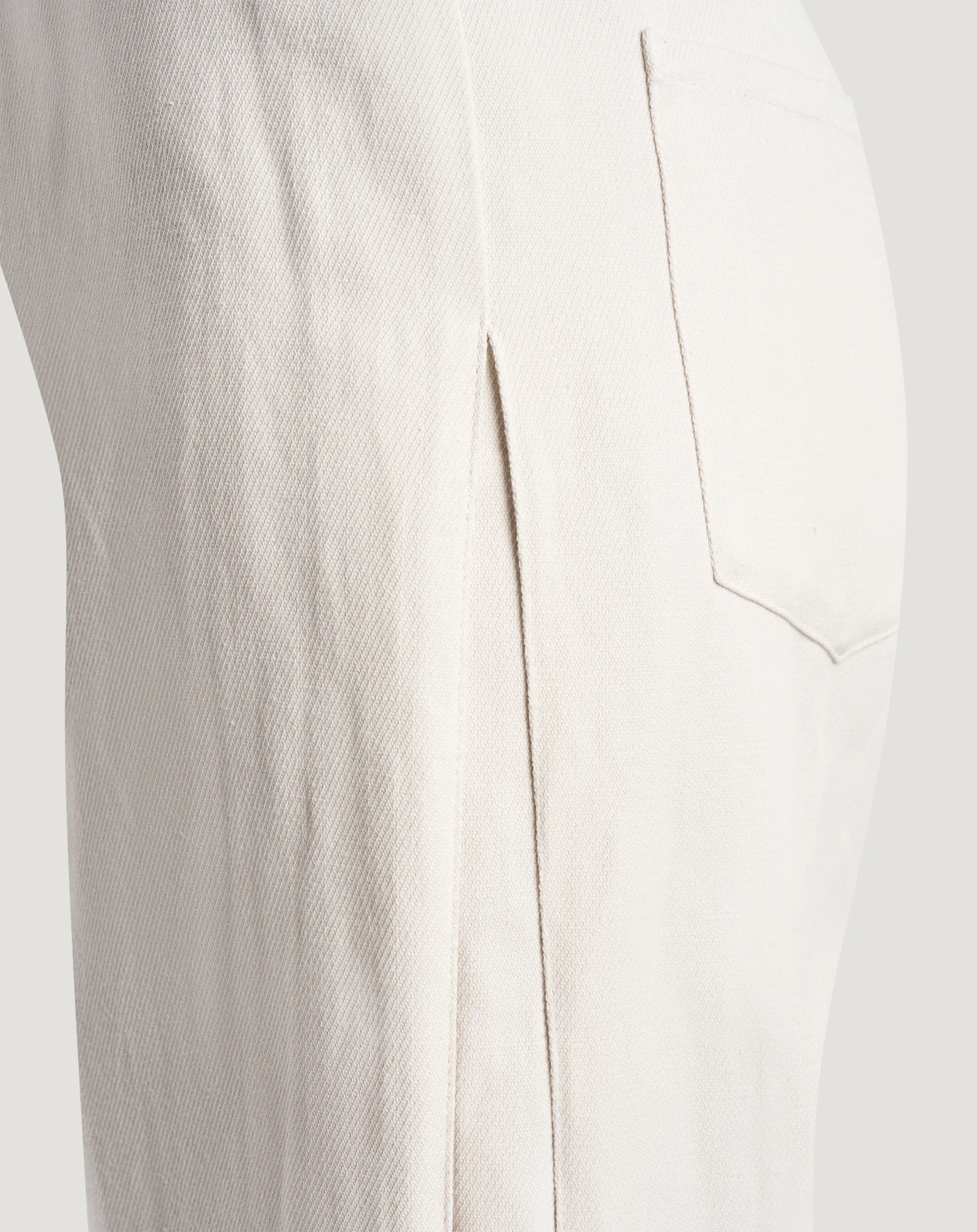 Pantaloni in misto cotone e canapa ad armatura diagonale. Linea sartoriale e loose, con soffietto sull'esterno gamba per donare una nota inedita e aggiornata allo stile.