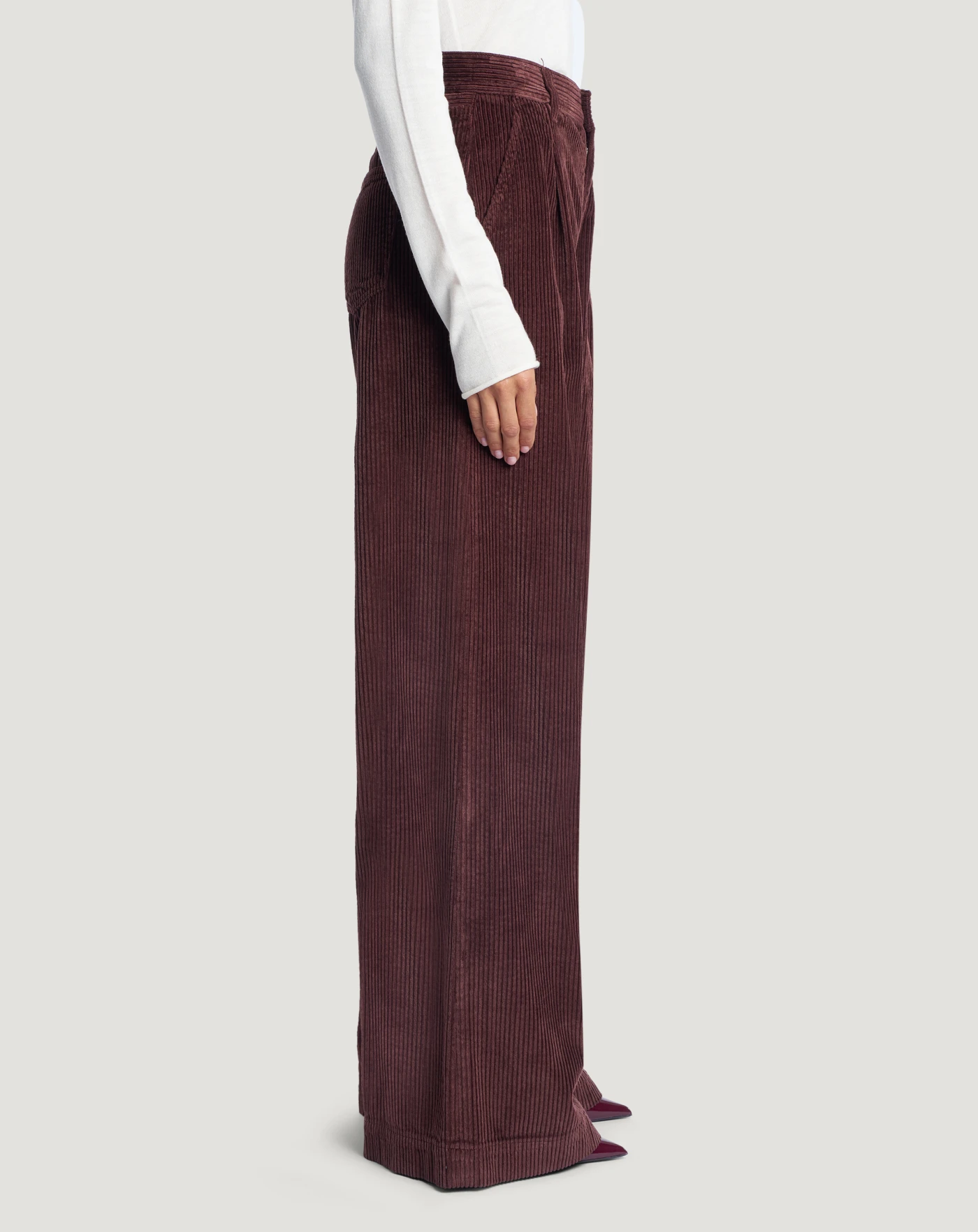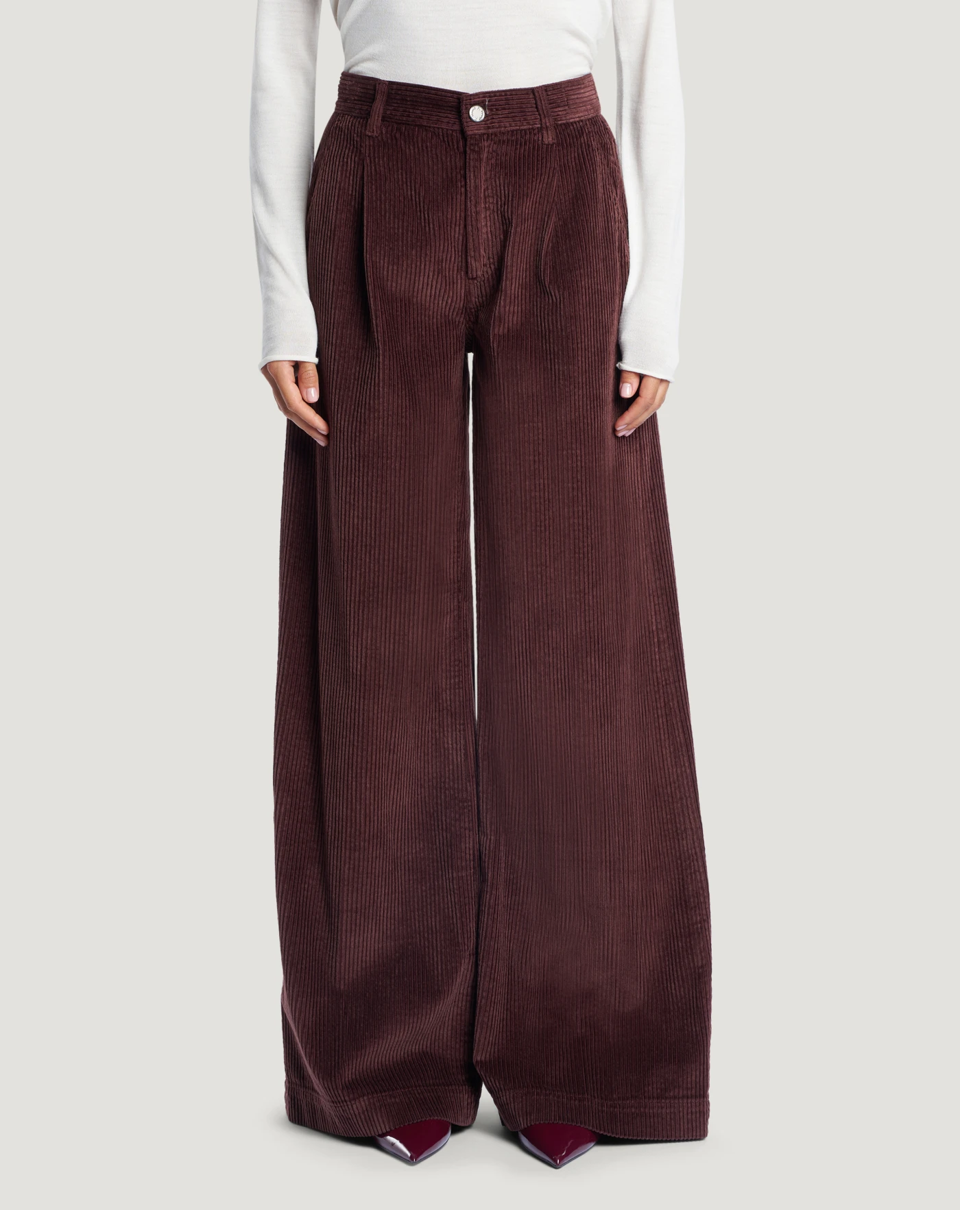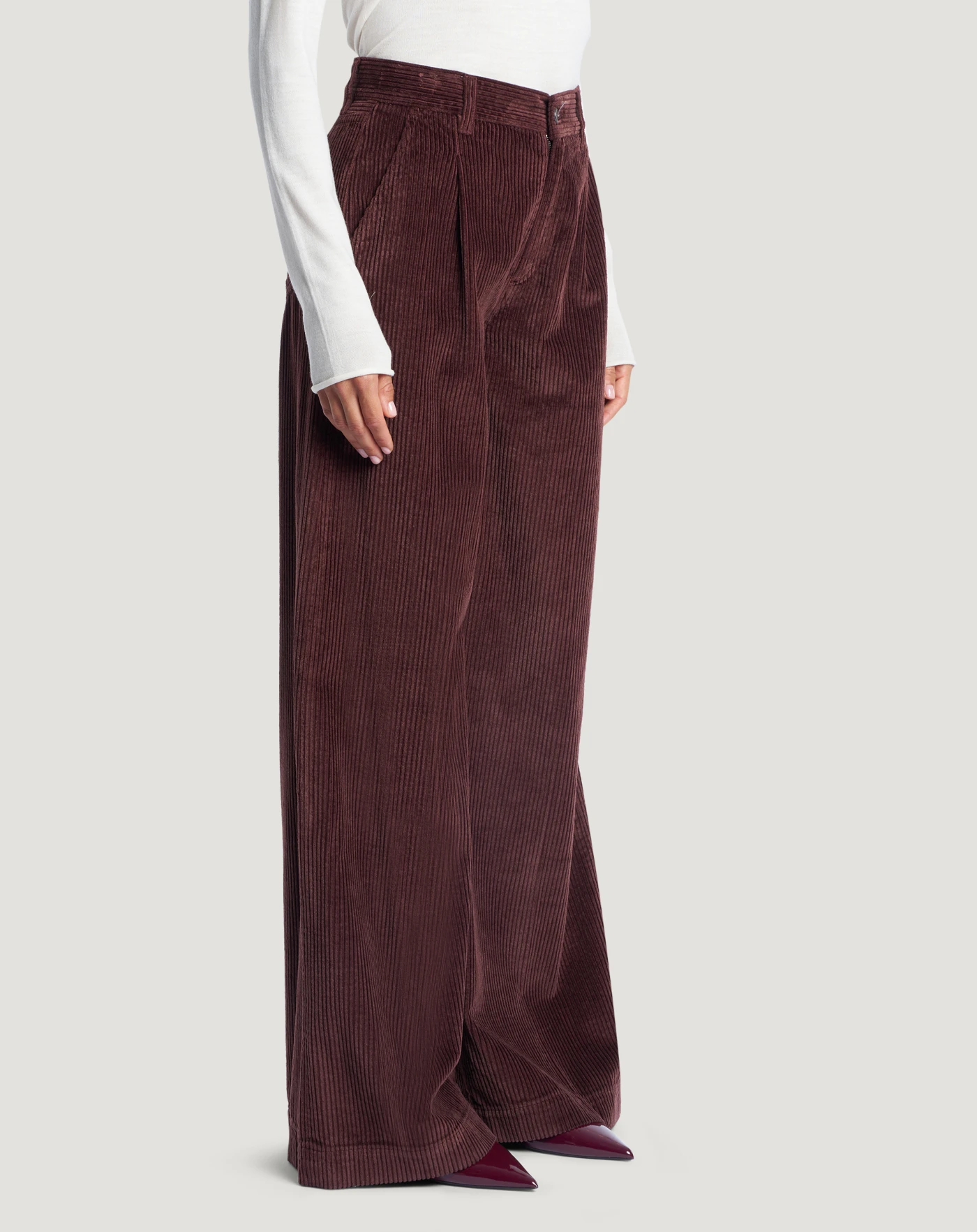 Pantaloni in velluto a coste morbido di cotone e modal, un tessuto confortevole che segue i movimenti del corpo. Vita regular, linea ampia e pieghe davanti per un modello ricercato e di tendenza. In variante bordeaux per elevare lo stile.