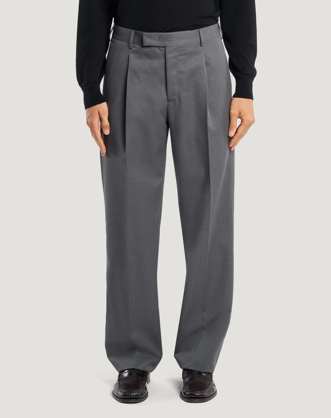 Pantaloni in drill di pura lana con filato doppio ritorto che rende il tessuto molto resistente a strappi e sfregamenti, dall'aspetto attuale e consistente.Con bacino mosso da piega e linea ampia, hanno un design ricercato e dall'eleganza rilassata.