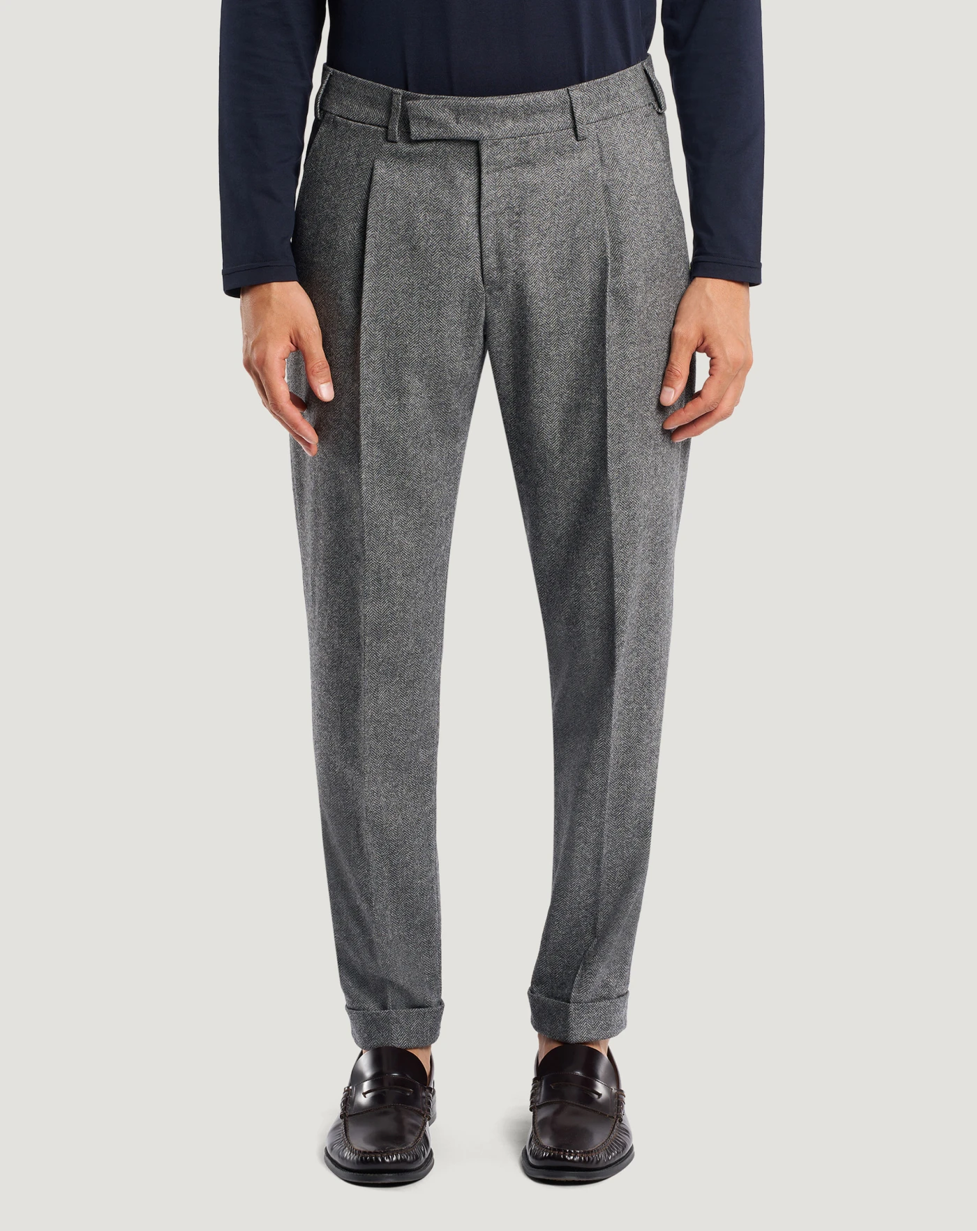 Pantaloni in flanella di lana e cachemire, un tessuto morbido e pregiato con fantasia micro chevron.Hanno un design sartoriale rilassato, lunghezza alla caviglia con piega davanti che rende il capo perfetto per dare una nota décontracté ai look da lavoro o per completare lo stile quotidiano.