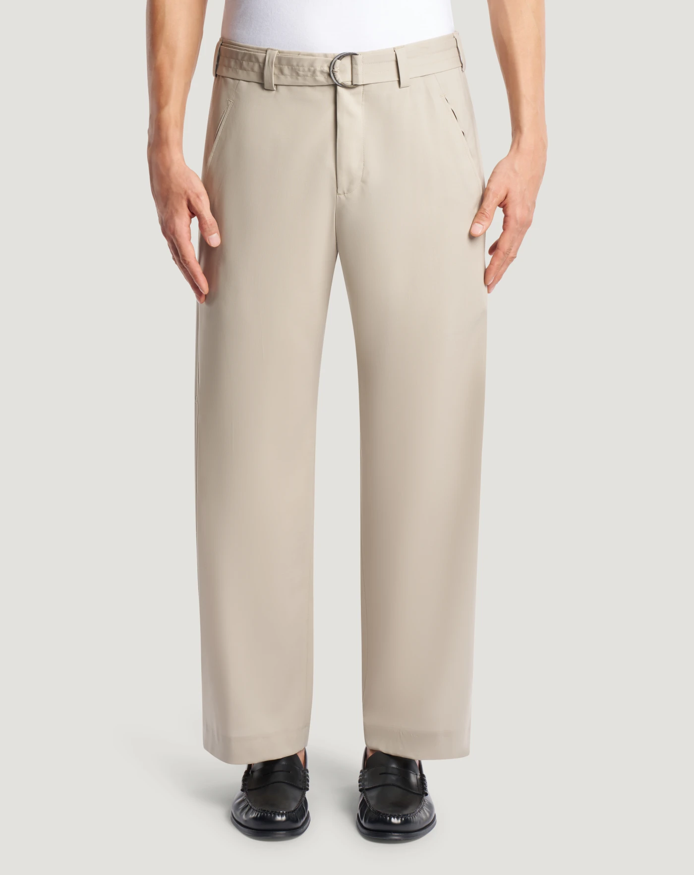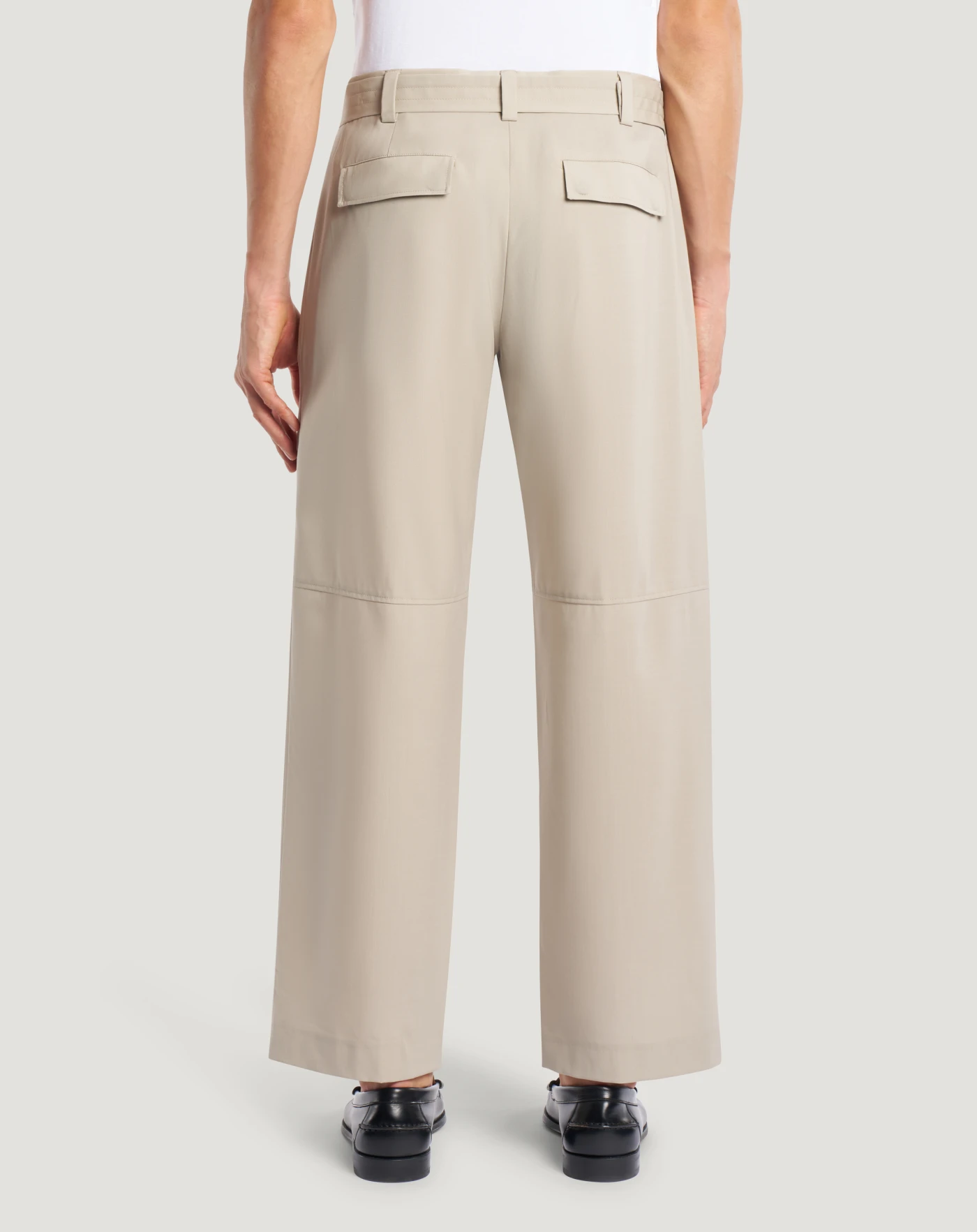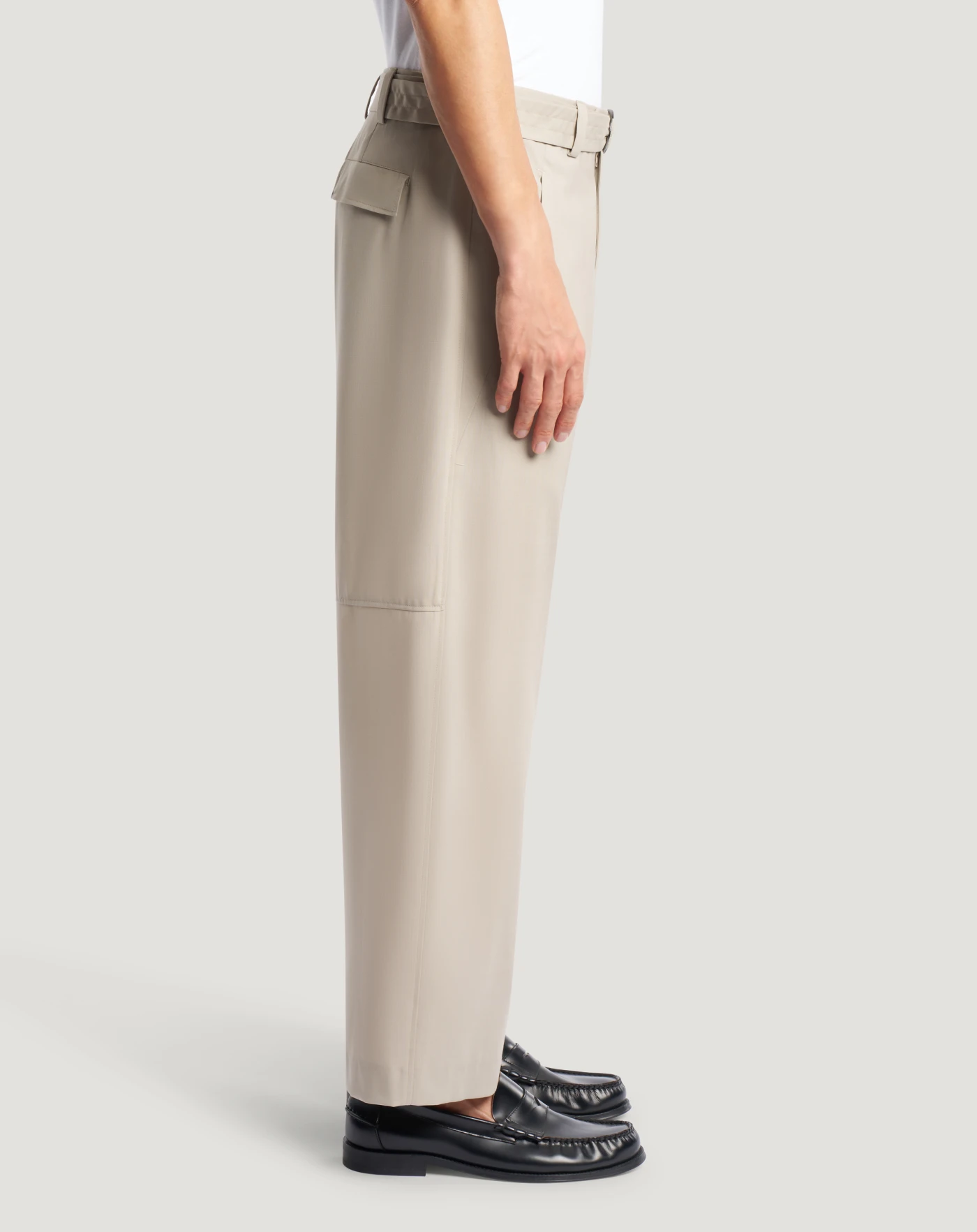 Pantaloni in lana pregiata superlight, caratterizzata da una mano raffinata e un comfort naturale che la rende elegante e pensata per le stagioni calde. Linea ampia con cintura in vita per un'attitudine rilassata e inedita.