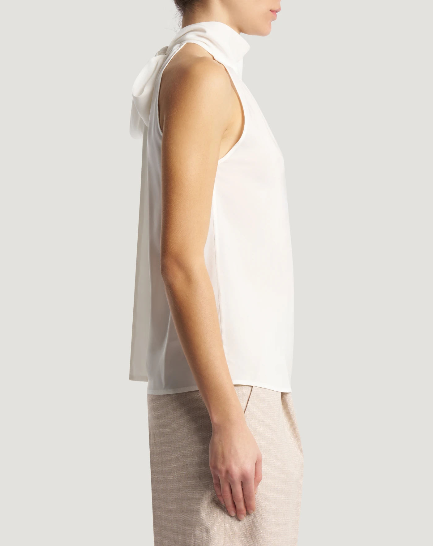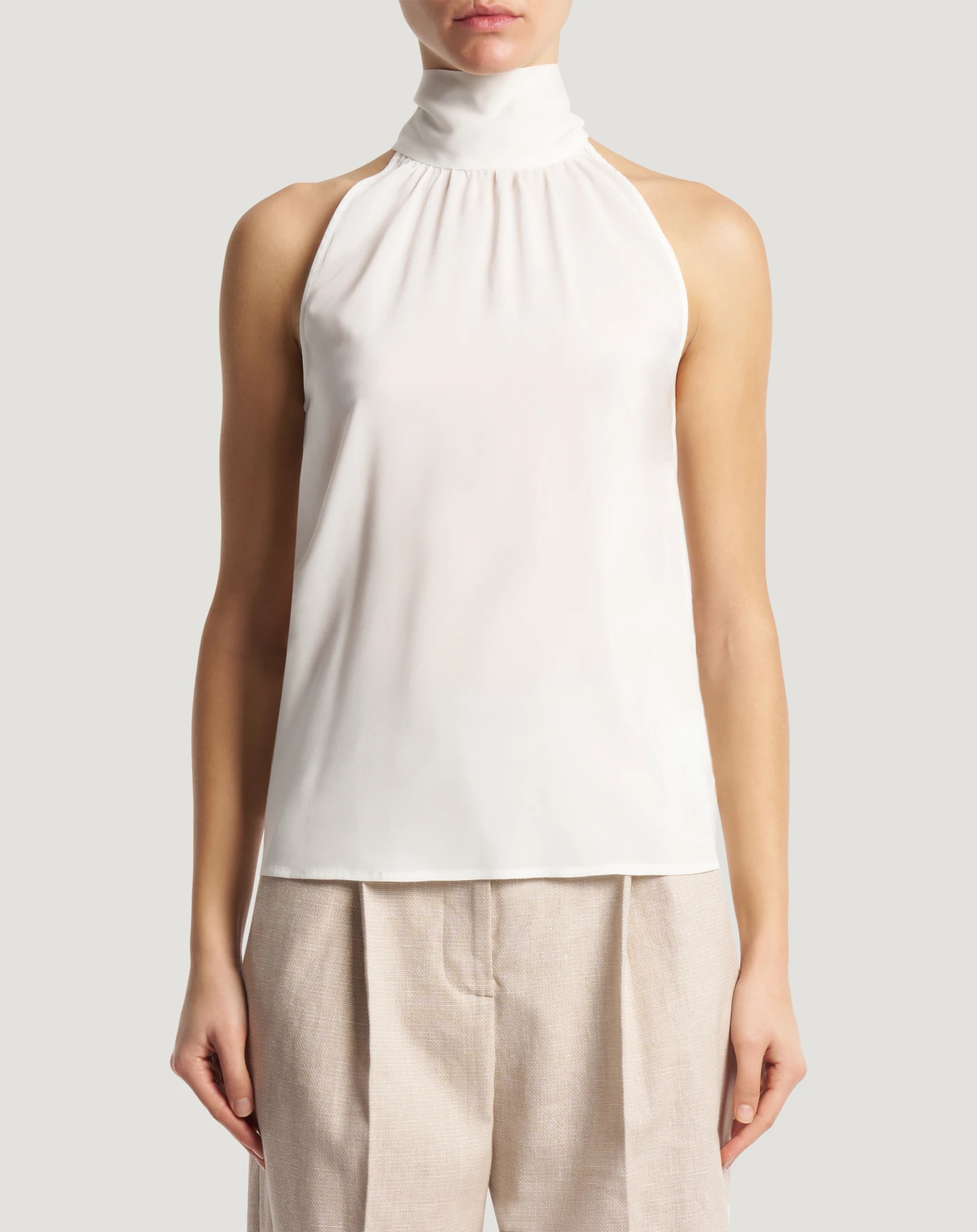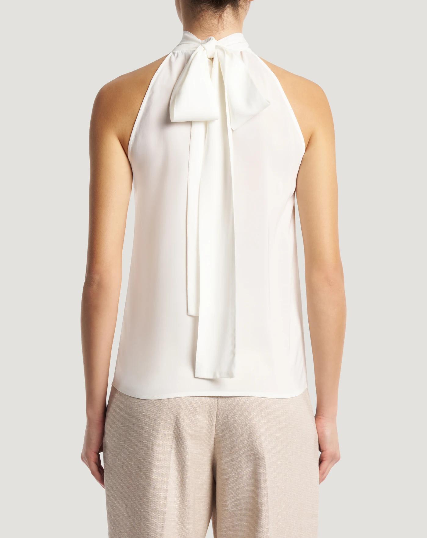 Top in georgette fluida stretch un tessuto elegante e confortevole, che segue i movimenti della silhouette. Linea halter, lunghi lacci al collo, fascino senza tempo per un modello perfetto come sottogiacca o come protagonista del look.