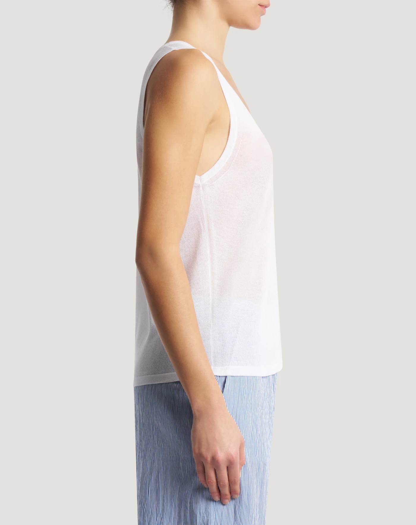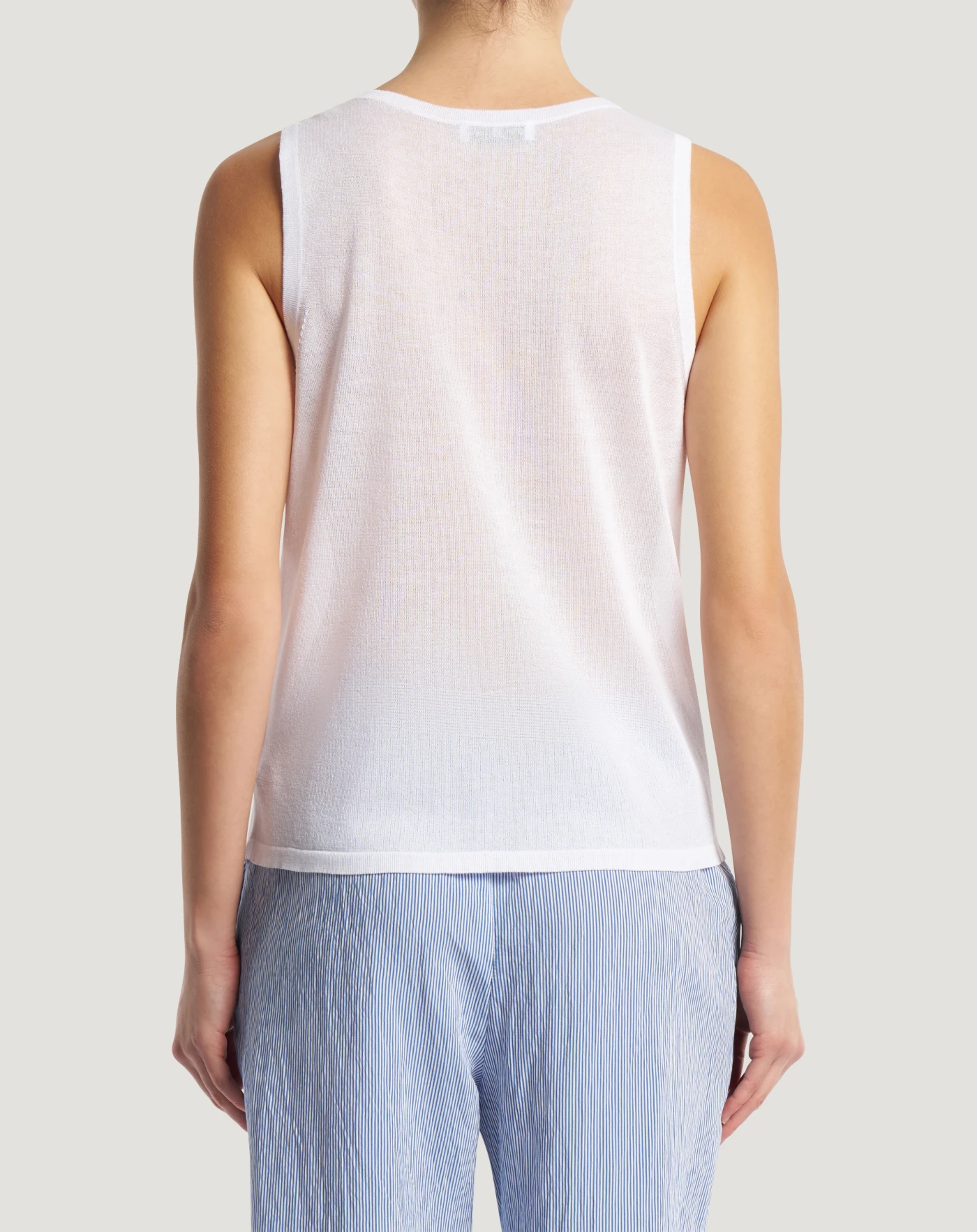 Top in filato di viscosa dalla superficie liscia e uniforme, caratterizzato da una mano molto morbida e da una leggera luminosità che dona un aspetto raffinato e contemporaneo. Effetto see-through per un modello da interpretare come vuoi.