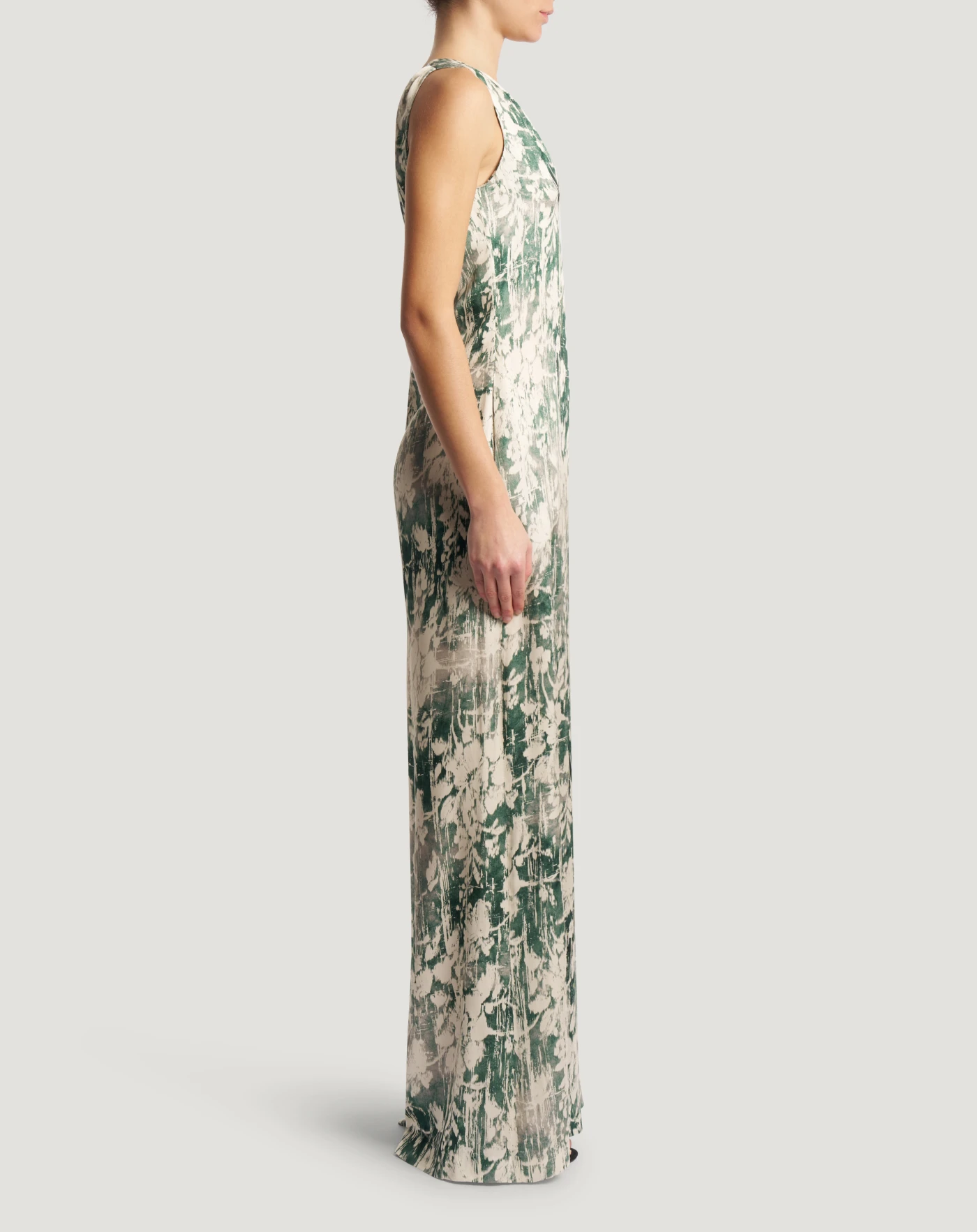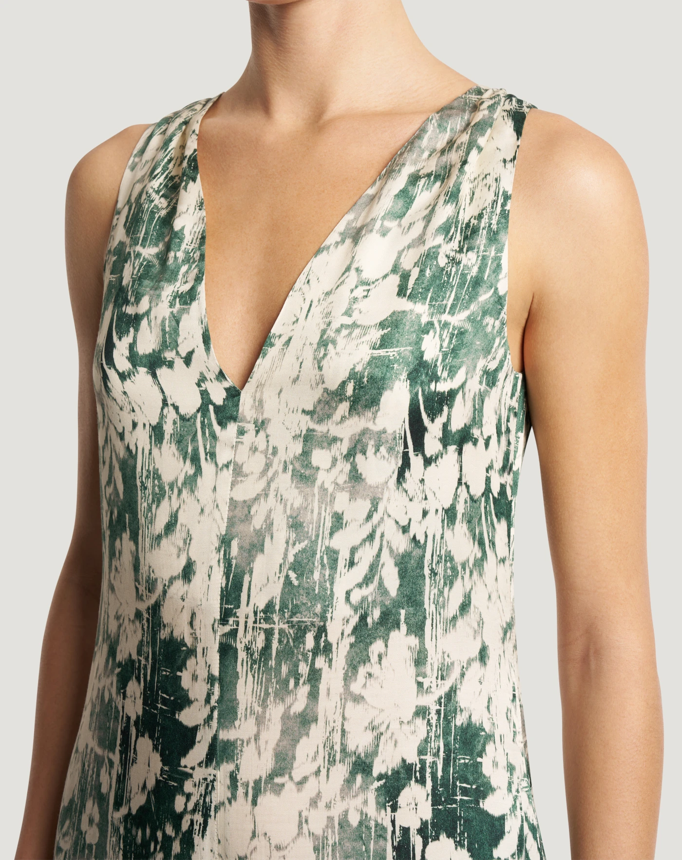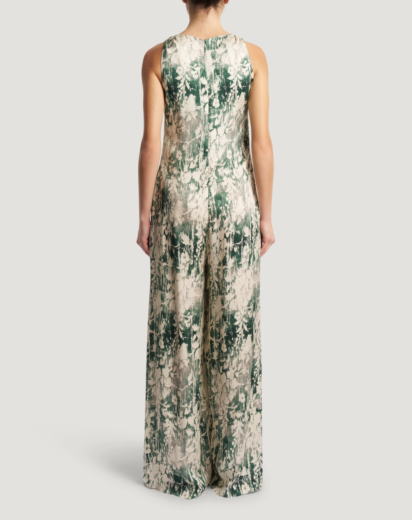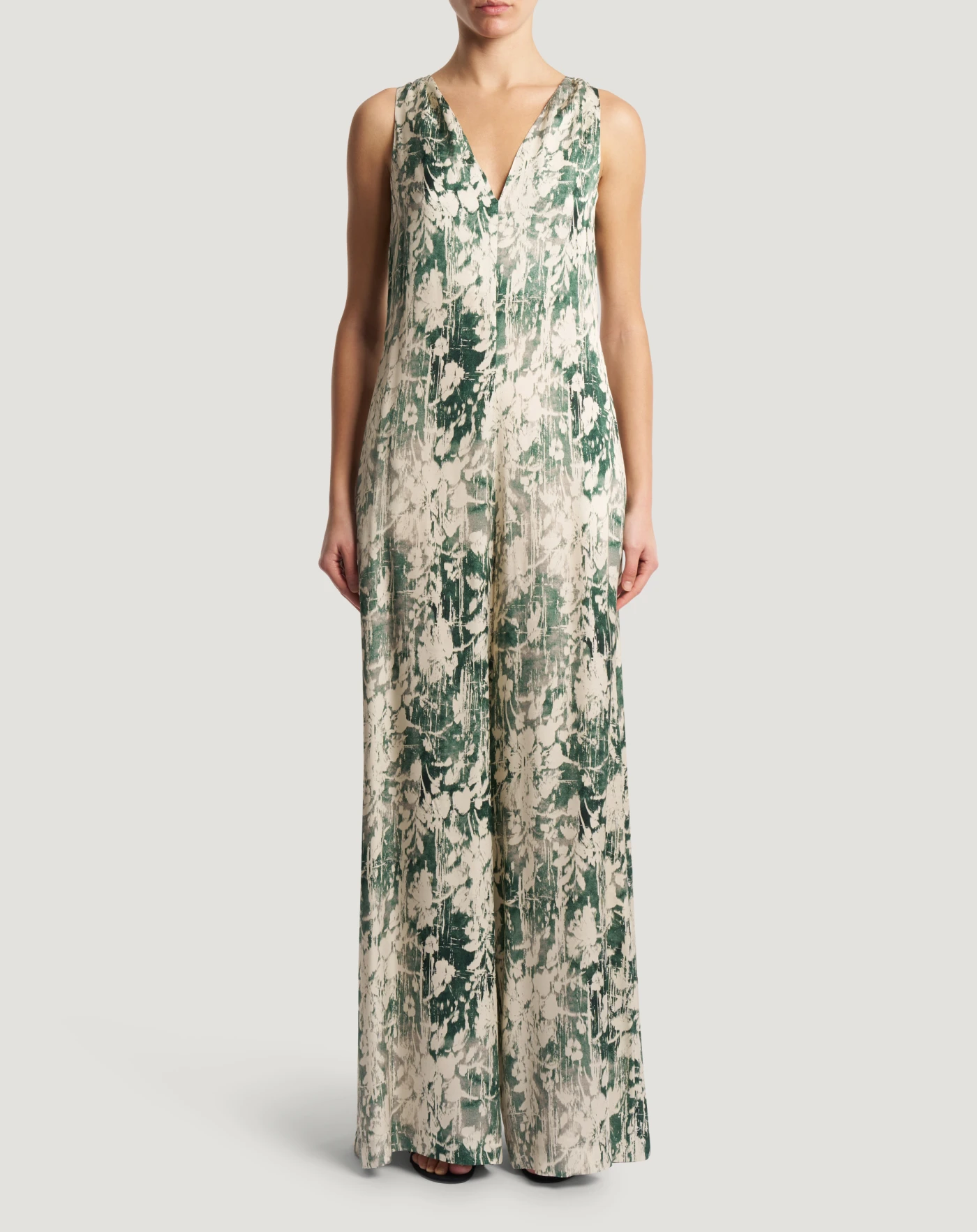Tuta in satin stampato, con scollo a V, linea ampia e tasche ai fianchi. Eleganza grafica e disinvolta da sfoggiare quando vuoi.