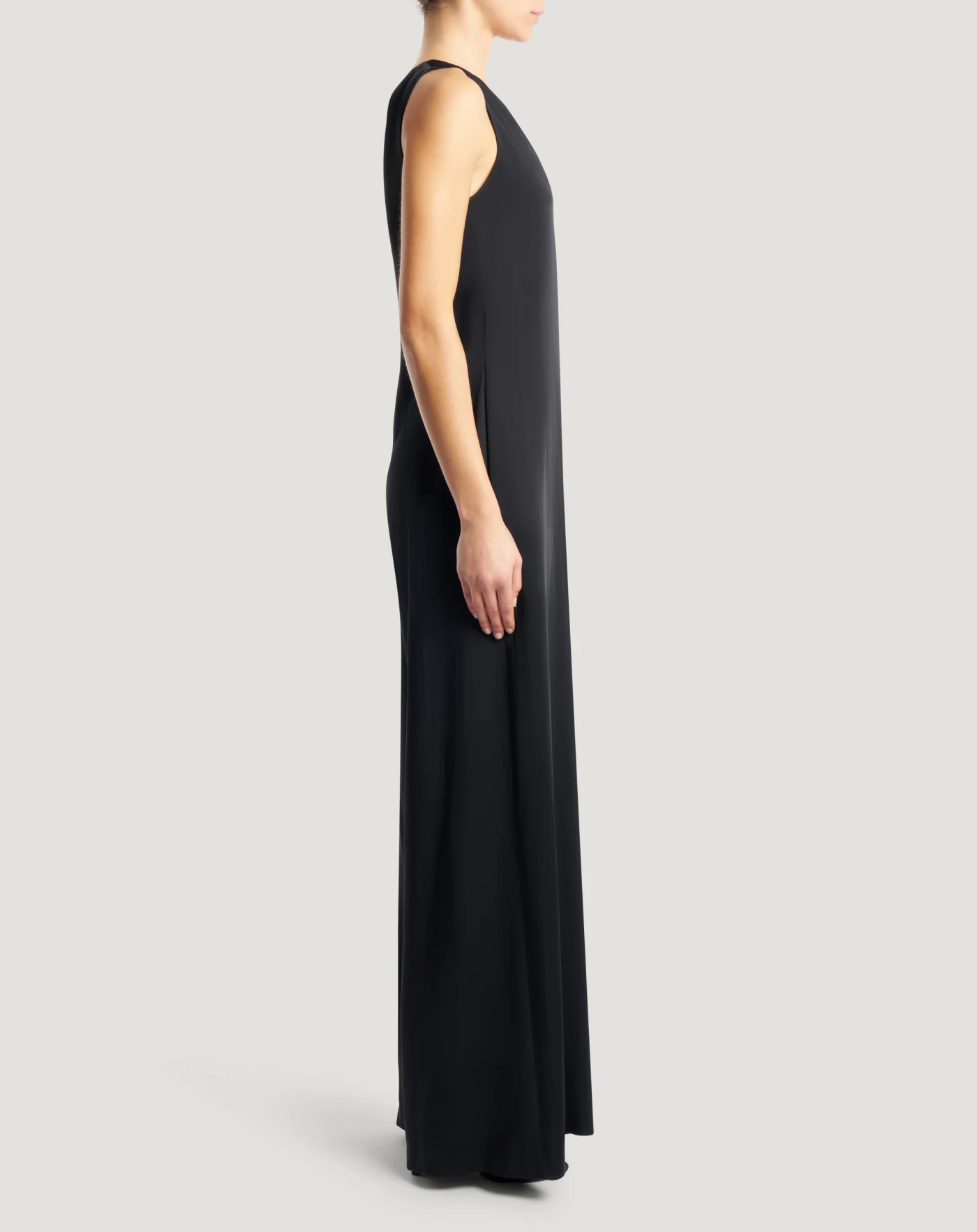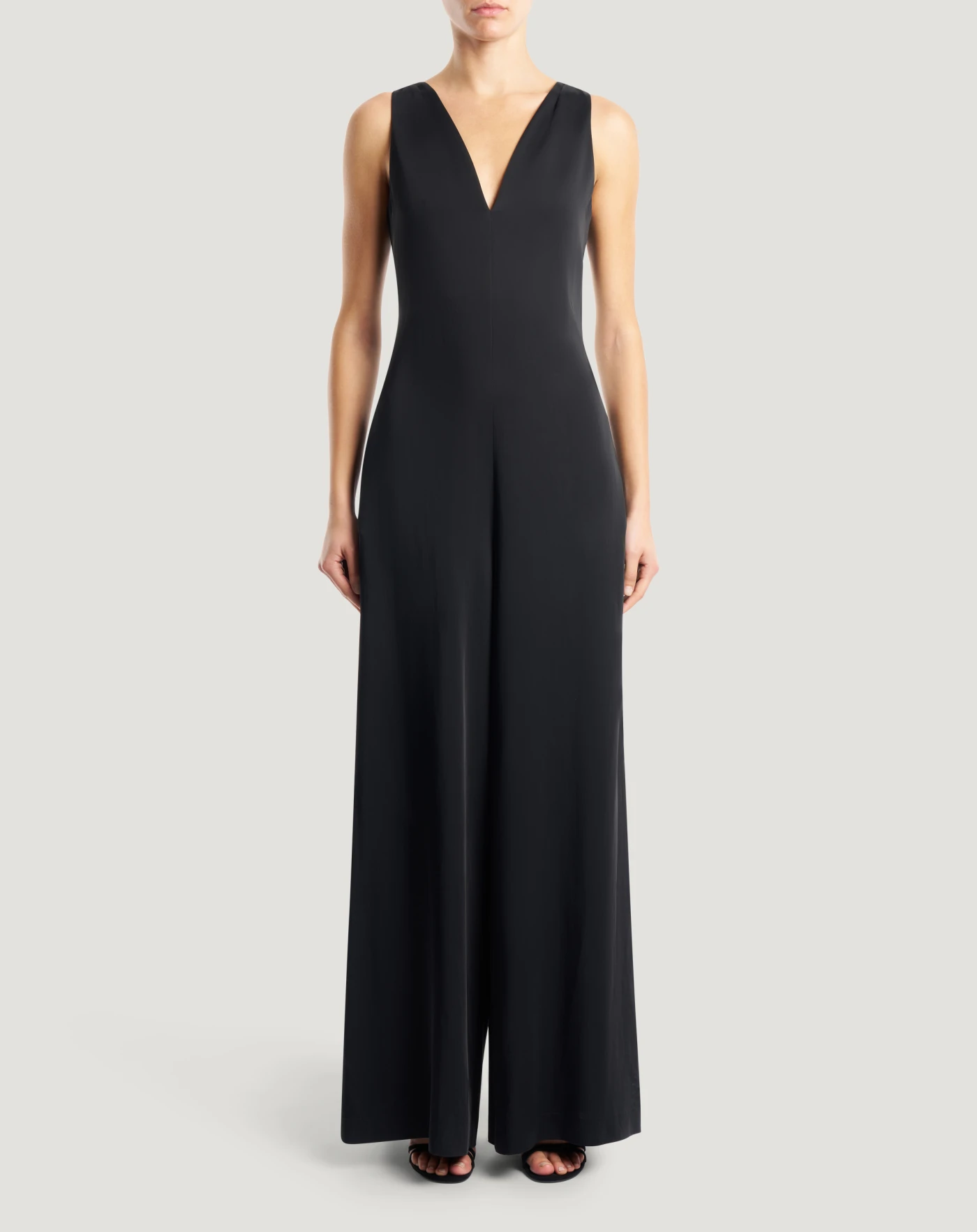 Tuta in cady di cotone e viscosa, un tessuto fresco, molto leggero e sofisticato. Con scollo a V, linea ampia e tasche ai fianchi, sarà la scelta perfetta per un'occasione speciale.