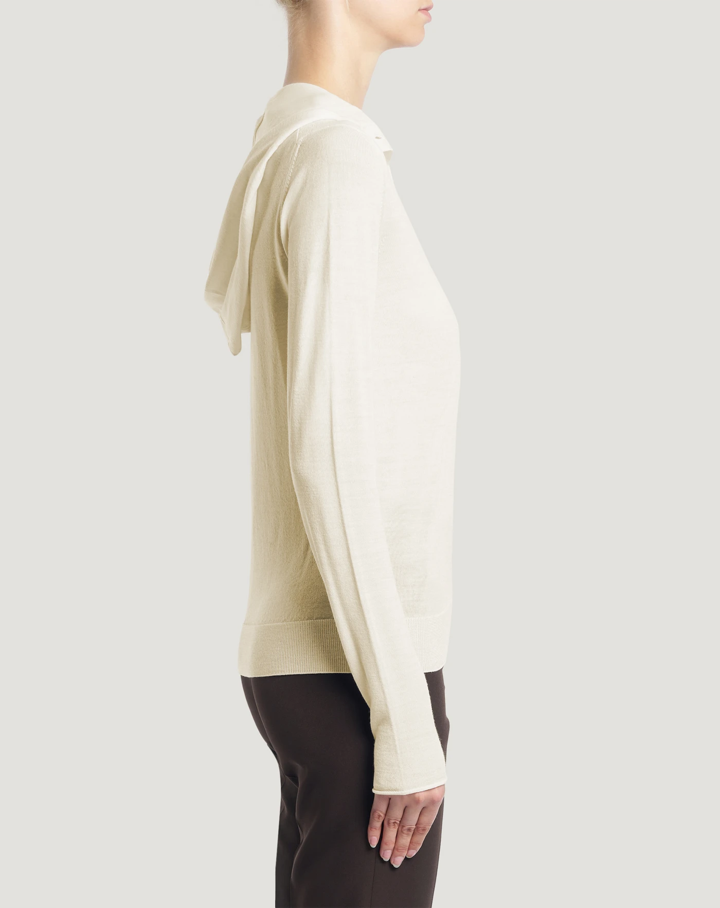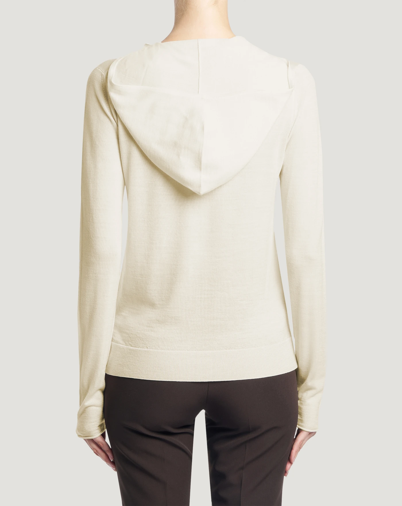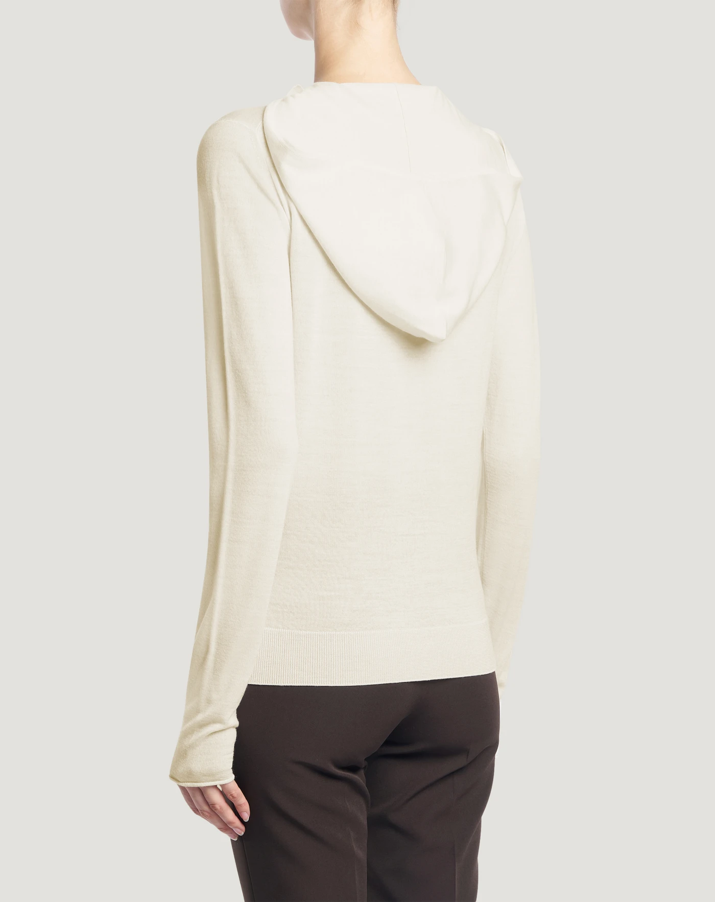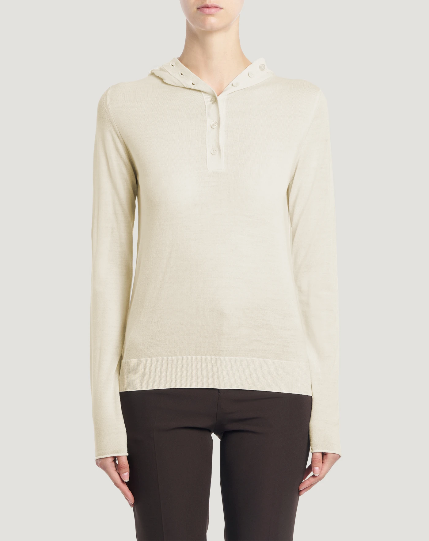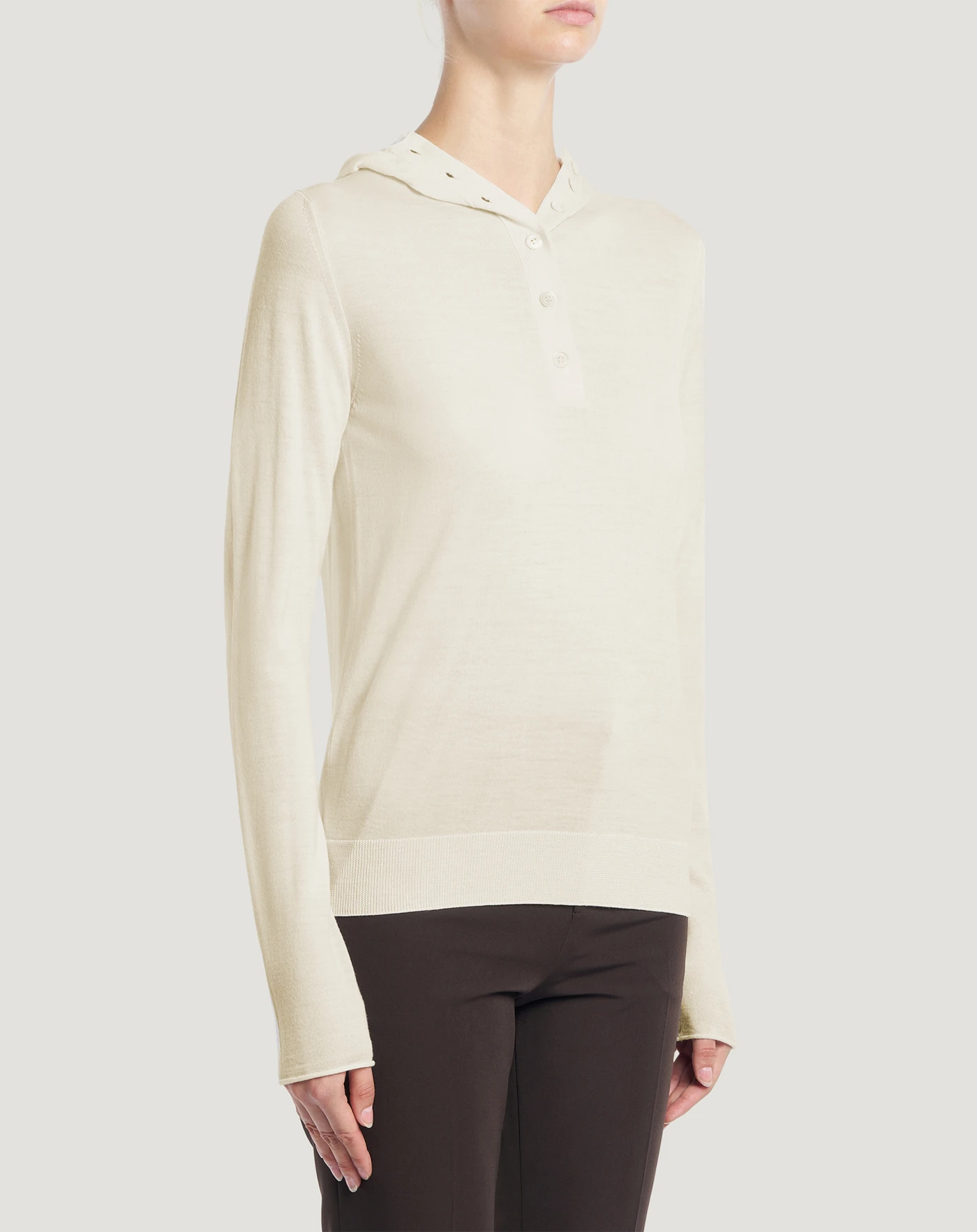 軽やかでとても着心地の良いエクストラファインピュアウール製のセーターです。18ゲージのメリヤス編み仕上げです。レギュラーフィット、ヘンリーネック、フードを組み合わせた、今までにないユニークなデザインのモデルです。ホワイトを選べば、ルックに明るさが加わります。