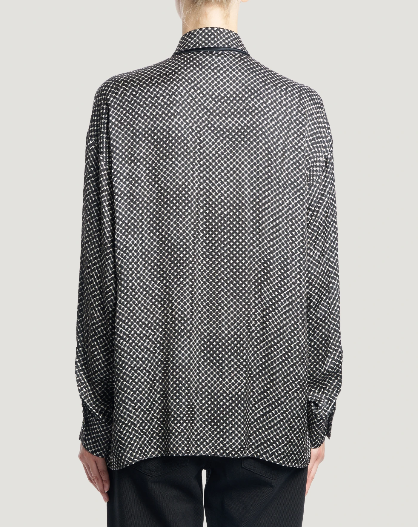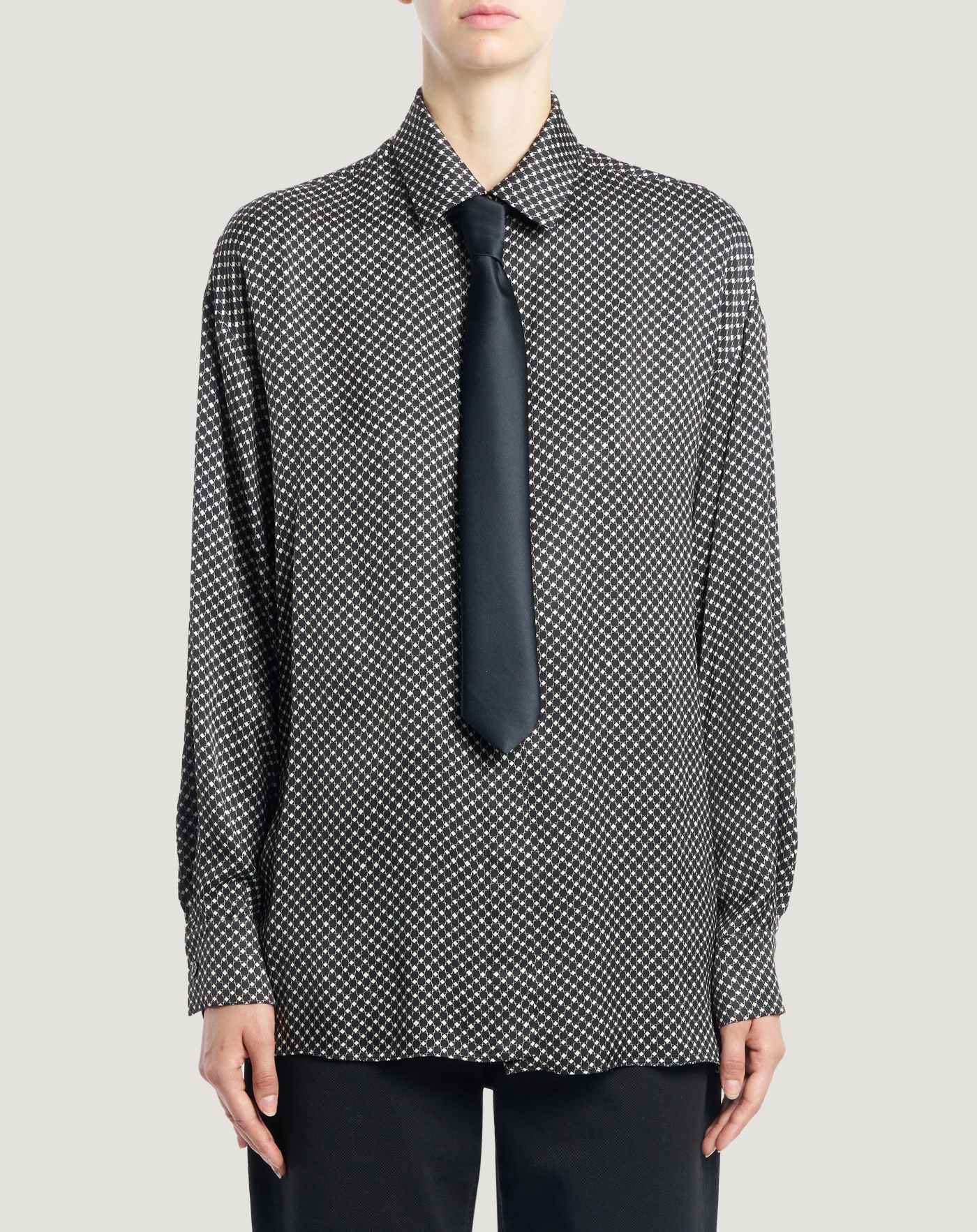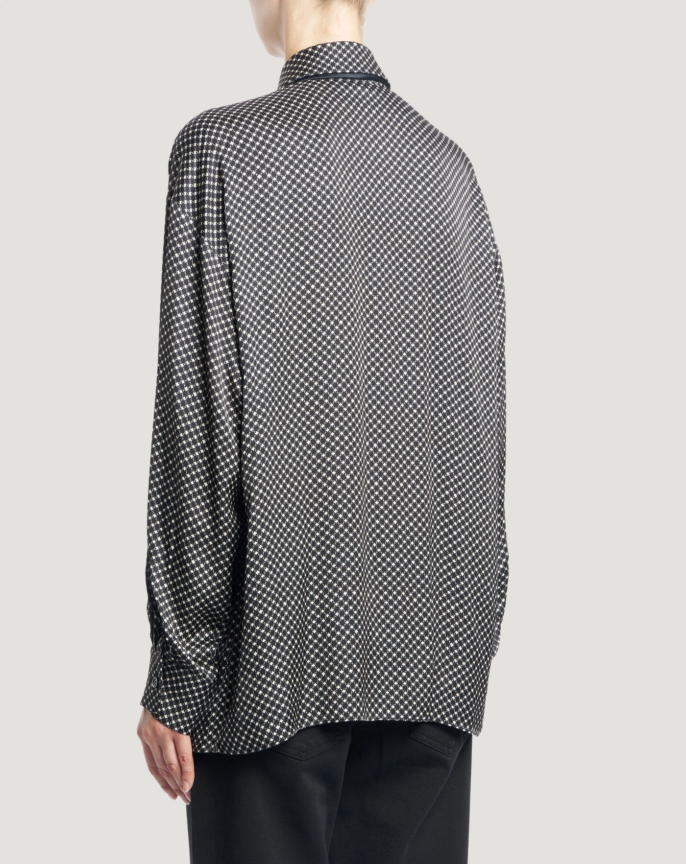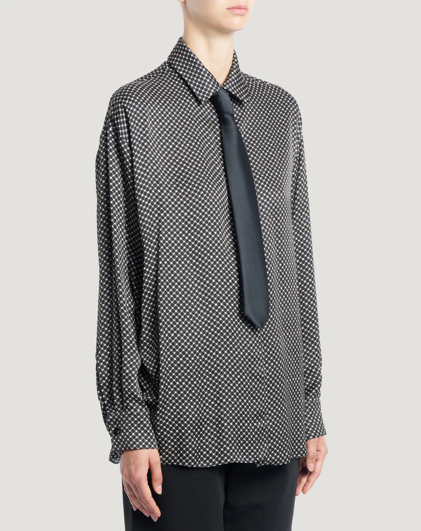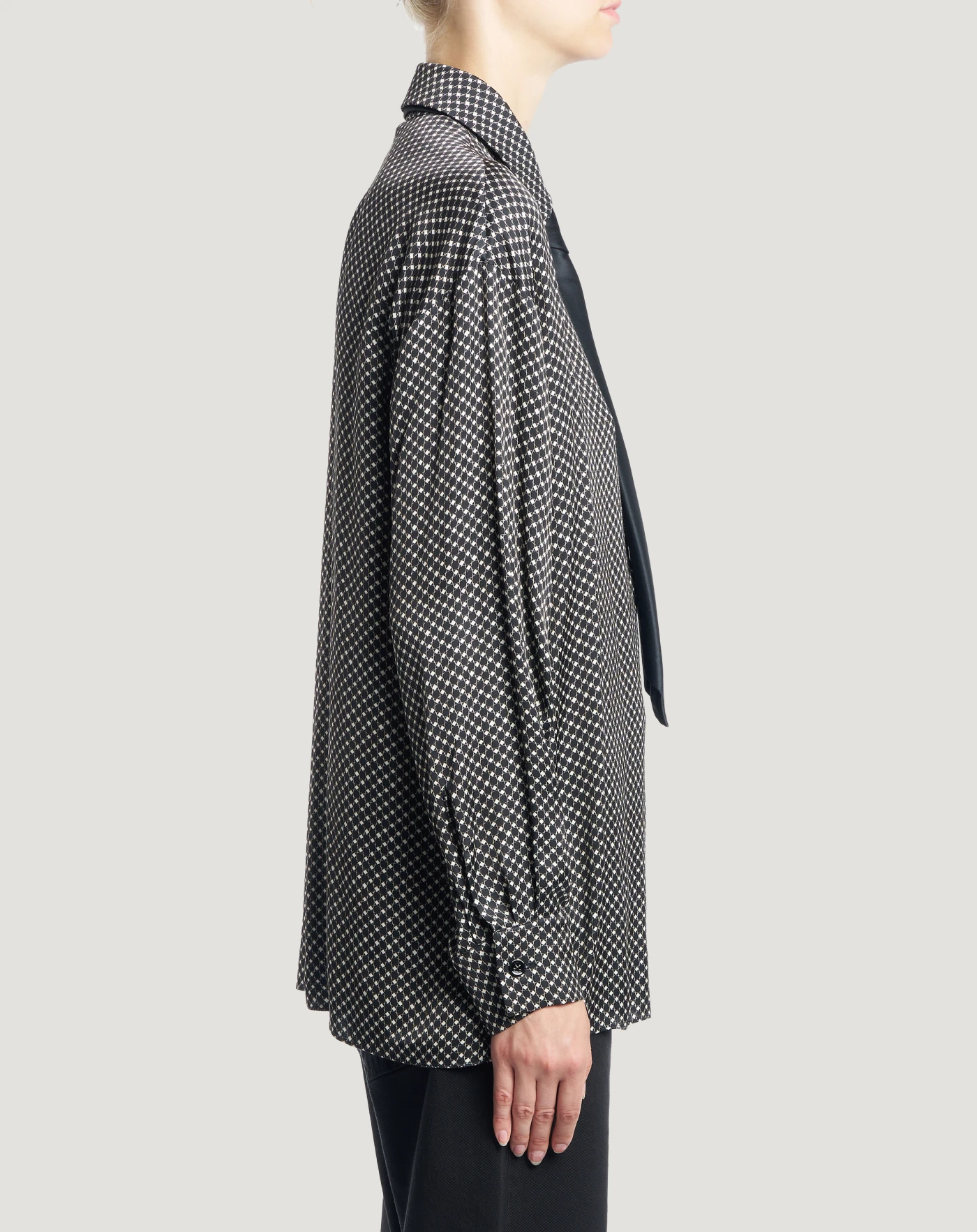 なめらかで上品なレーヨンサテン生地を使用したシャツです。全体に描かれた幾何学模様のプリントが、スタイルに躍動感を与えます。マスキュリンなテイストのデザインにサッシュをあしらった、個性的で洗練されたモデルです。