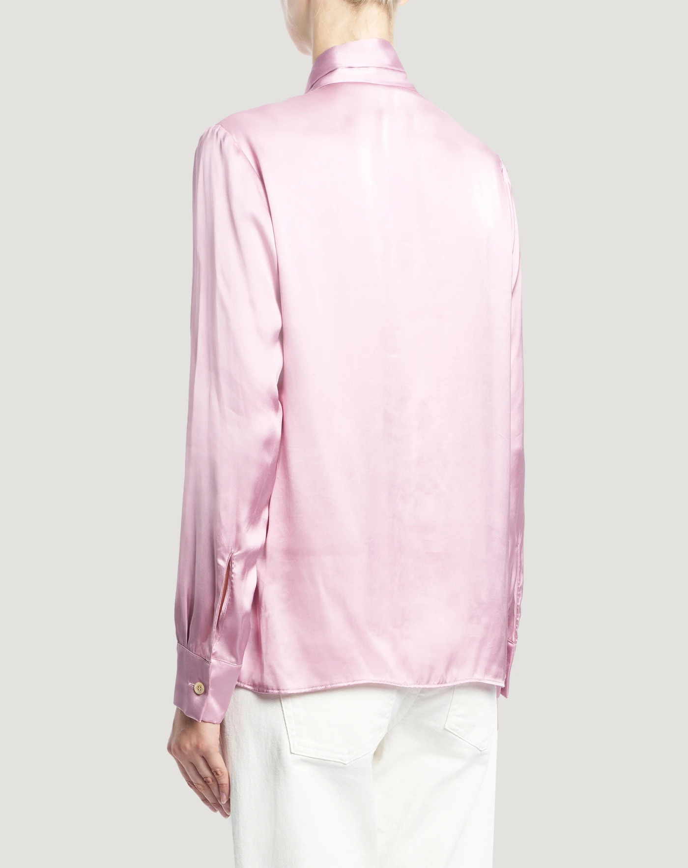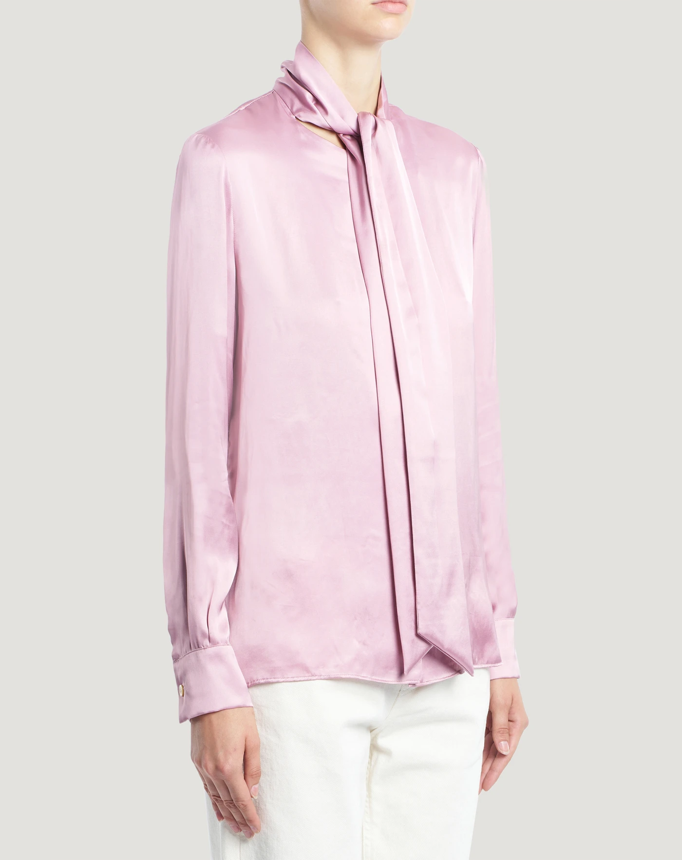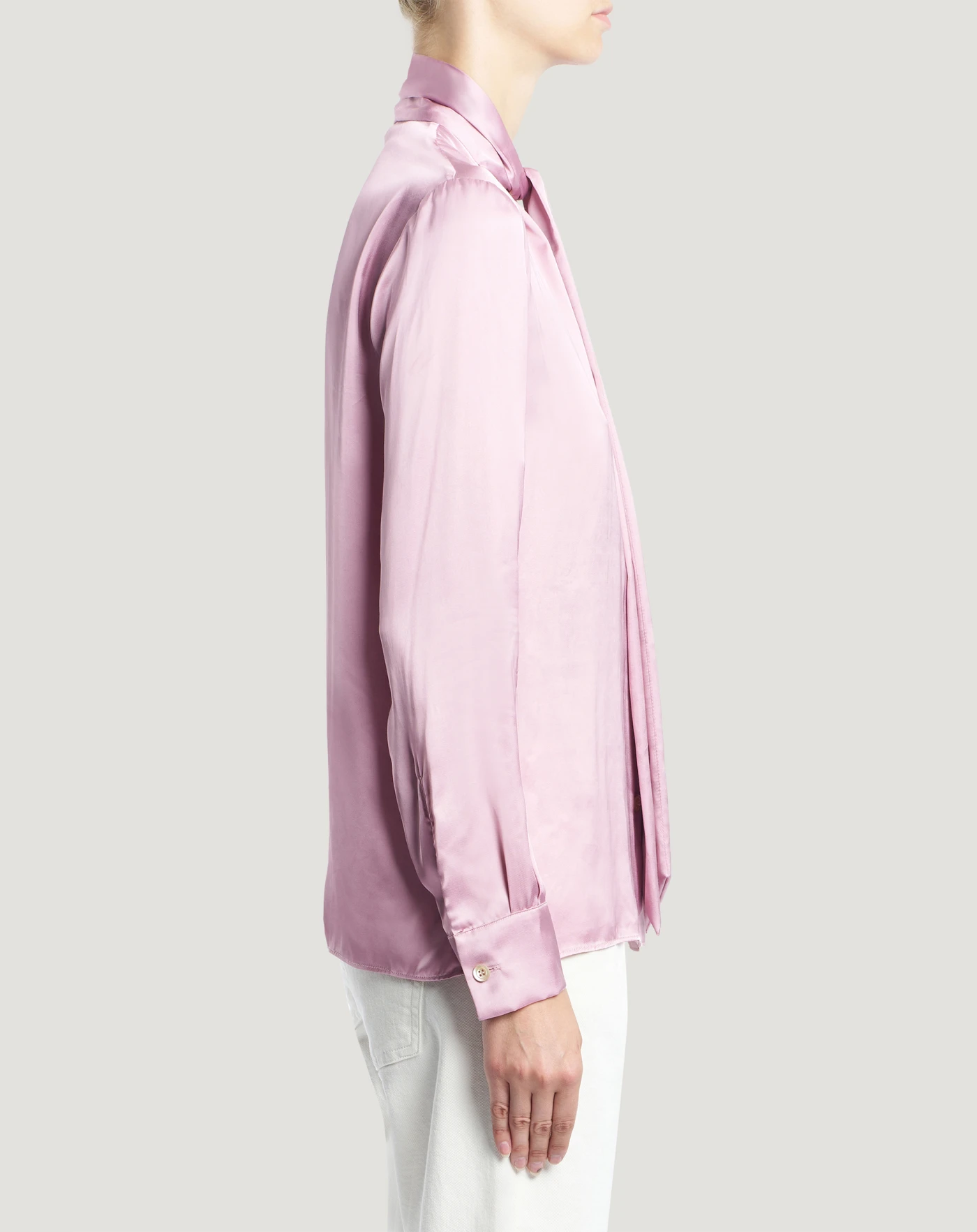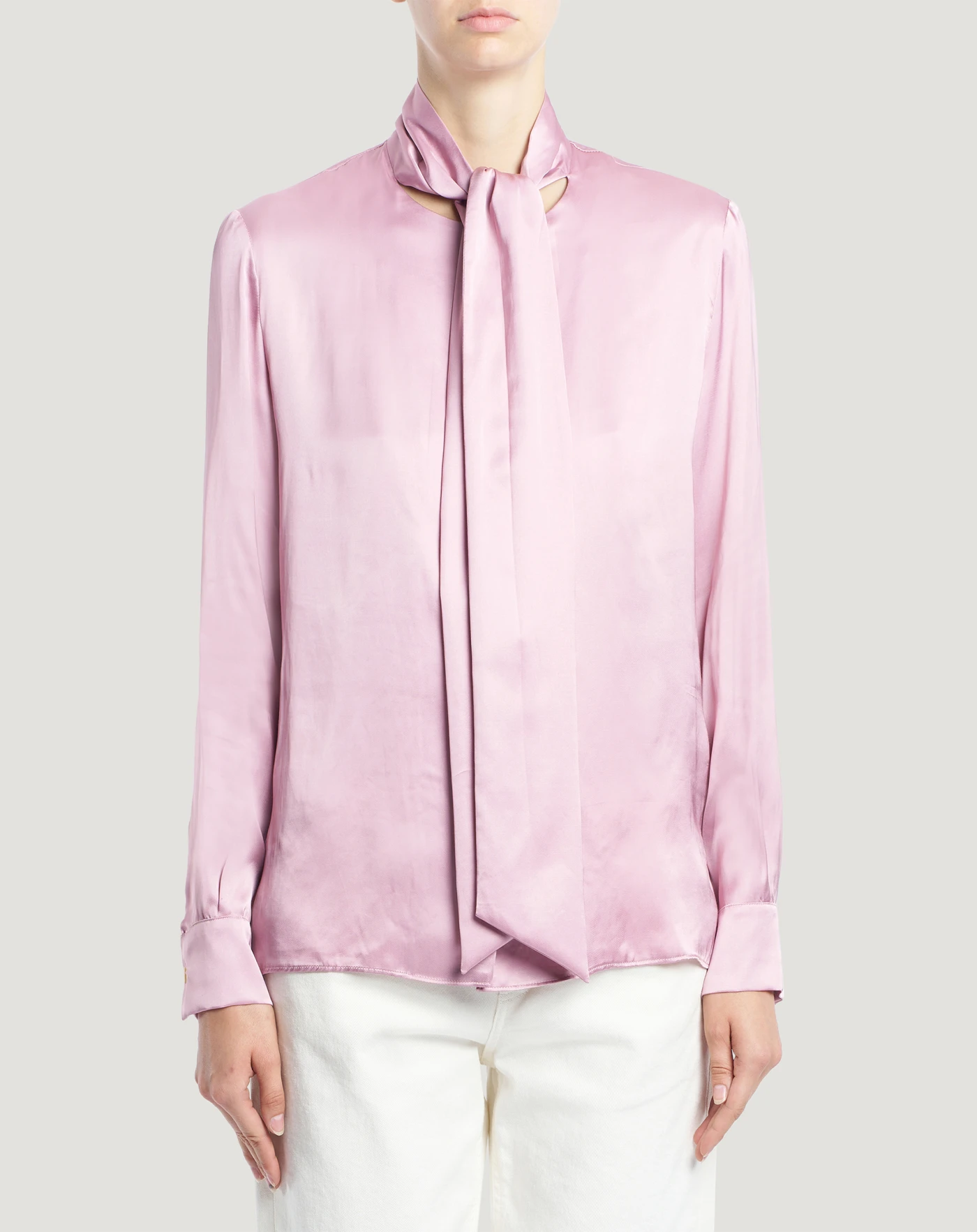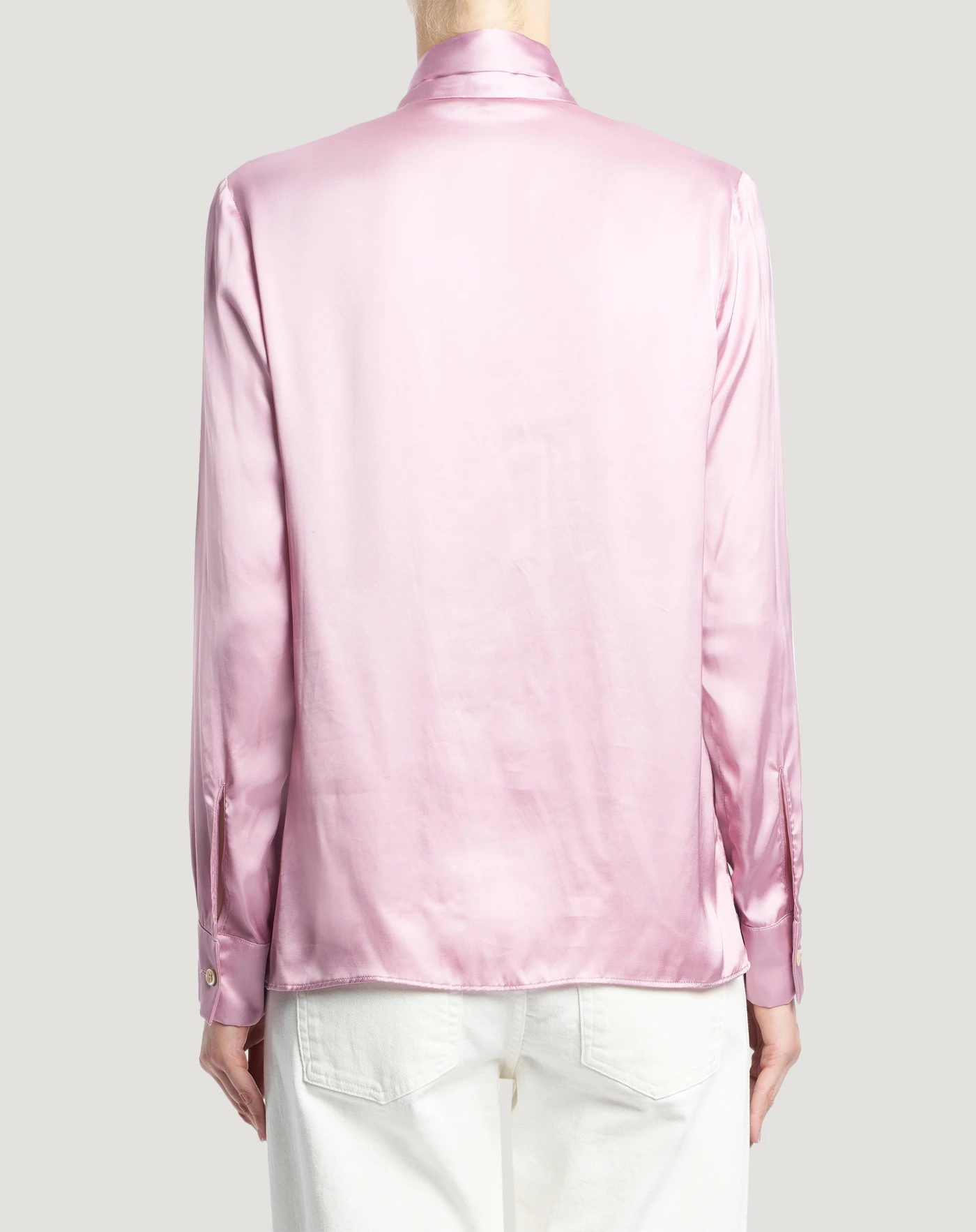 スーパーライトレーヨンのサテン生地で仕上げたブラウスです。光沢のある洗練された生地は着心地抜群です。ストレートなシルエットにサッシュをあしらった前開きのデザインです。アンティークピンクの色合いは、あらゆるルックにフェミニンな魅力を添えてくれます。