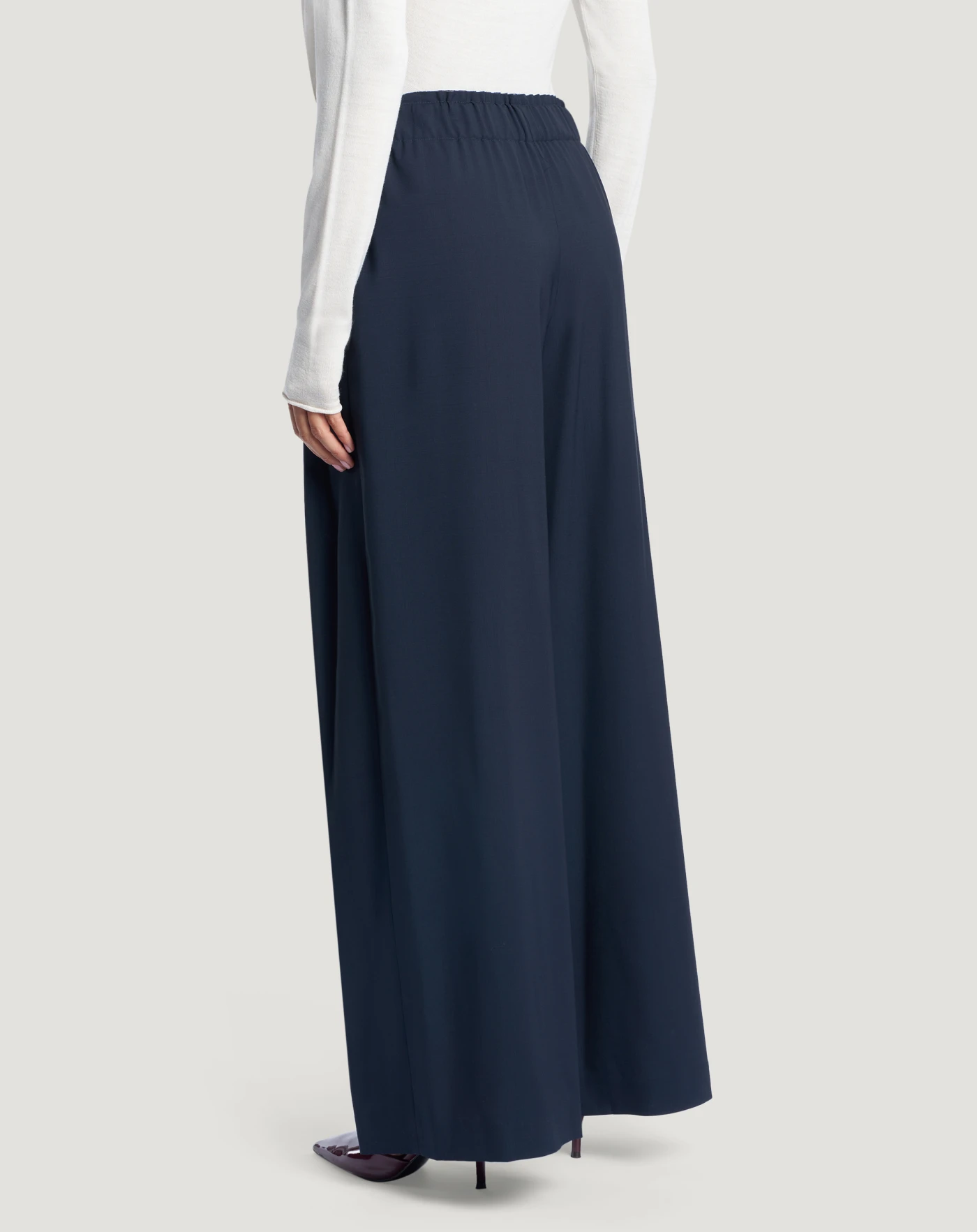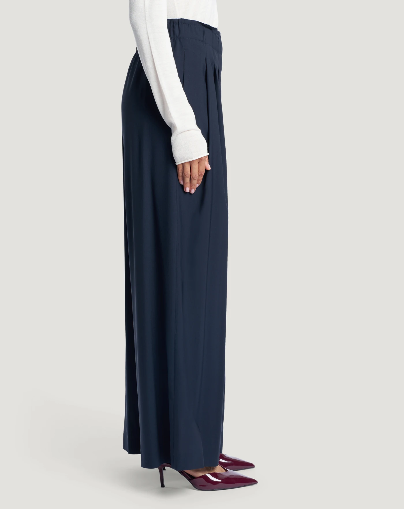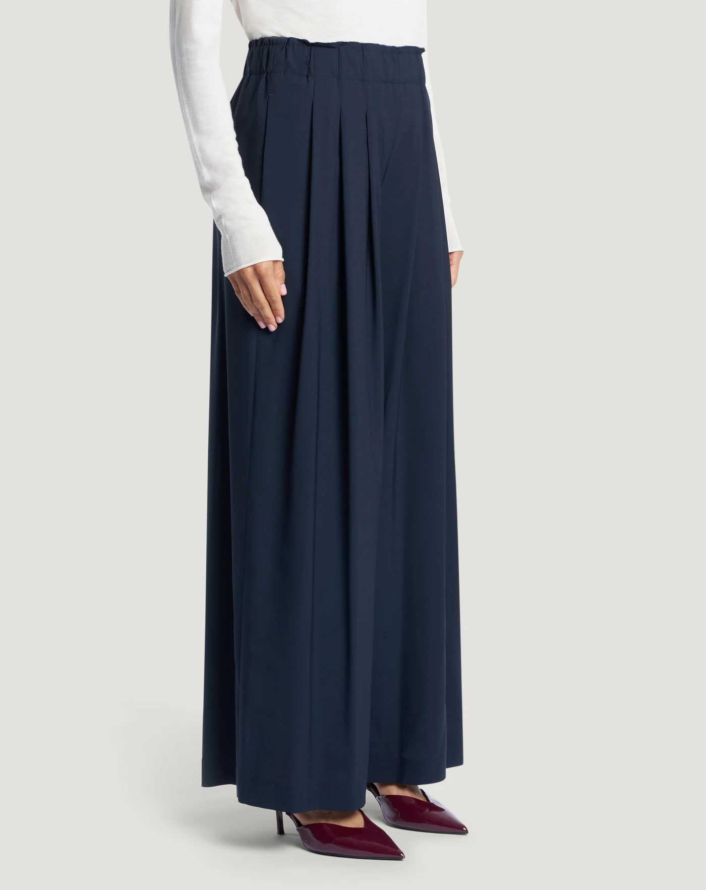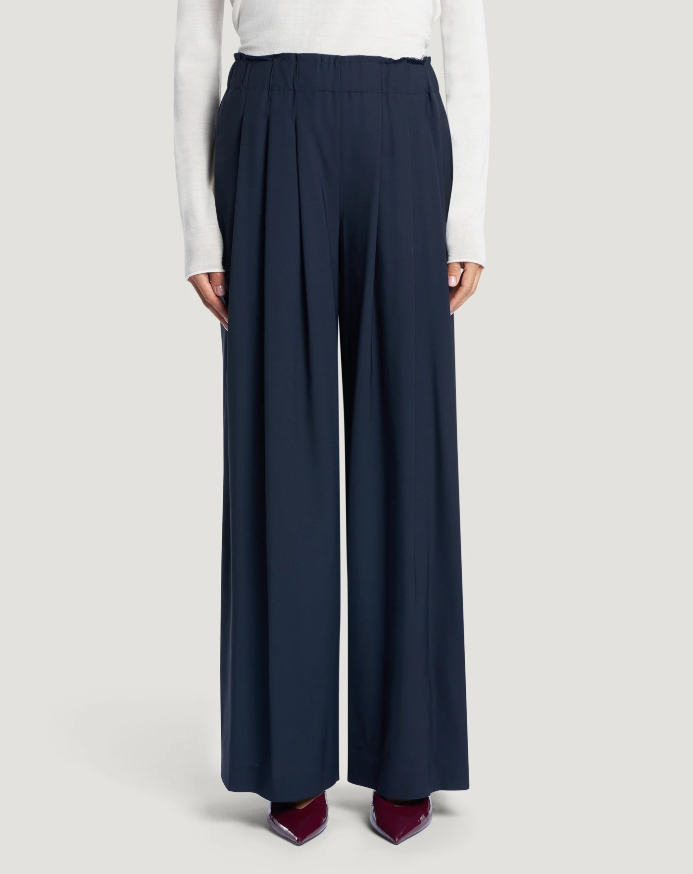 暖かく軽量で、テーラードスタイルの魅力が香る、スーパーライトピュアウール製のパンツです。腰回りにタックが入り、ウエストにゴムを加えた、はき心地抜群のゆったりとしたシルエットです。ブルーの色合いは、スタイルにダイナミックなタッチを加えるのに最適です。